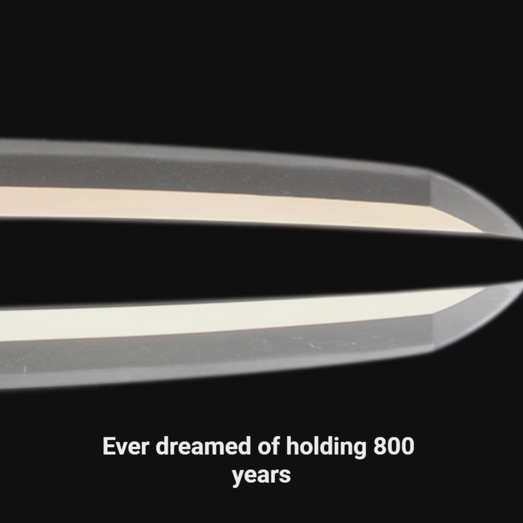 The overall preservation of the blade is remarkably sound, hardly believable for a Kamakura-period piece, befitting its Juyo certification. The jigane clearly shows itame mixed with mokume and jinie adheres well, displaying the characteristic utsu-ri pattern of Bizen swords. The hamon features suguha with some Ko-gunome mixed in, showing sunagashi and kinsuji. The nakago is inscribed with the name Yasuhiro.