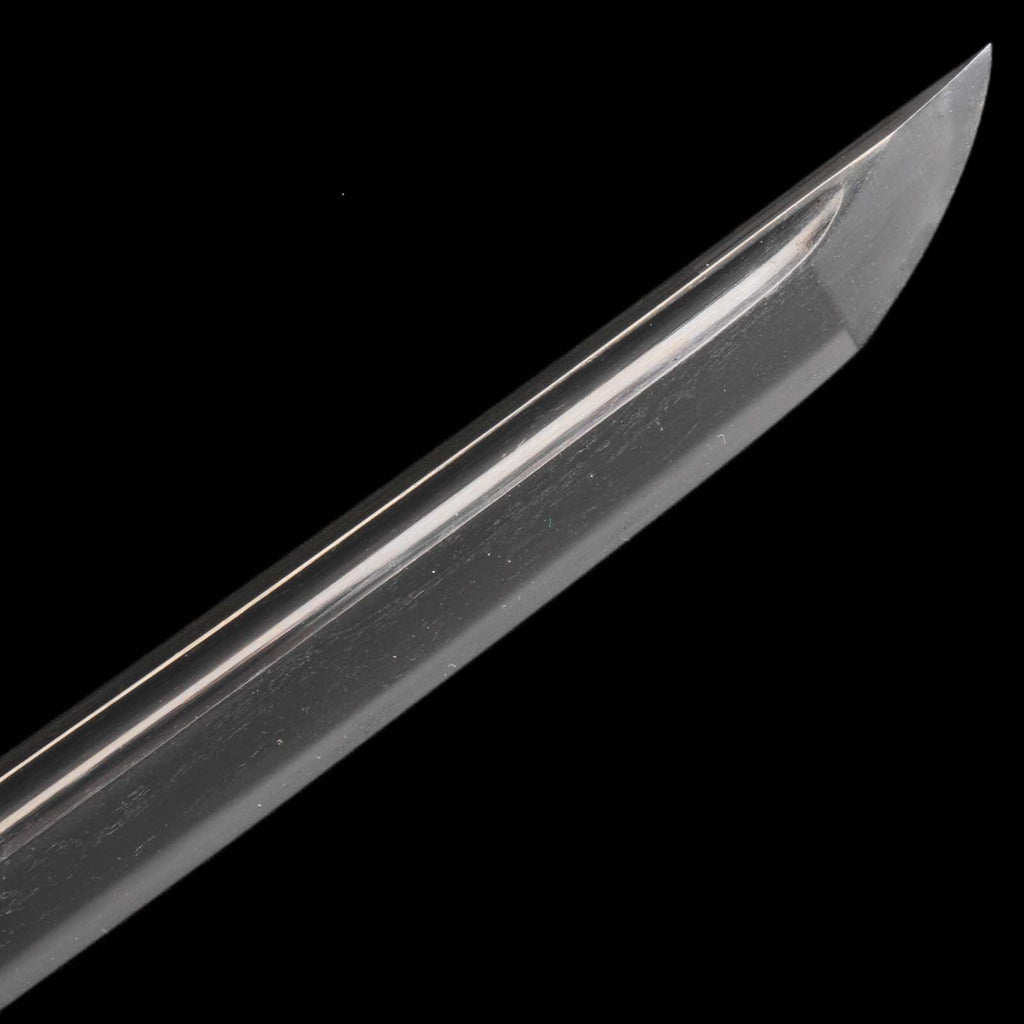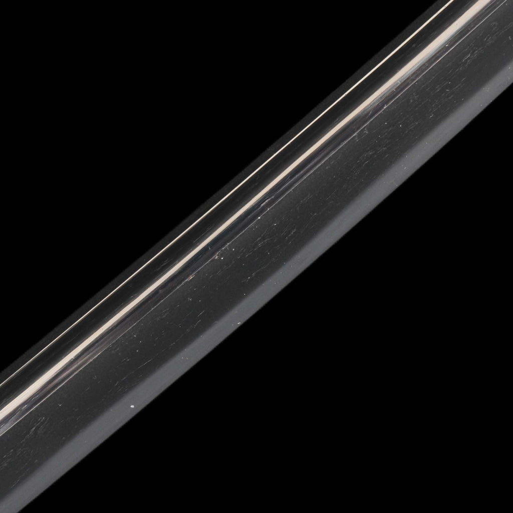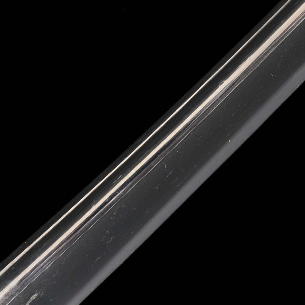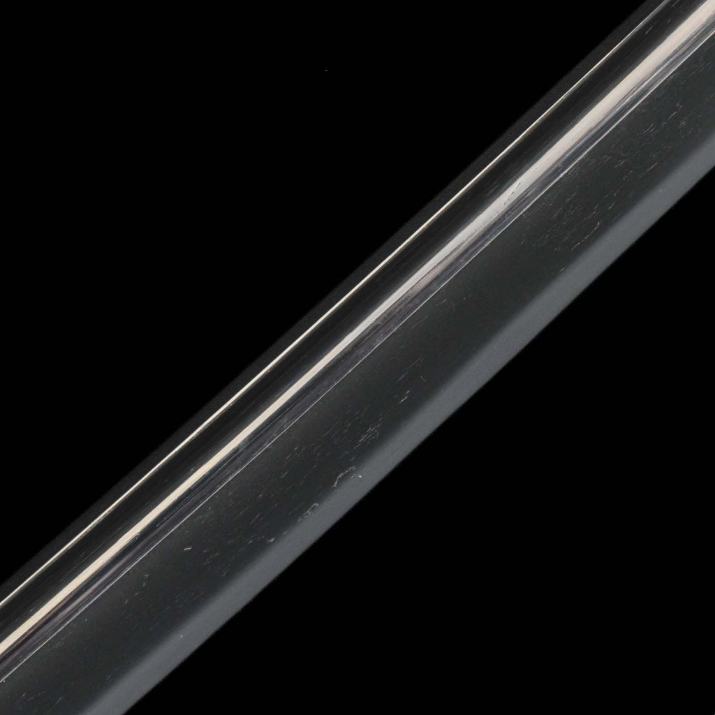 The blade is in excellent condition and has been sharpened throughout. It is a very sound blade with zero flaws such as nicks, rust, or chips. Beautifully engraved grooves adorn both sides of the blade. The jigane exhibits itame hada with suguha hamon that is a tight, sharp. The ha shows sunagashi and kinsuji patterns. The nakago is inscribed with the name Yoshinori.