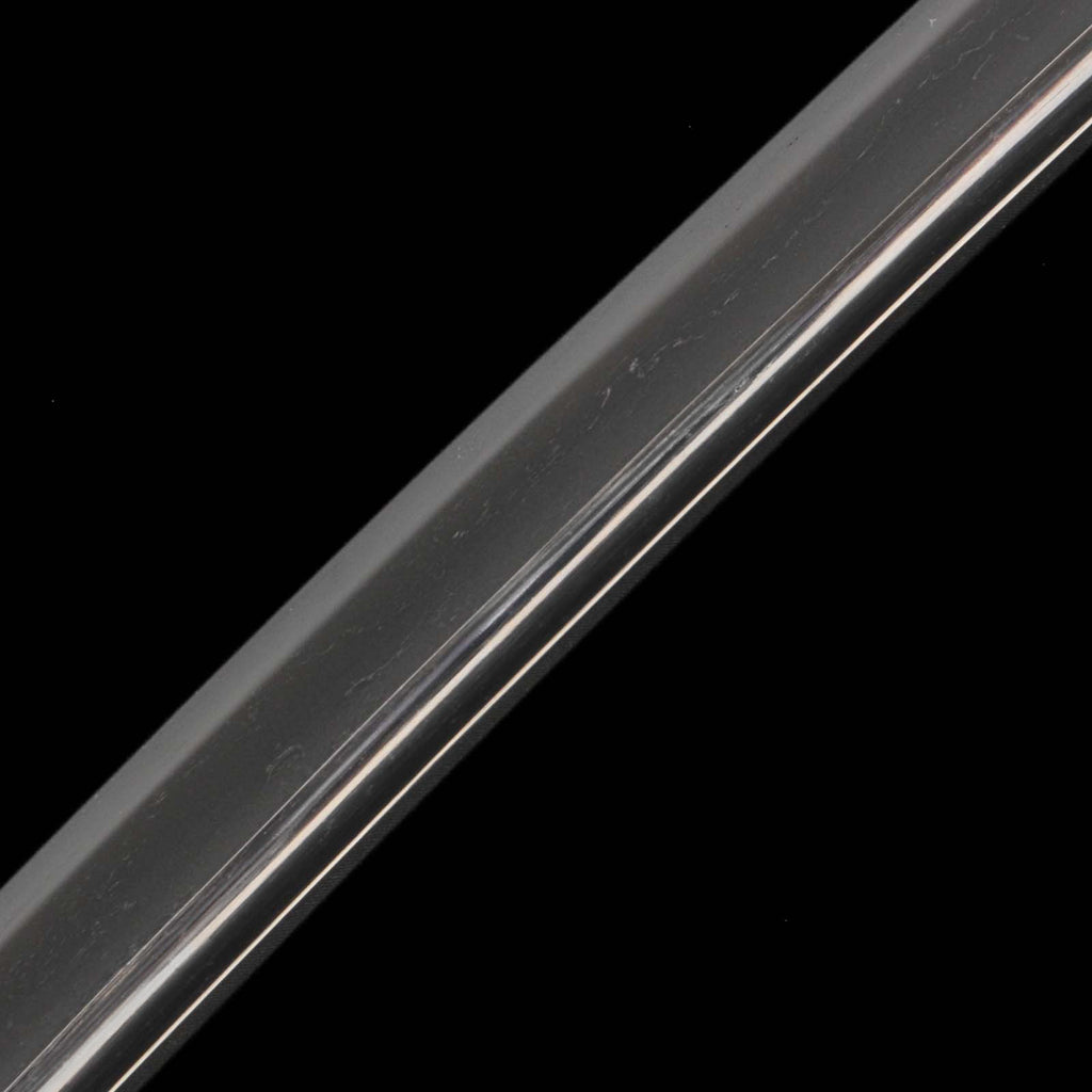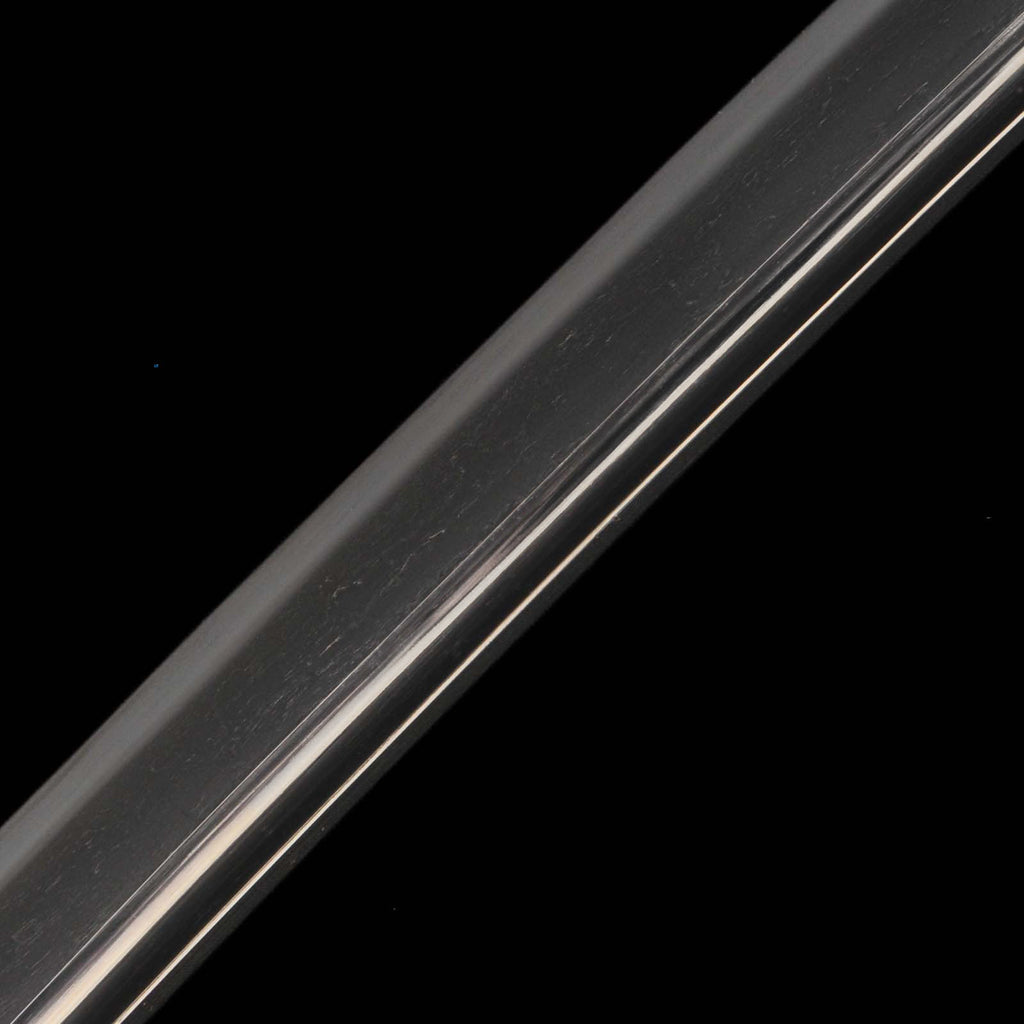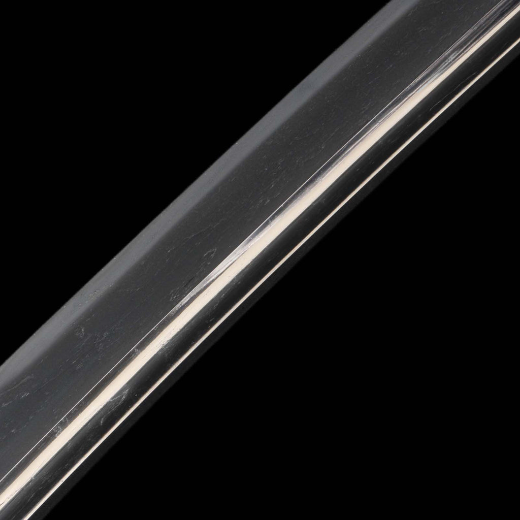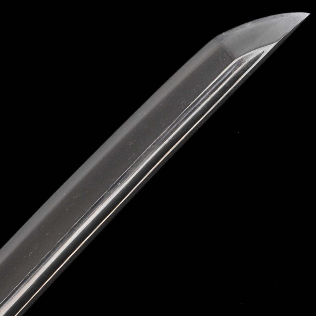 The blade is in excellent condition and has been sharpened throughout. It is a very sound blade with zero flaws such as nicks, rust, or chips. Beautifully engraved grooves adorn both sides of the blade. The jigane exhibits itame hada with suguha hamon that is a tight, sharp. The ha shows sunagashi and kinsuji patterns. The nakago is inscribed with the name Yoshinori.