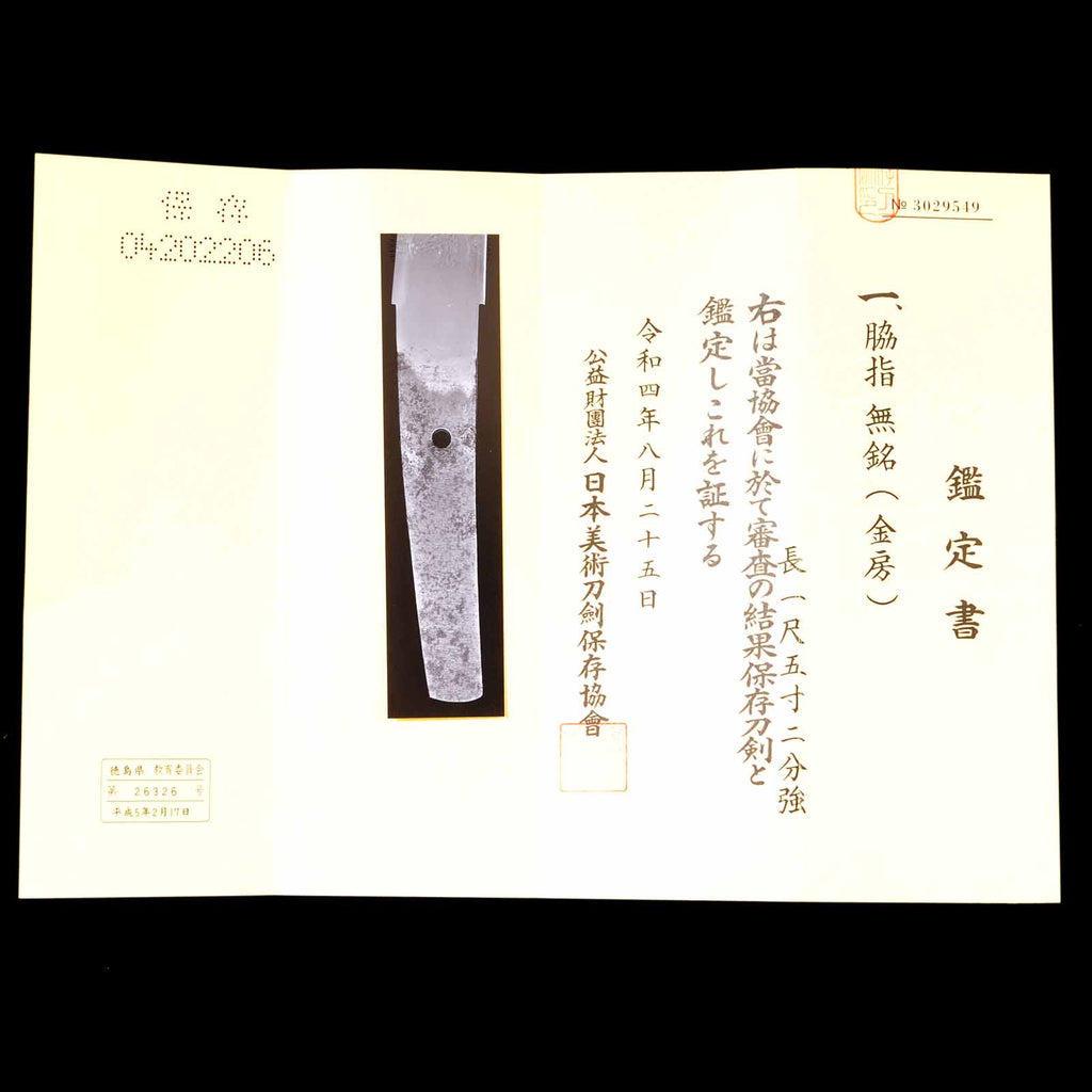 Although the nakago bears no signature, in August 2022, the Society for the Preservation of Japanese Art Swords authenticated this work as a Kanefusa piece and issued a Hozon certificate. Kanefusa is said to have originated with Masanao during the Daiei period of the Muromachi era. Works from the Kanefusa school possess a unique style, revealing elements of Yamato-den, Bizen-den, and Mino-den, creating a mysterious charm that makes them highly popular. This wakizashi also embodies that charm.