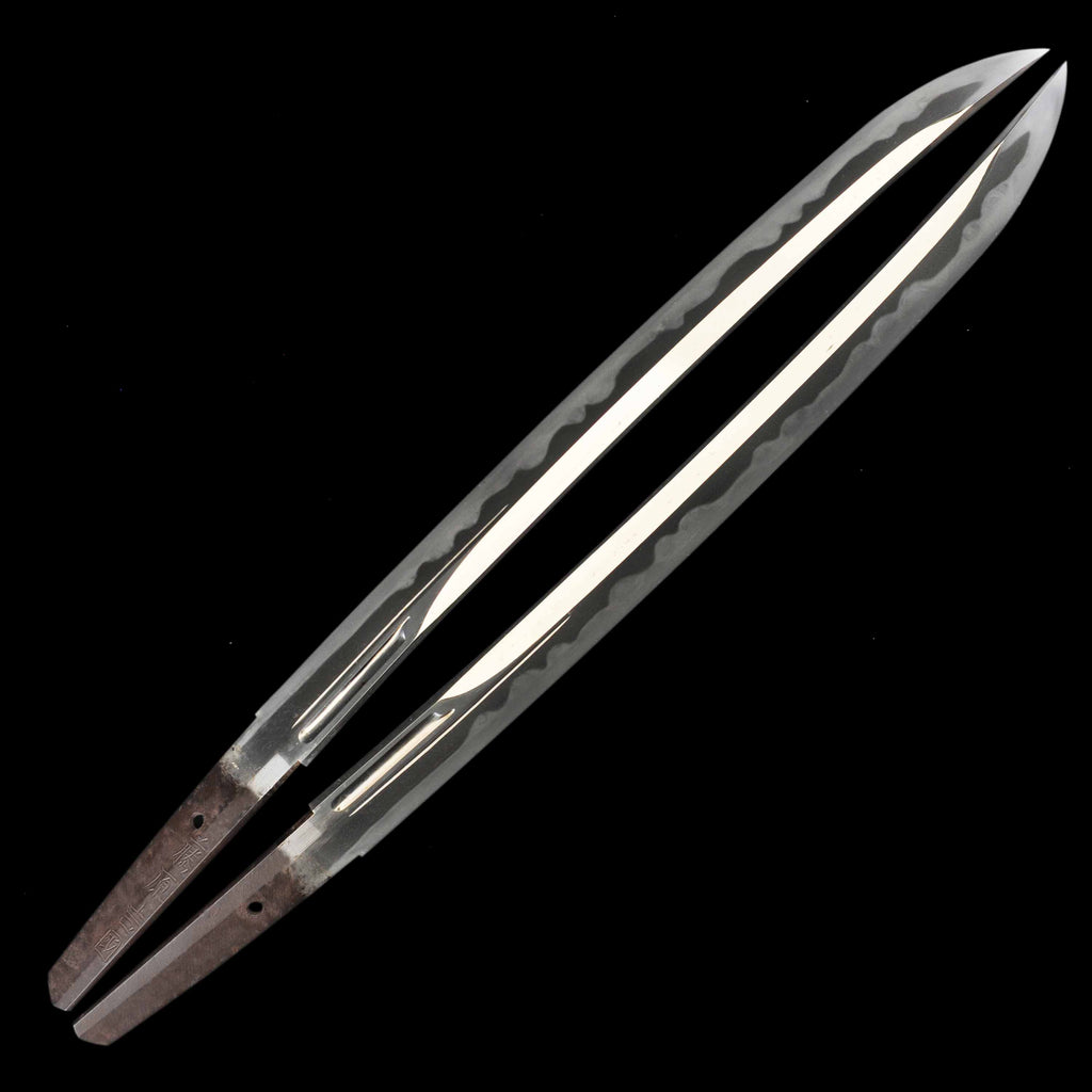 Though categorized as a wakizashi, it is effectively an Unokubi-style o-tanto. The blade is in excellent condition, showing overall old polish but remaining virtually flawless. The jigane features itame mixed with mokume, with well-defined jigane and a clear yubashiri. The hamon exhibits unevenly spaced gunome, resulting in a very bright and dynamic overall hamon. It is an Unokubi-zukumi with bohi. The nakago is inscribed with the name Fujiwara Yoshikuni.