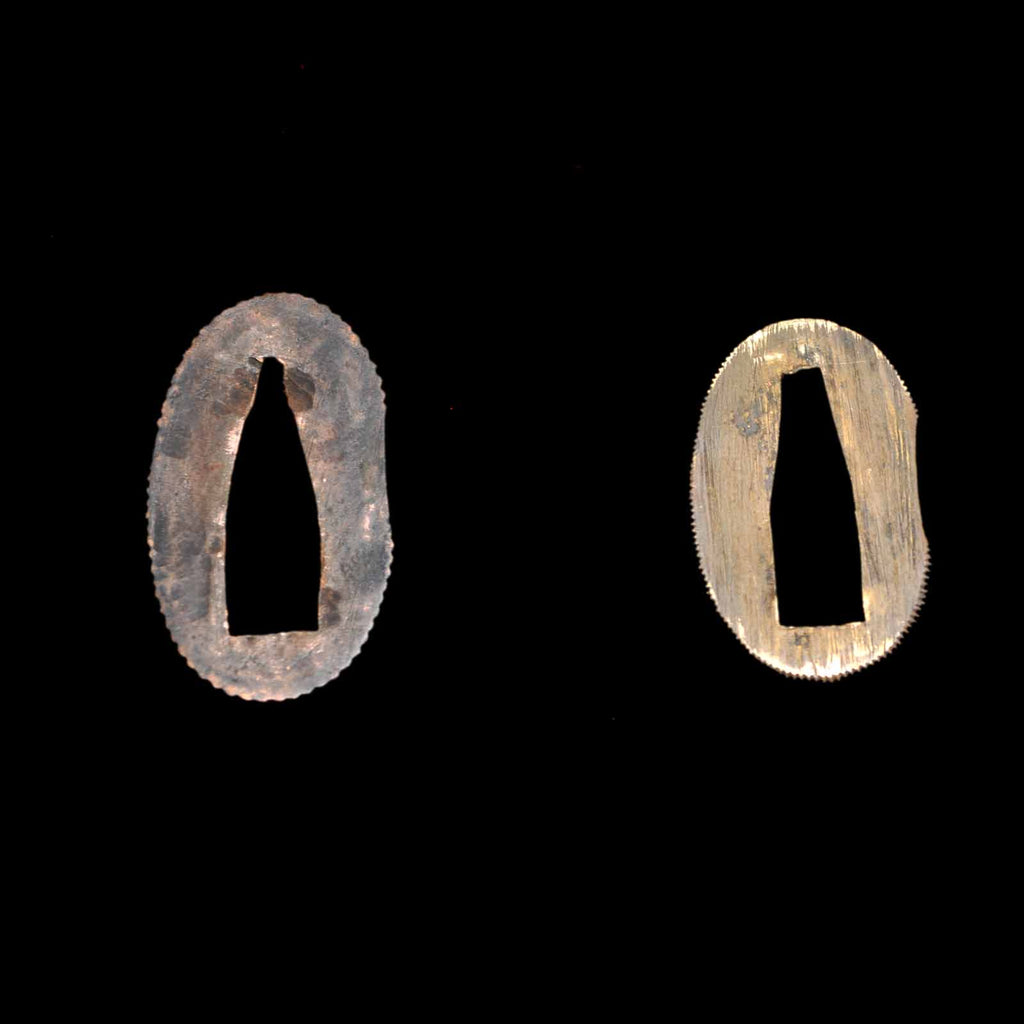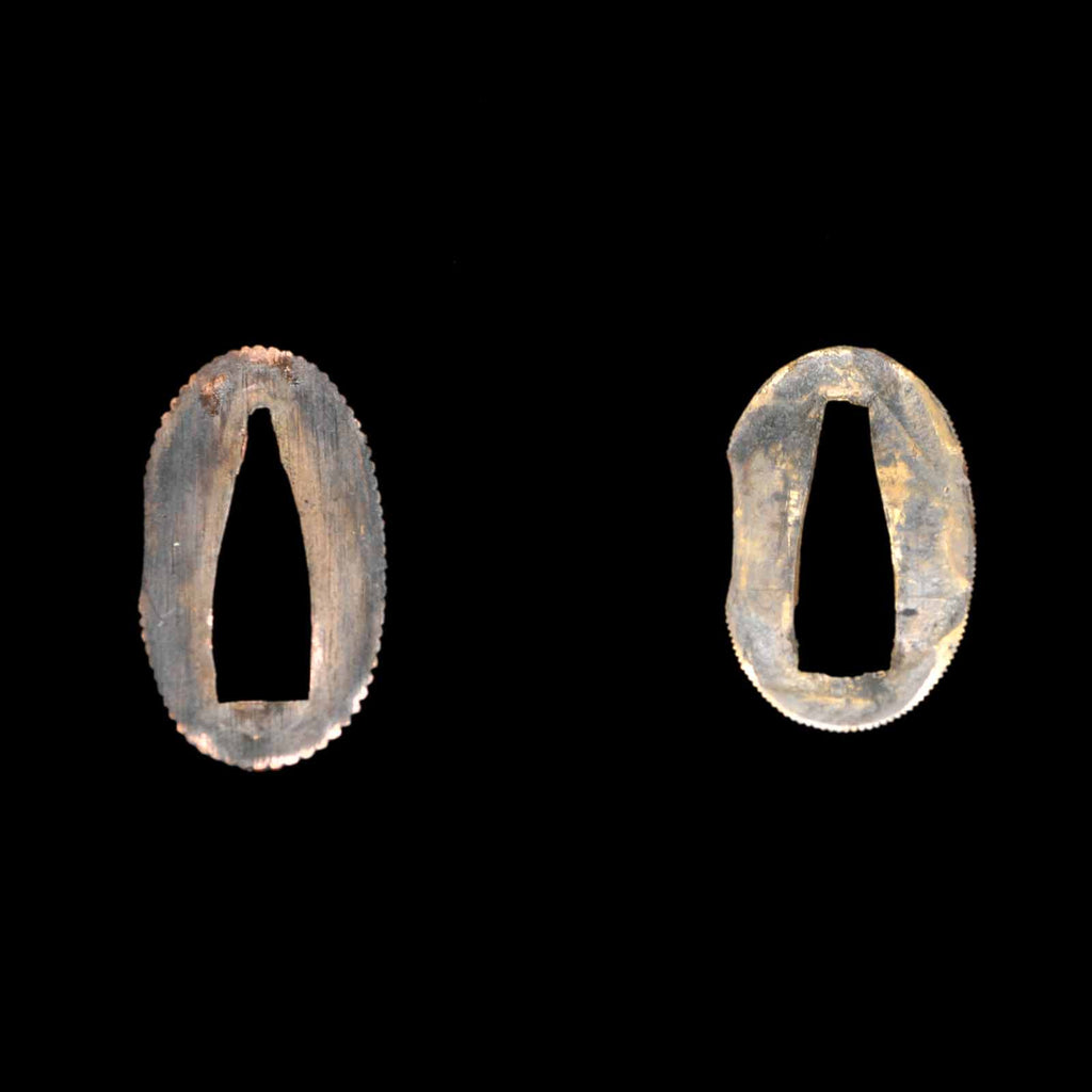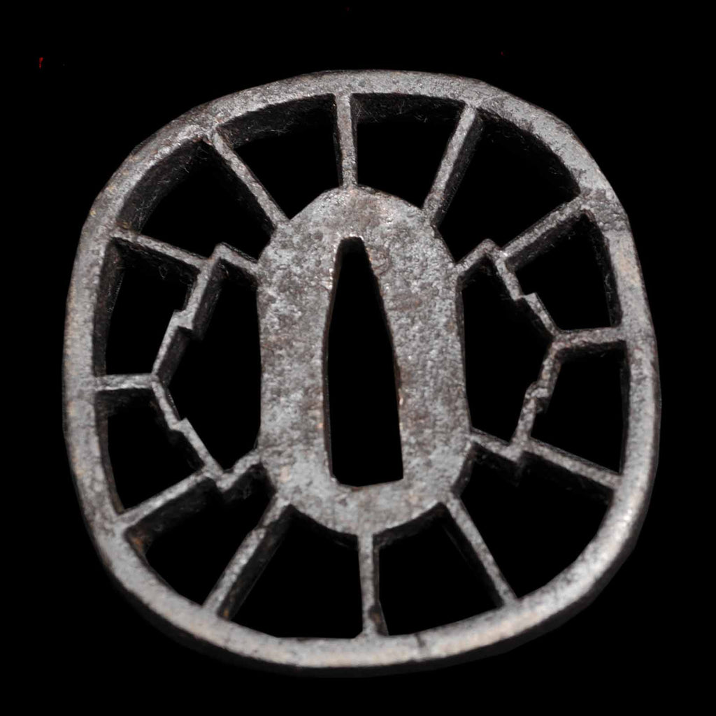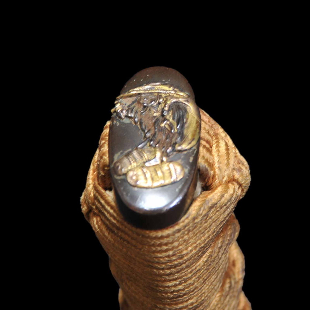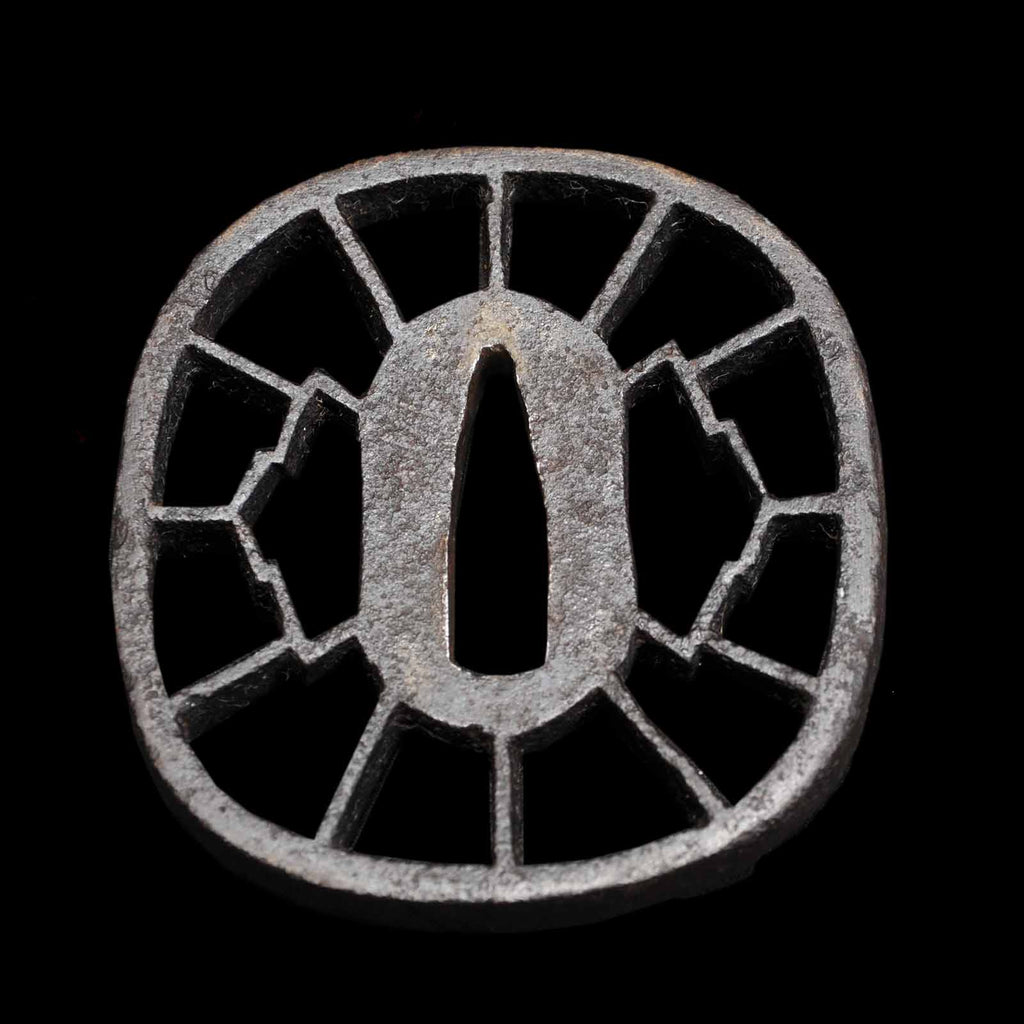 The sword is very well preserved with no flaws, dents, or spills. The hada is well packed with itame, and the nie is well tightened in the low gnome hamon. The ha has some ashi in places, and the boshi is omaru. The tsuba is fitted with an old-fashioned sukashi-type, and the fuchi kashira and menuki are of the period. The tsuka cord is slightly discolored in some areas due to evidence of use in iaido. If you wish to have it rewrapped with a new cord, we will do so free of charge, so please mention it in the comments section of your order. The scabbard fits snugly over the blade, but there are some areas where the lacquer has peeled off around the Koiguchi. The sword is heavy enough for its length and is ideal for batto or iai.