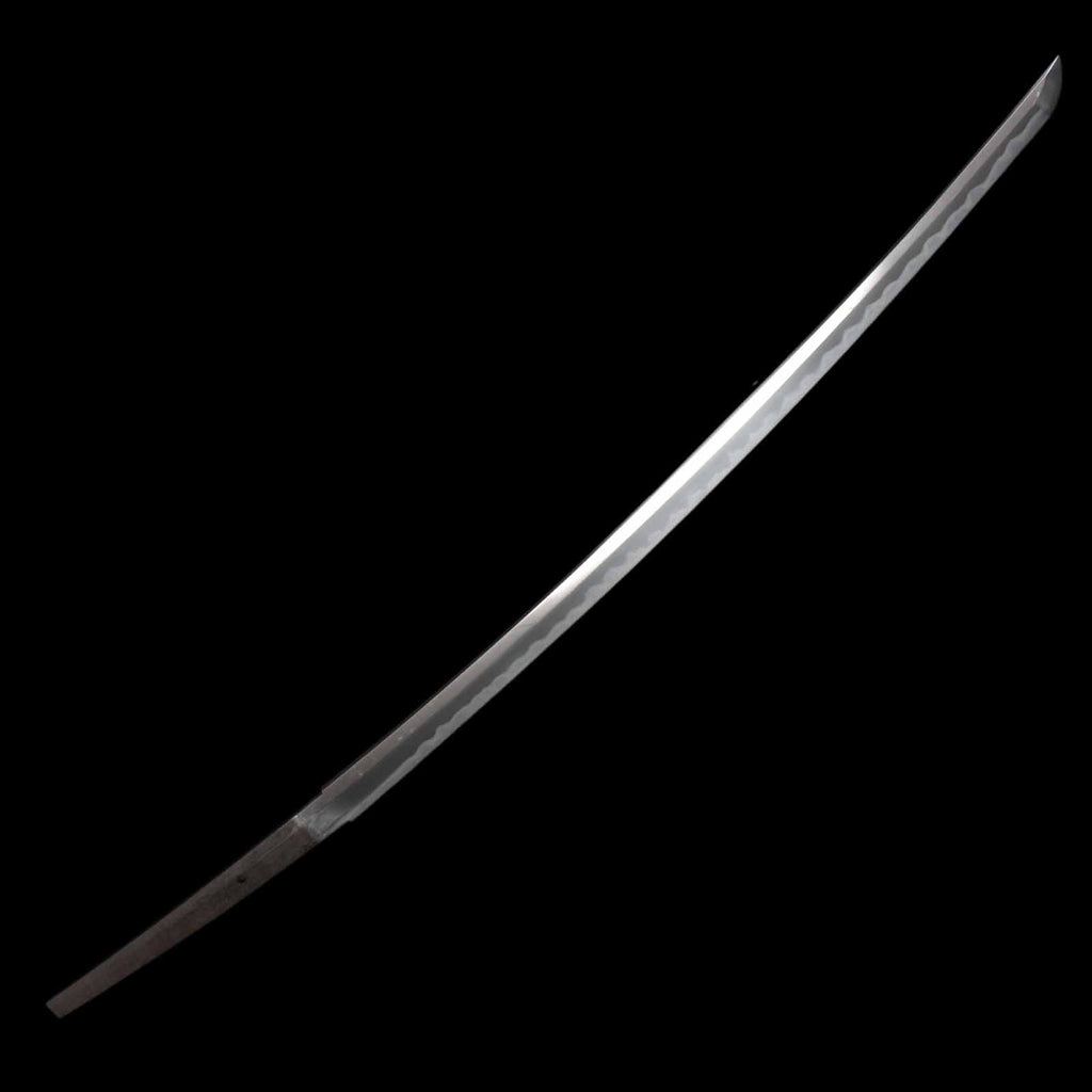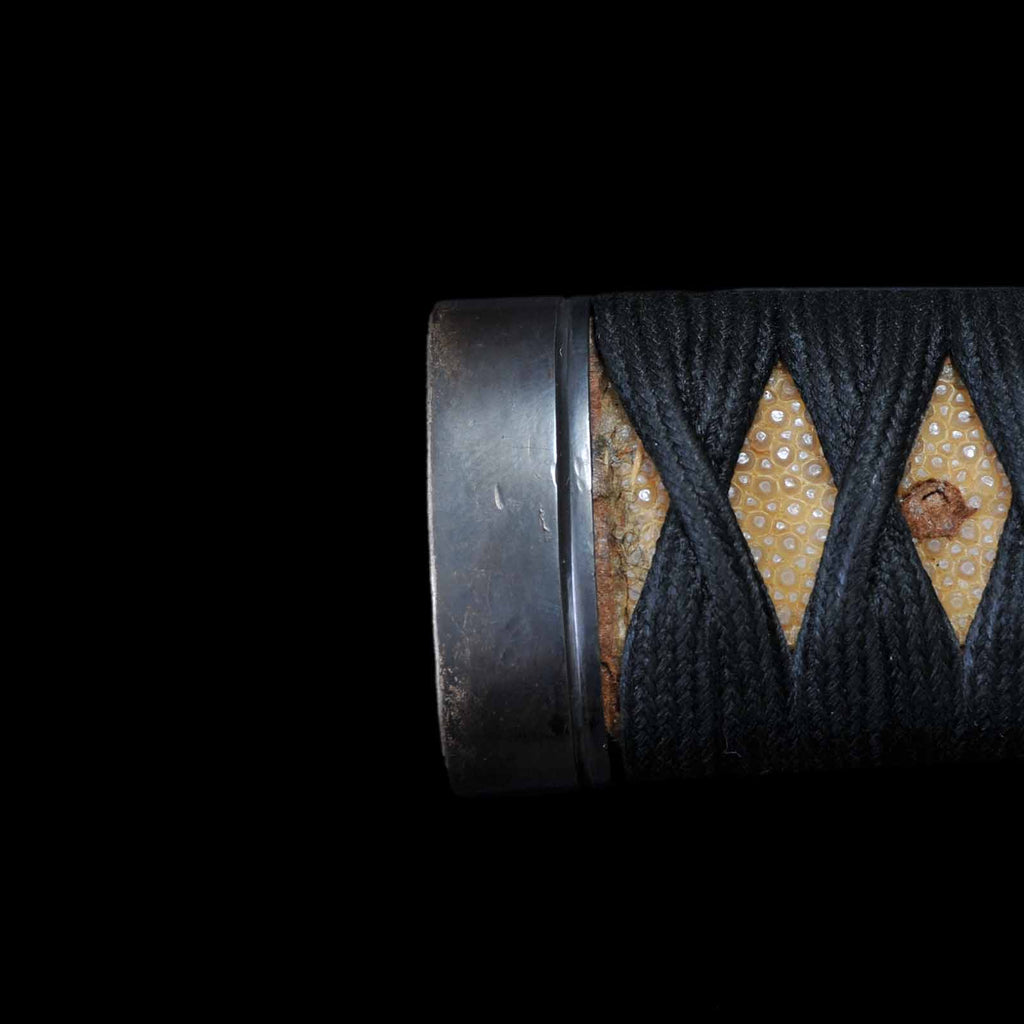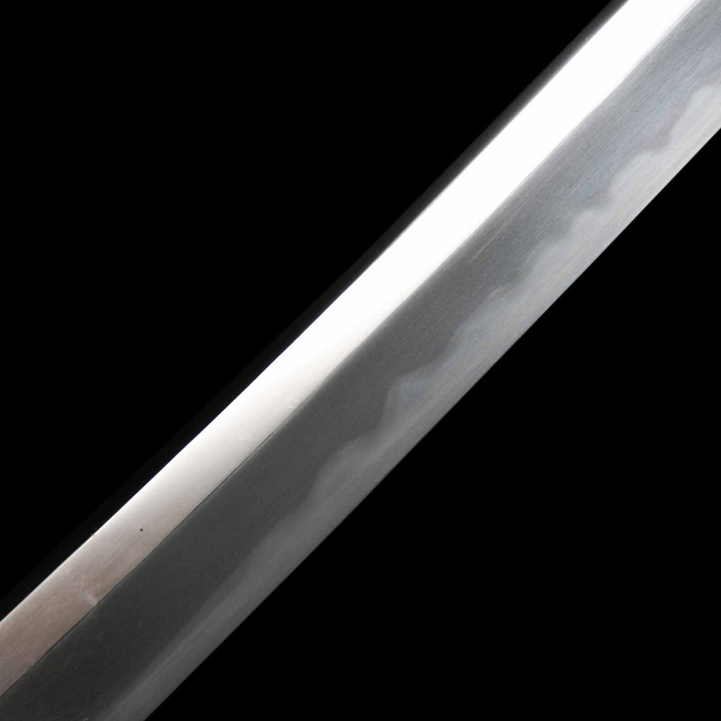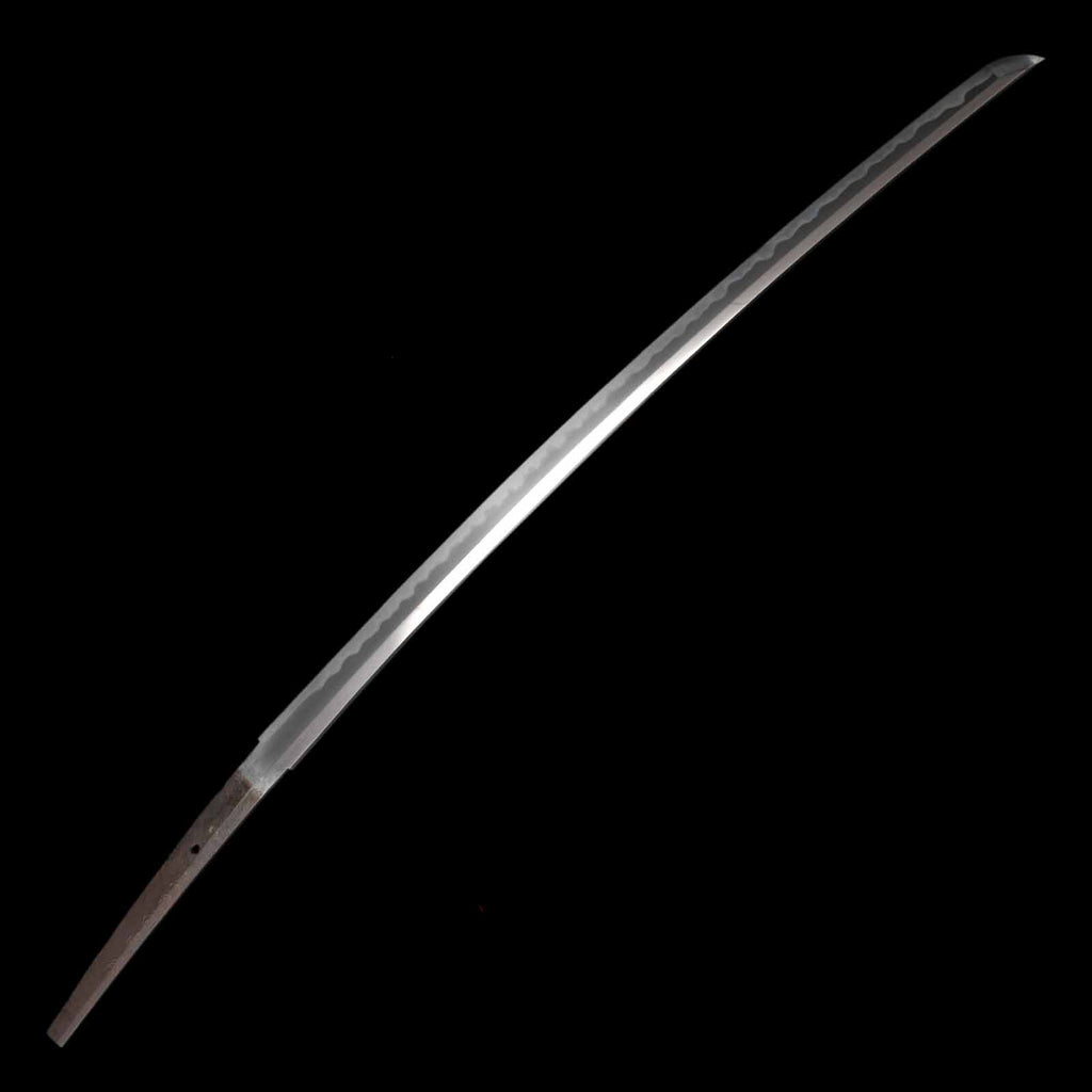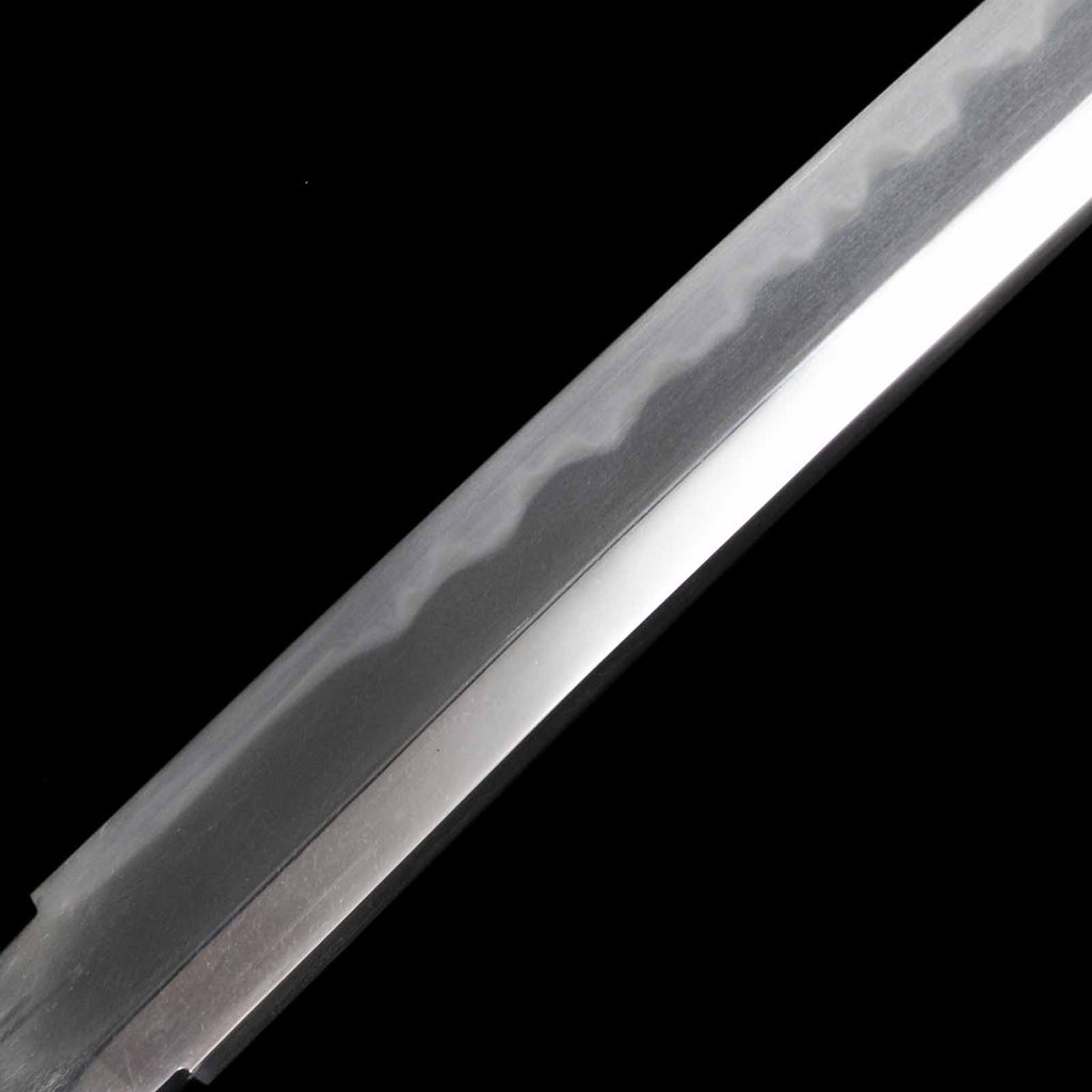 This piece is a very well-preserved katana made by Ujifusa. The sword blade is in very clean condition, with no flaws or chips. There are a few faint scuff marks from pulling the sword blade out of the scabbard. The itame hada is well packed and is decorated with niedeki sambonsugi hamon. The name Shinoda Ujifusa is engraved on the nakago.