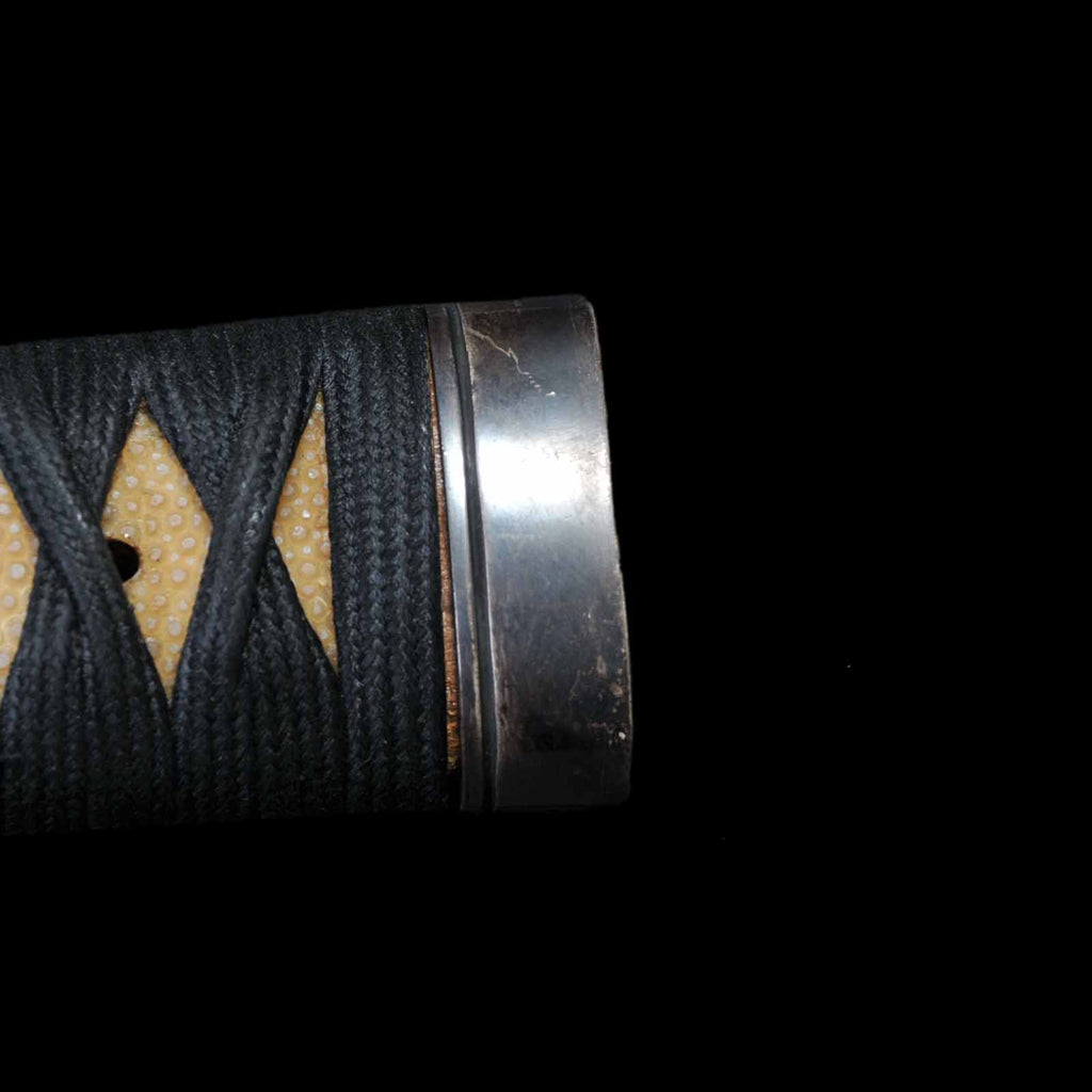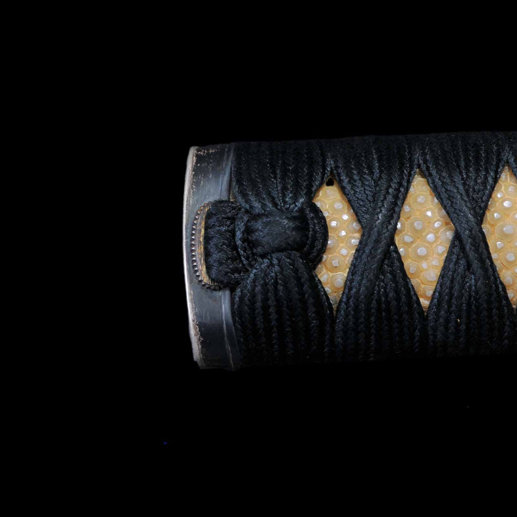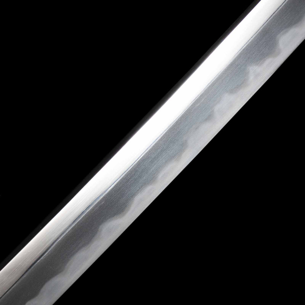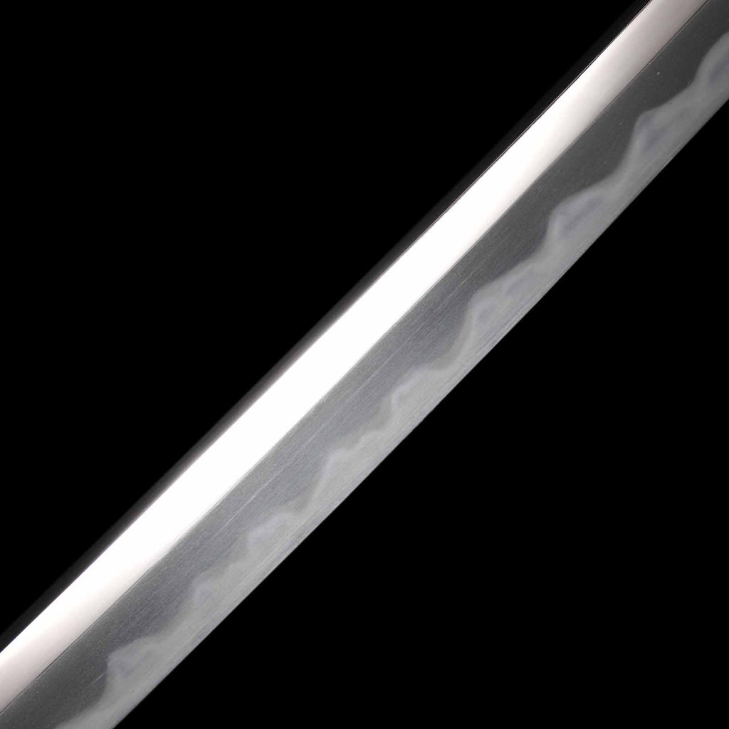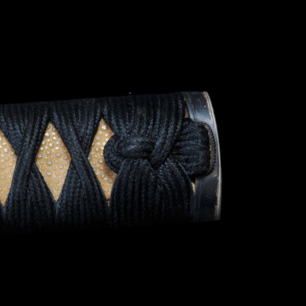 This piece is a very well-preserved katana made by Ujifusa. The sword blade is in very clean condition, with no flaws or chips. There are a few faint scuff marks from pulling the sword blade out of the scabbard. The itame hada is well packed and is decorated with niedeki sambonsugi hamon. The name Shinoda Ujifusa is engraved on the nakago.