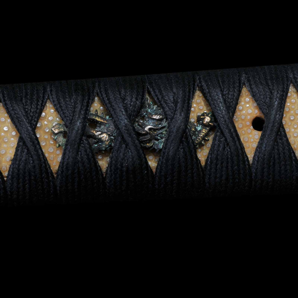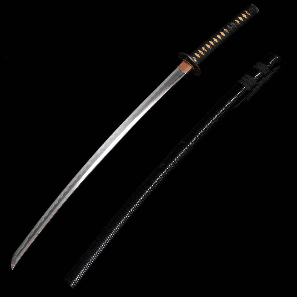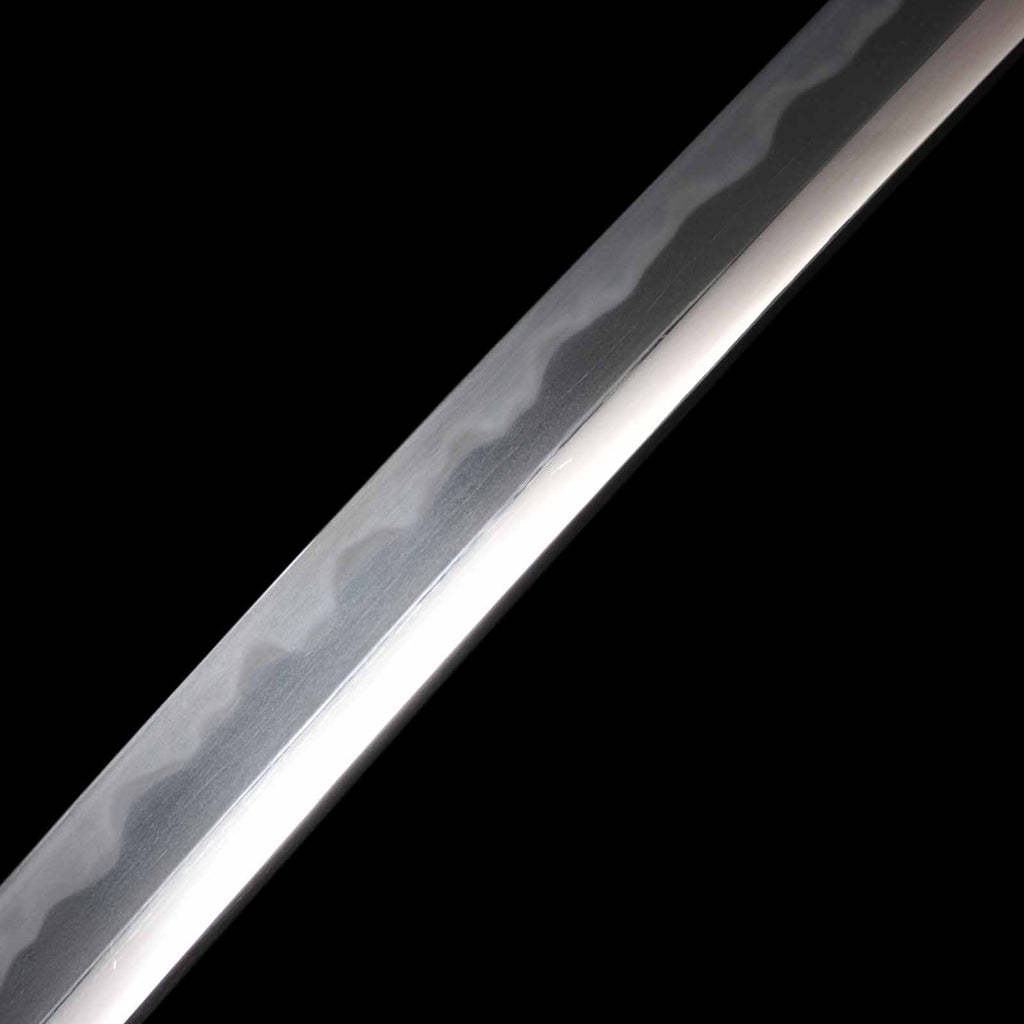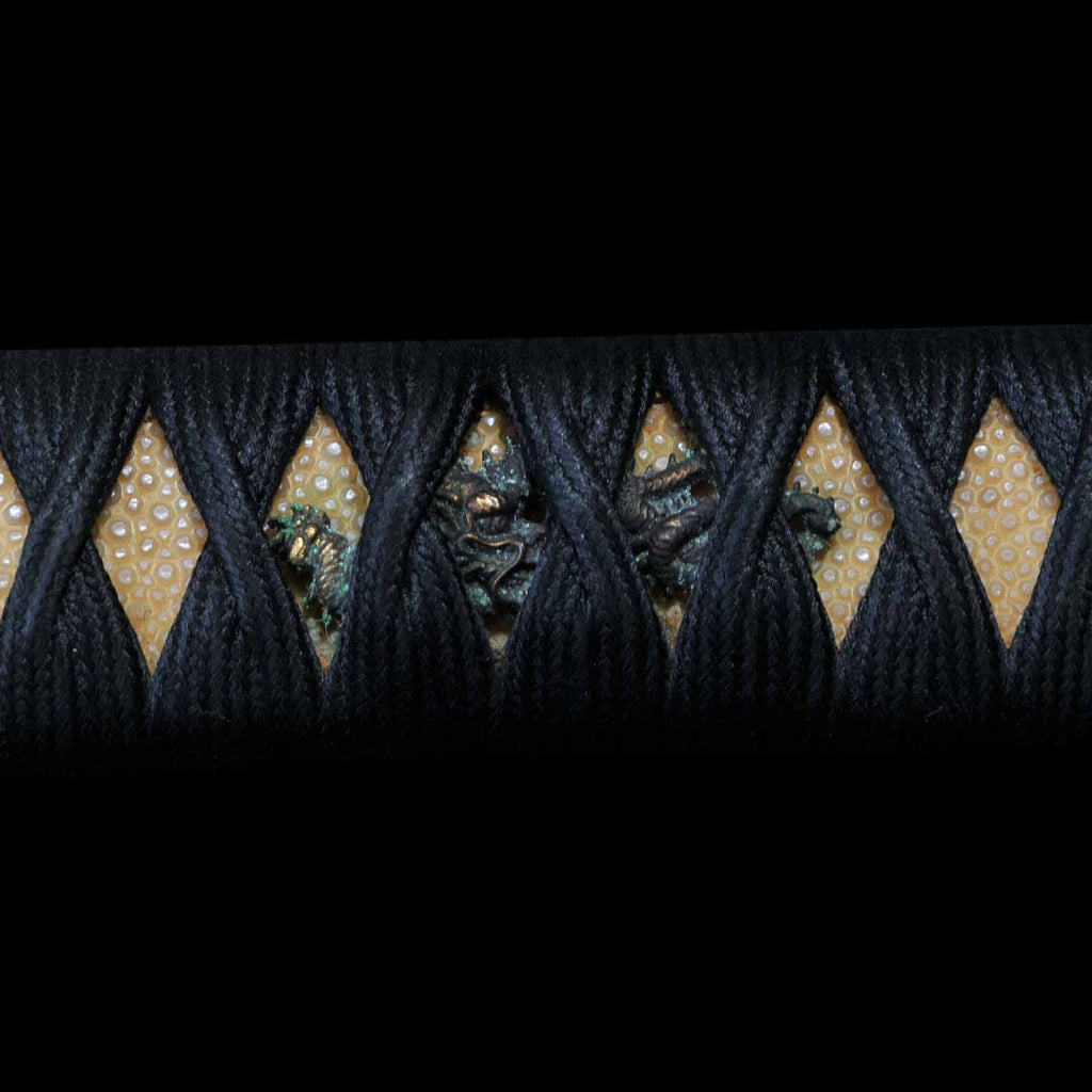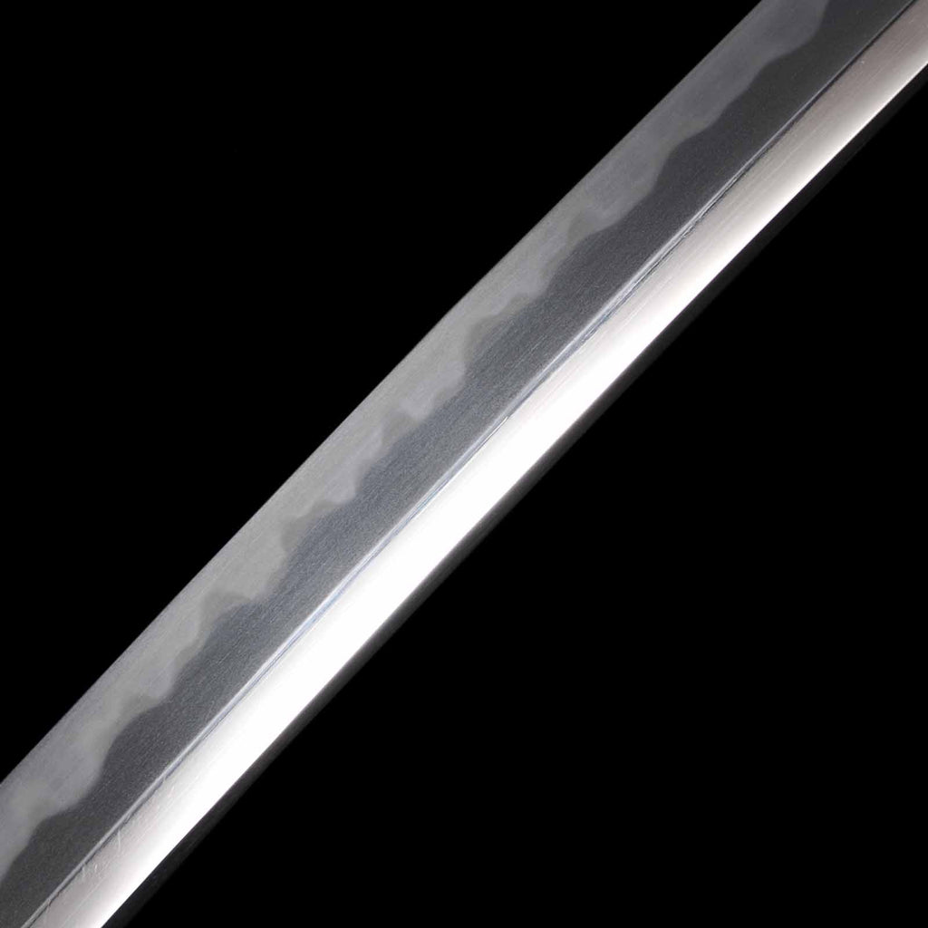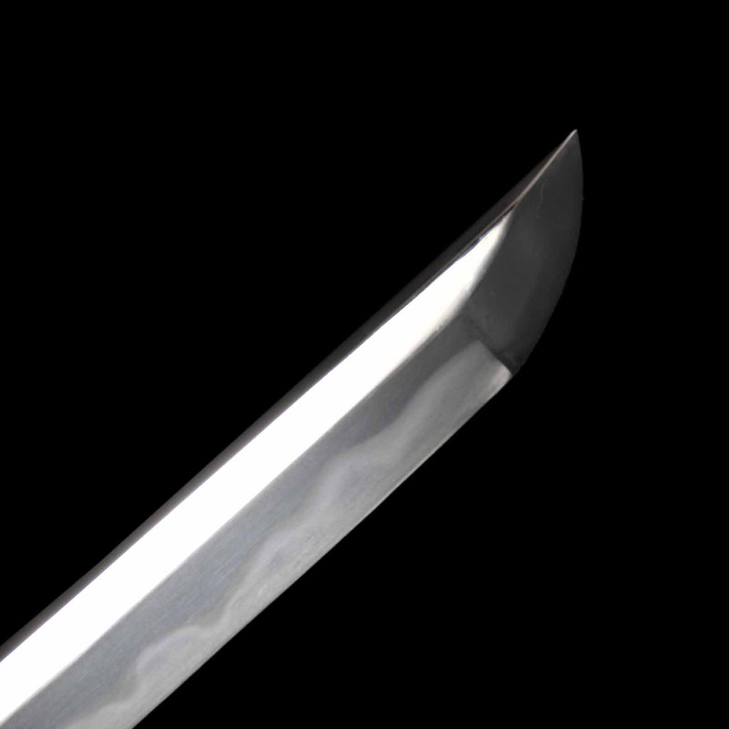 This piece is a very well-preserved katana made by Ujifusa. The sword blade is in very clean condition, with no flaws or chips. There are a few faint scuff marks from pulling the sword blade out of the scabbard. The itame hada is well packed and is decorated with niedeki sambonsugi hamon. The name Shinoda Ujifusa is engraved on the nakago.
