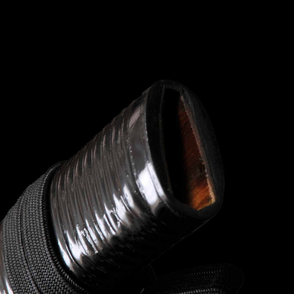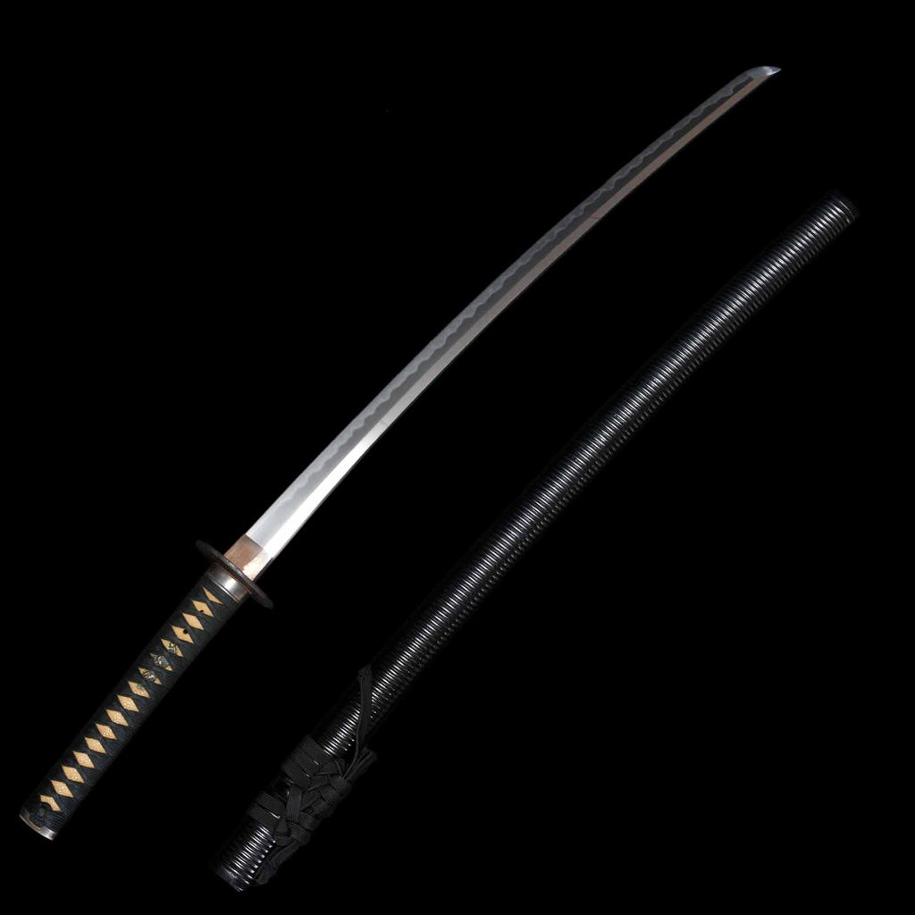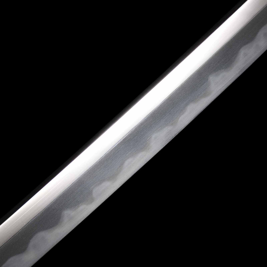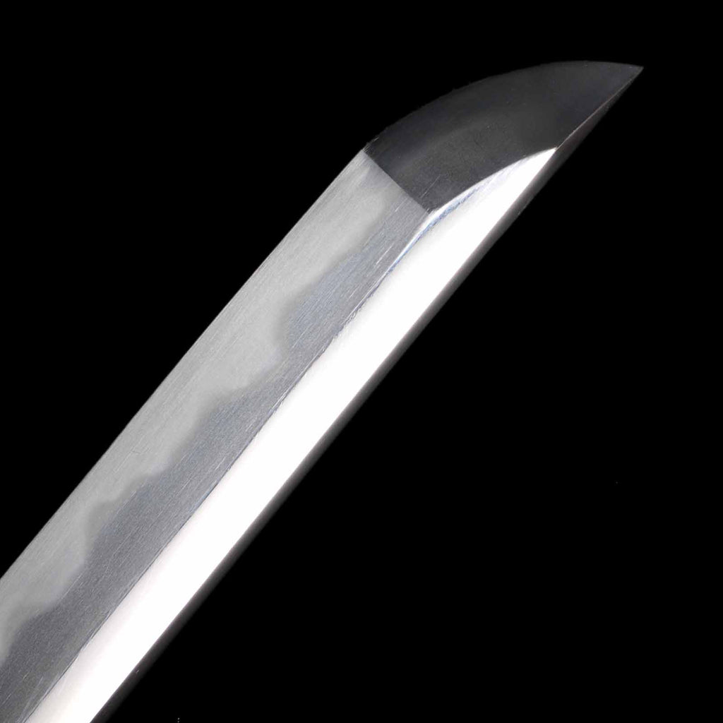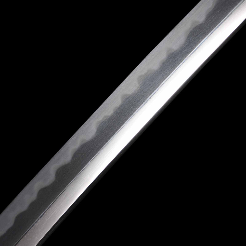 This piece is a very well-preserved katana made by Ujifusa. The sword blade is in very clean condition, with no flaws or chips. There are a few faint scuff marks from pulling the sword blade out of the scabbard. The itame hada is well packed and is decorated with niedeki sambonsugi hamon. The name Shinoda Ujifusa is engraved on the nakago.