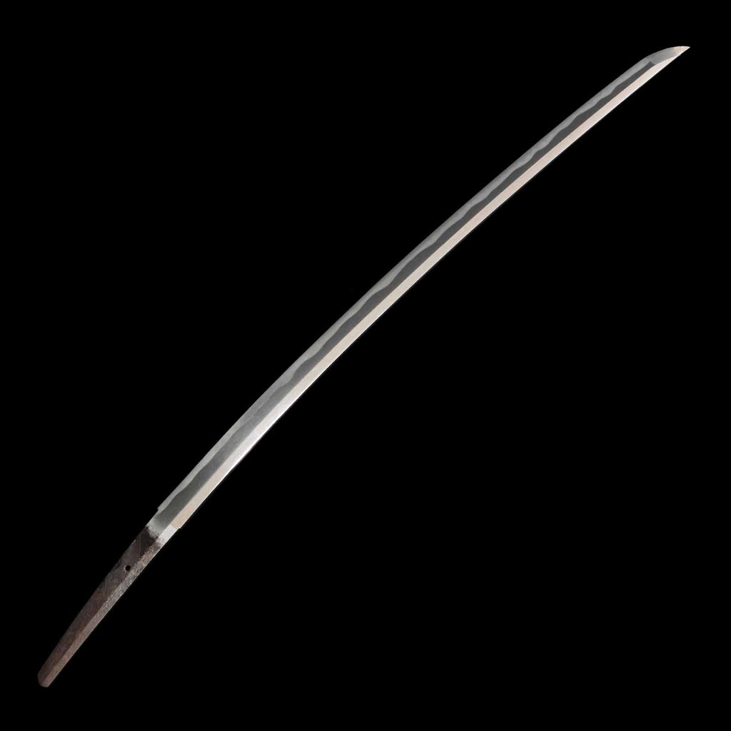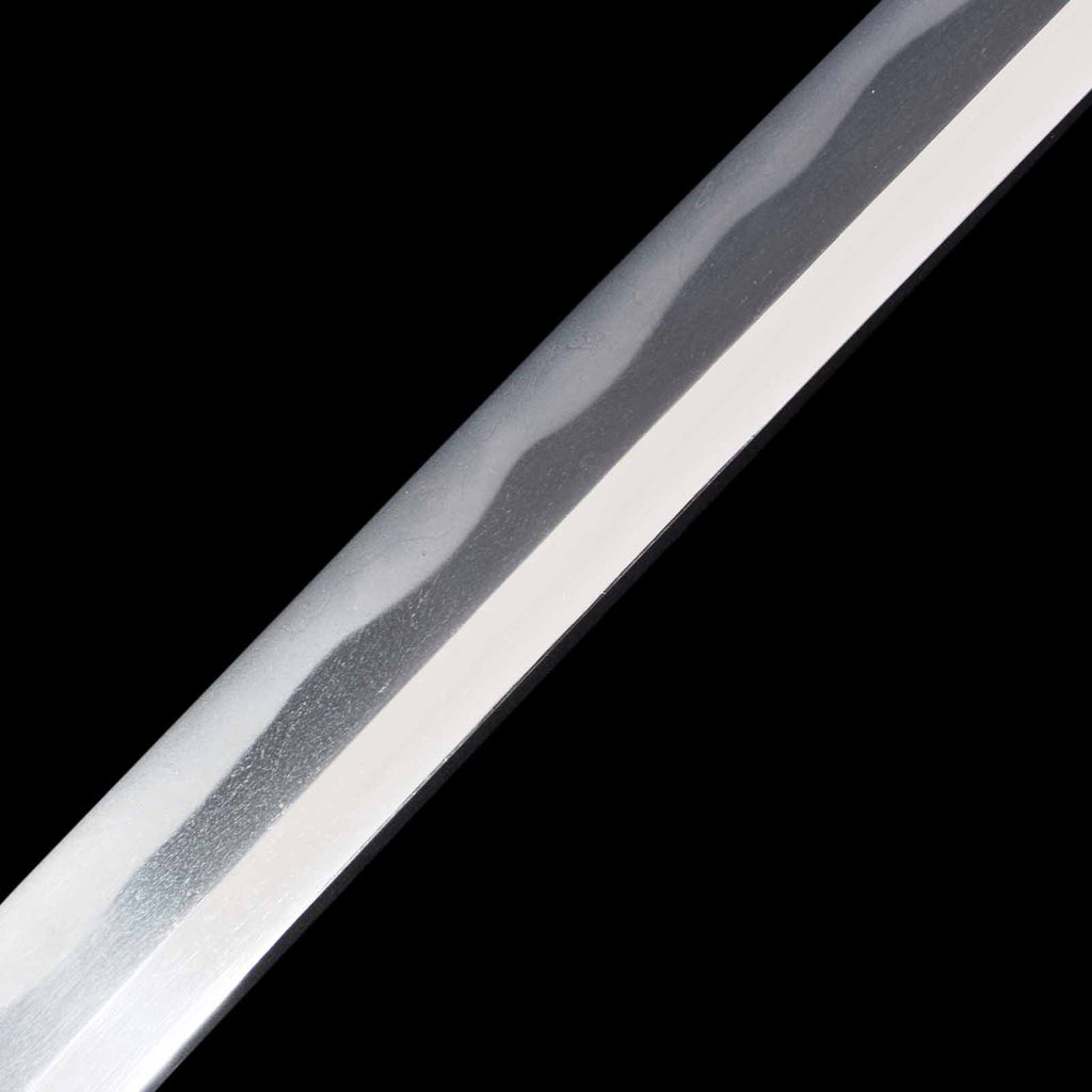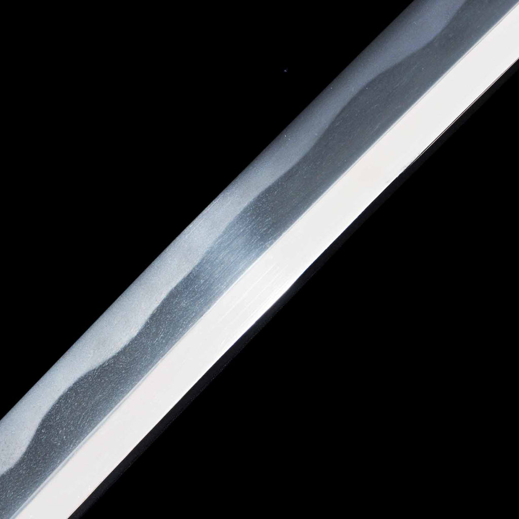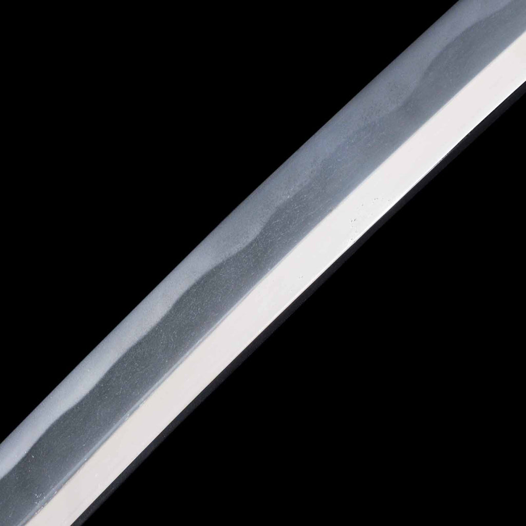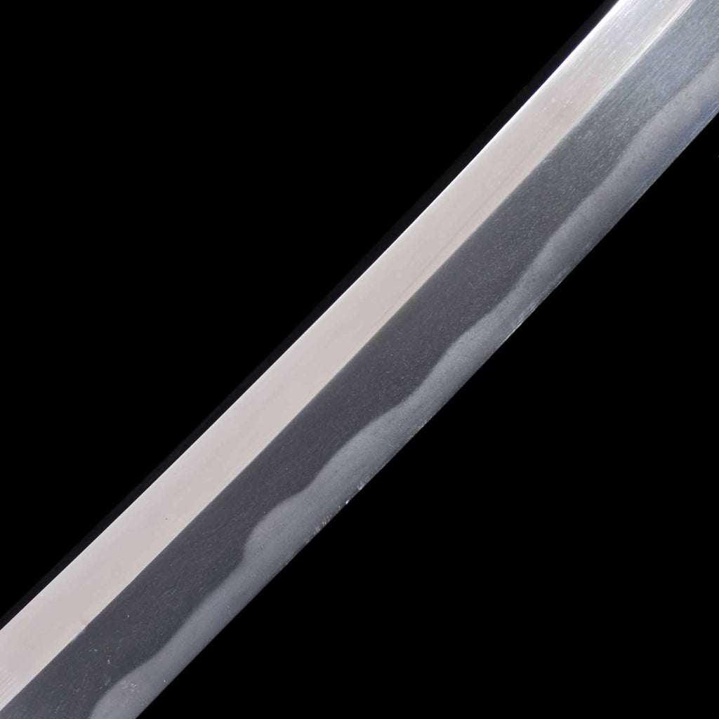 This katana features a kogunome hamon with itame hada mixed with togariba. The preservation of the sword blade is very excellent and beautiful. There is a minute spot-like flaw on the sashiomote side, about 15 cm from the habakimoto, but it is not fatal that would lower the value. His name is engraved on the ridge of the nakago, which is also characteristic of him. Because of its excellent state of preservation, the NBTHK has evaluated this sword for special preservation value and has issued a certificate of authenticity for it.