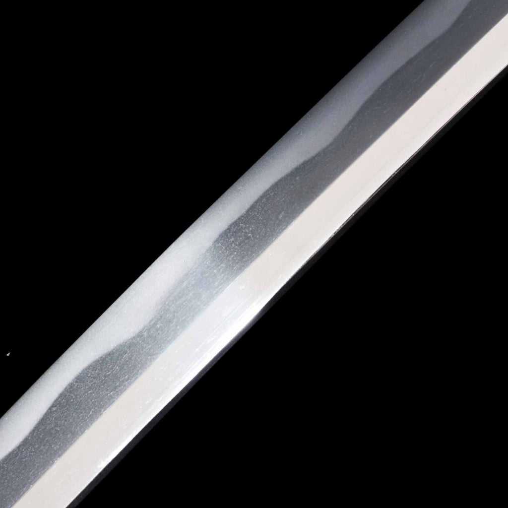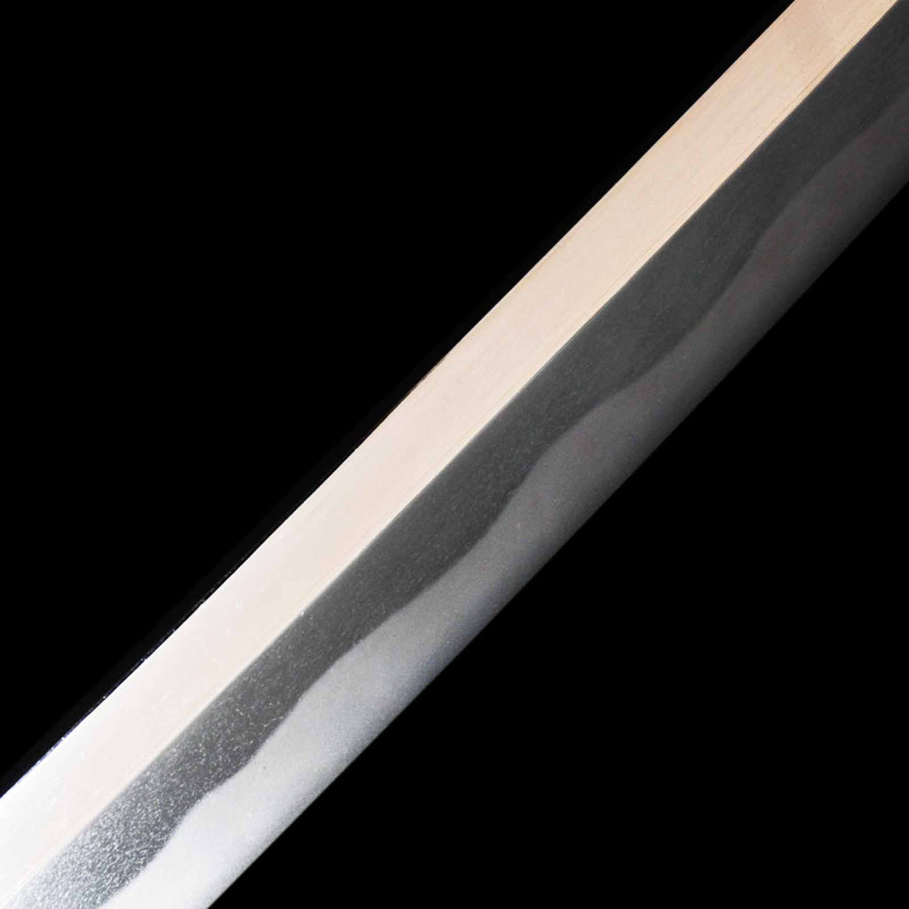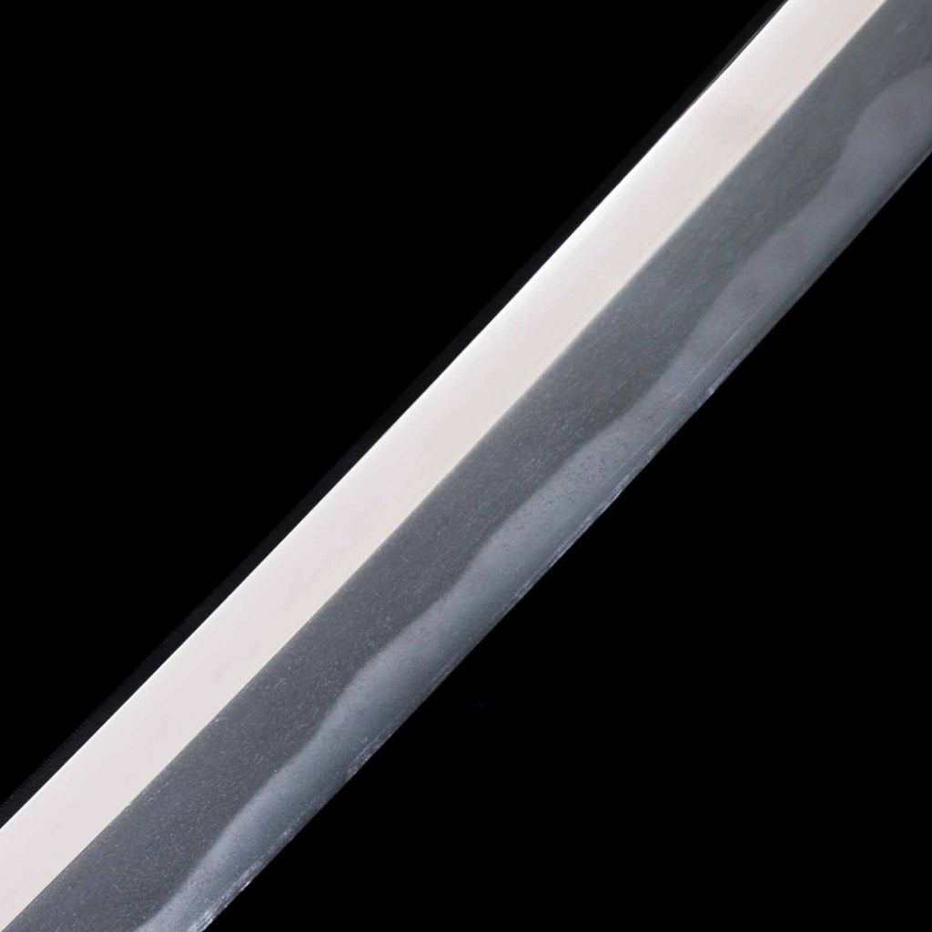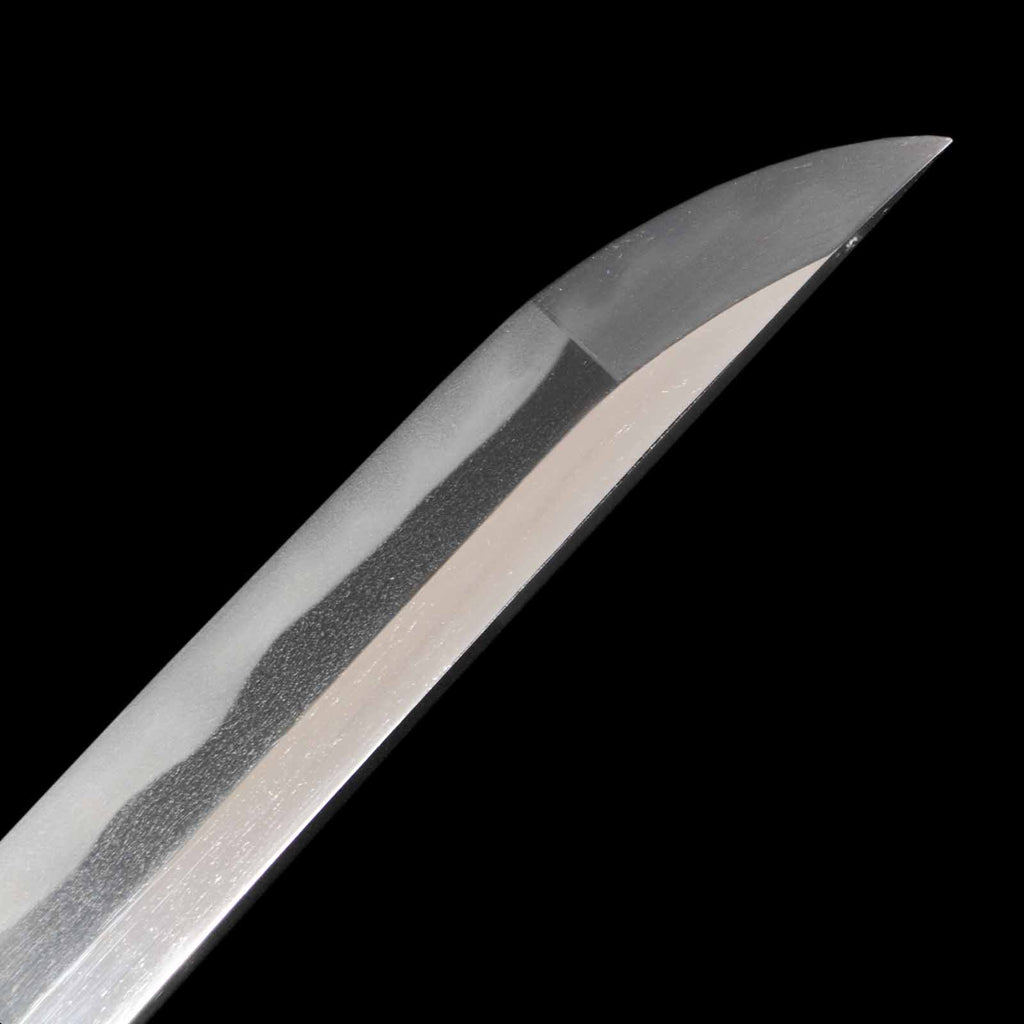 This katana features a kogunome hamon with itame hada mixed with togariba. The preservation of the sword blade is very excellent and beautiful. There is a minute spot-like flaw on the sashiomote side, about 15 cm from the habakimoto, but it is not fatal that would lower the value. His name is engraved on the ridge of the nakago, which is also characteristic of him. Because of its excellent state of preservation, the NBTHK has evaluated this sword for special preservation value and has issued a certificate of authenticity for it.