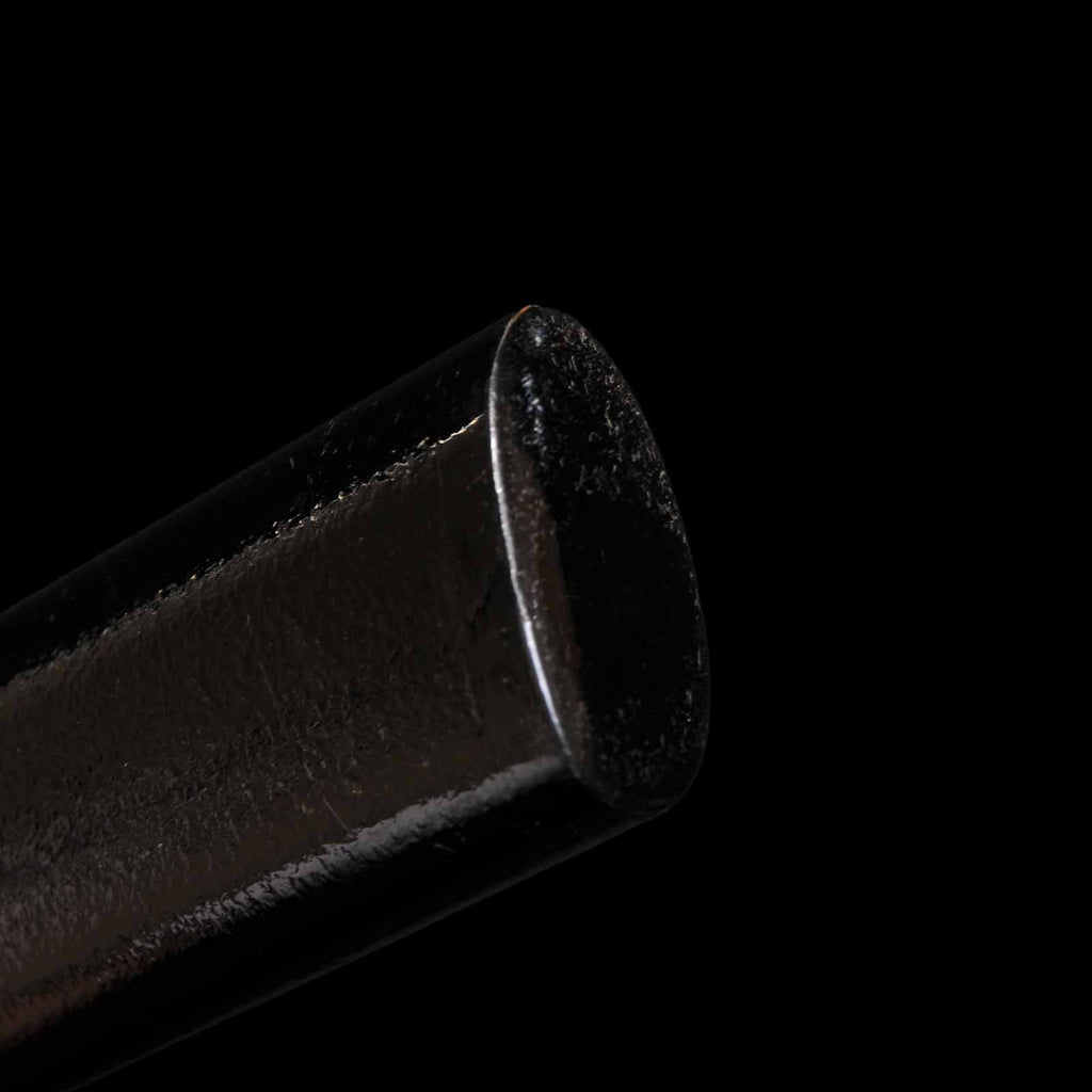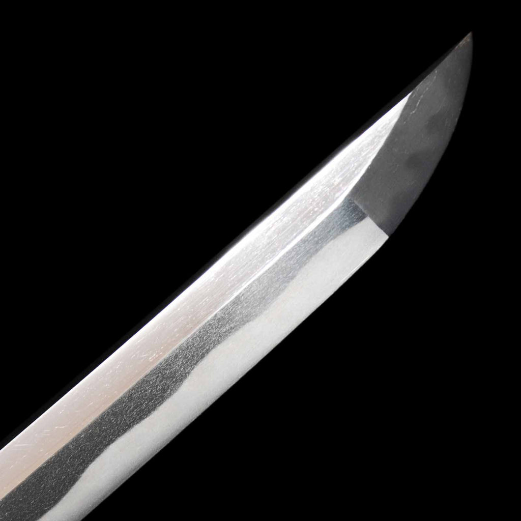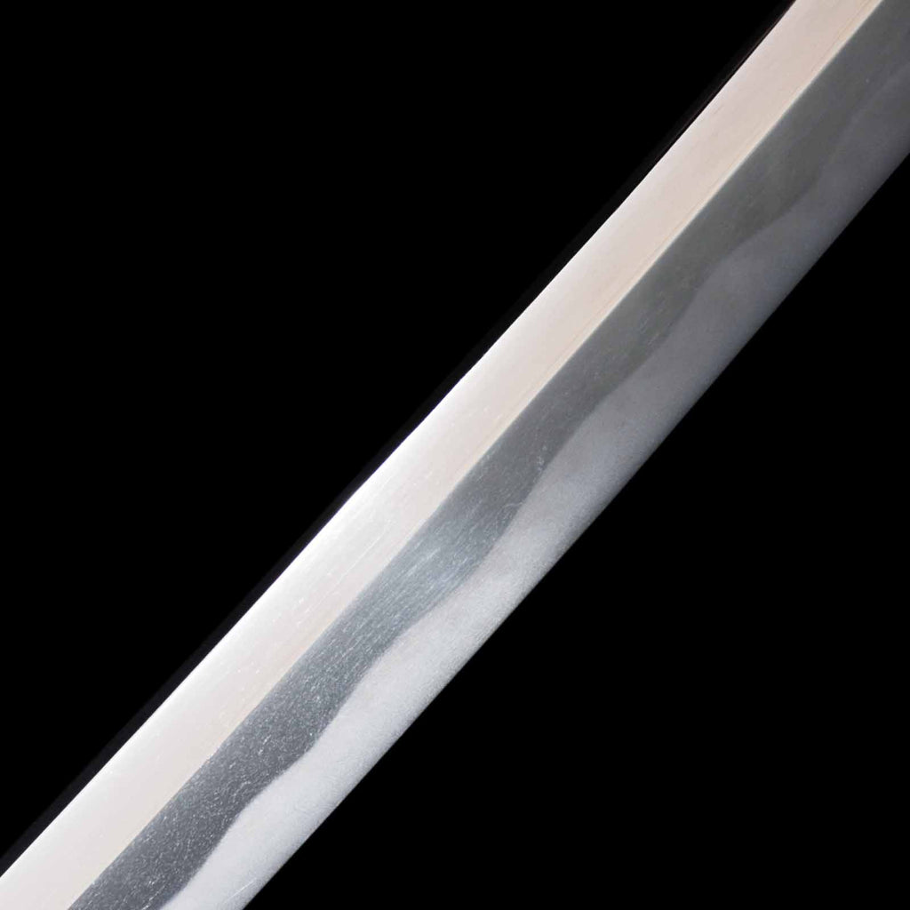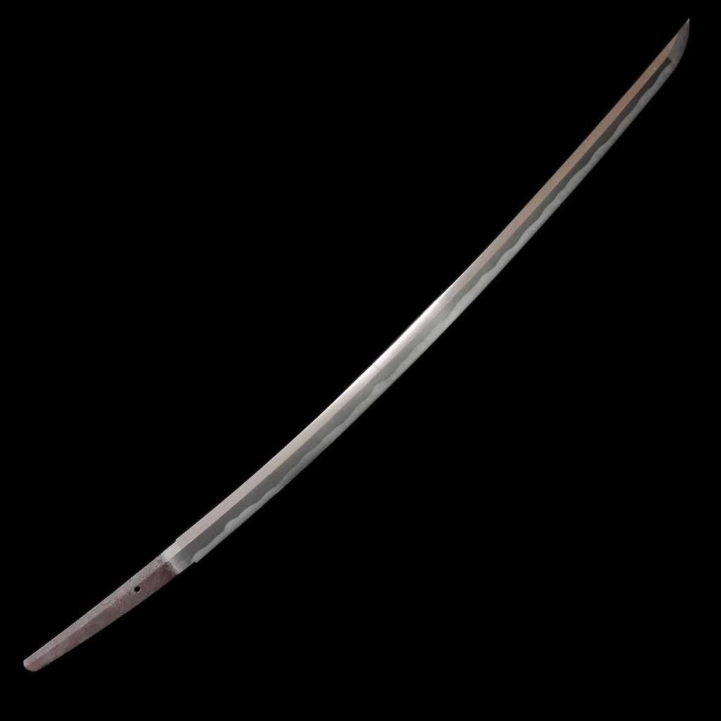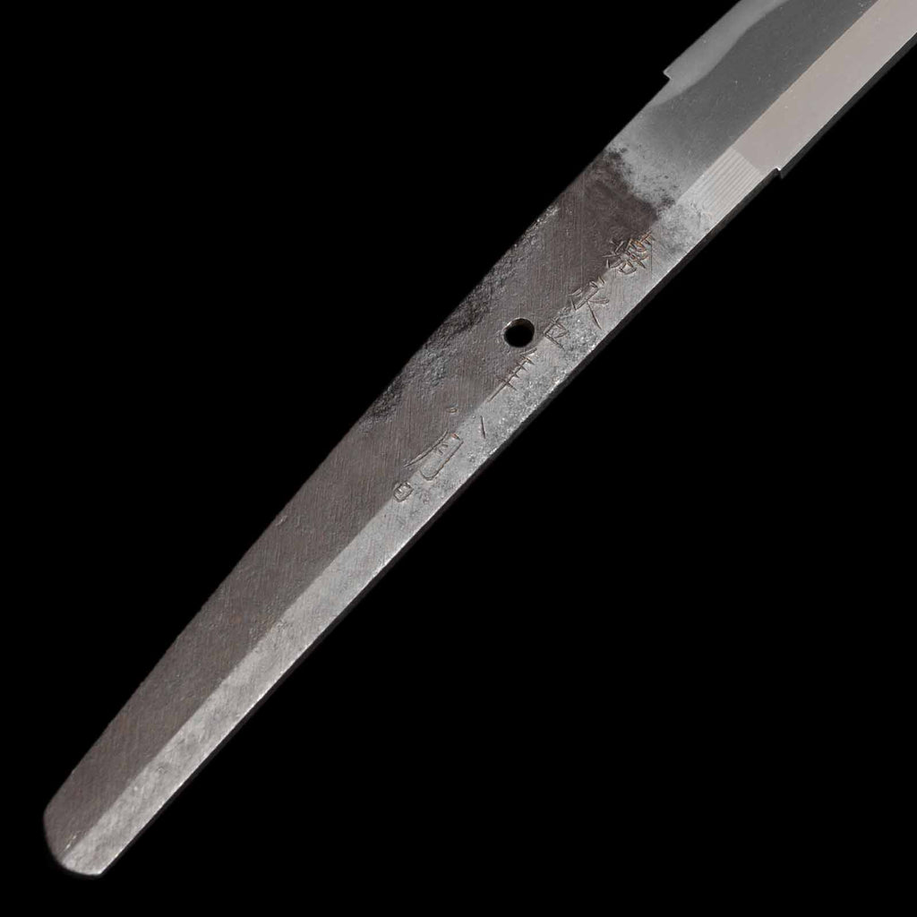 This katana features a kogunome hamon with itame hada mixed with togariba. The preservation of the sword blade is very excellent and beautiful. There is a minute spot-like flaw on the sashiomote side, about 15 cm from the habakimoto, but it is not fatal that would lower the value. His name is engraved on the ridge of the nakago, which is also characteristic of him. Because of its excellent state of preservation, the NBTHK has evaluated this sword for special preservation value and has issued a certificate of authenticity for it.