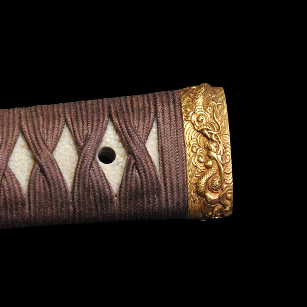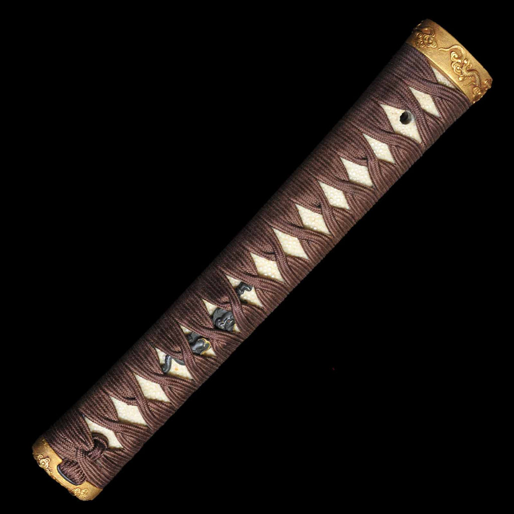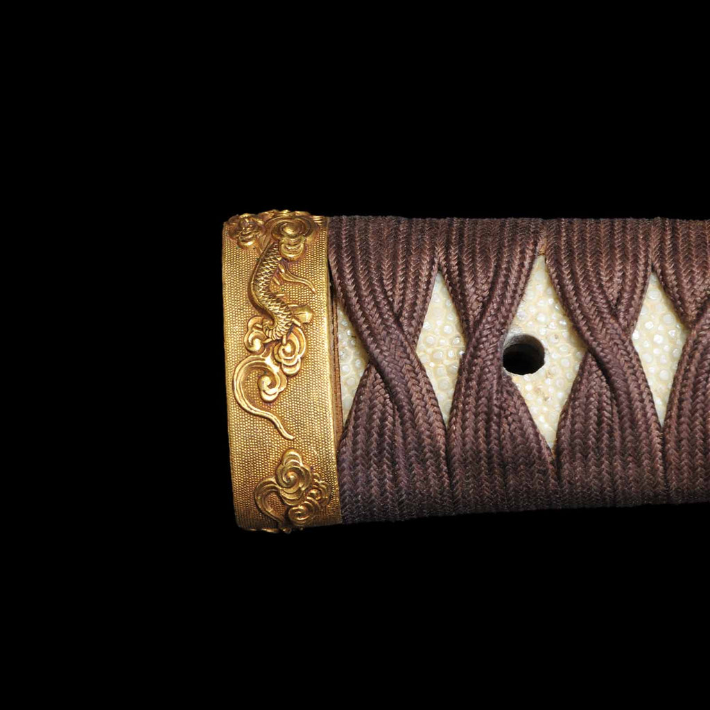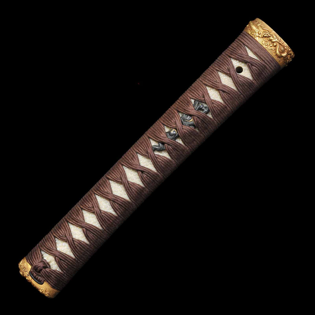 The tsukamaki is wrapped with a brown cord of pure silk in the style of a tsumamaki. The fuchikashira set and menuki are decorated with a dragon pattern. The plain round tsuba is trimmed in gold and is simple yet elegant. The scabbard is a powerful taki-nuri.