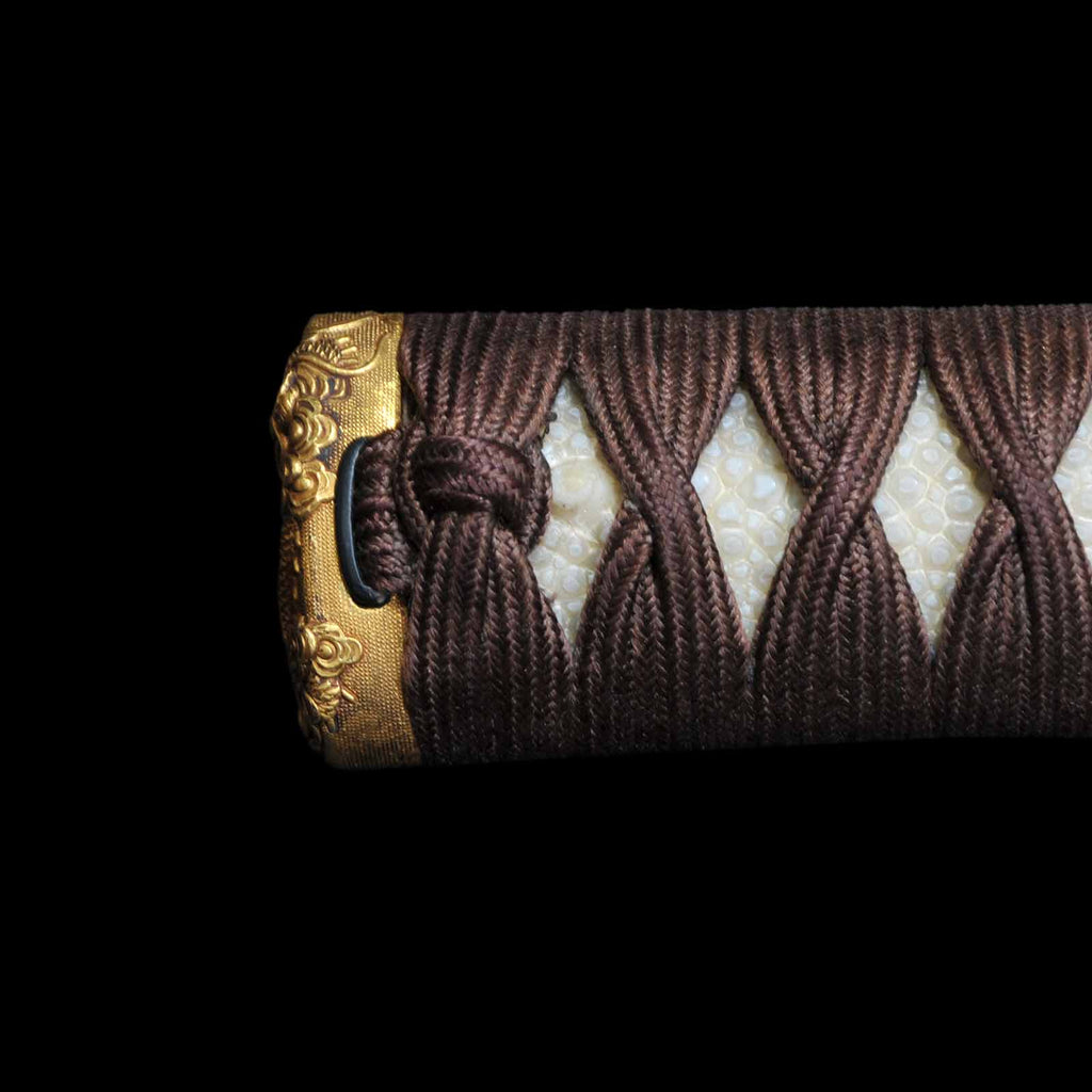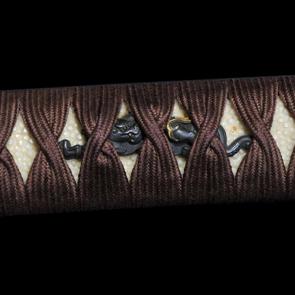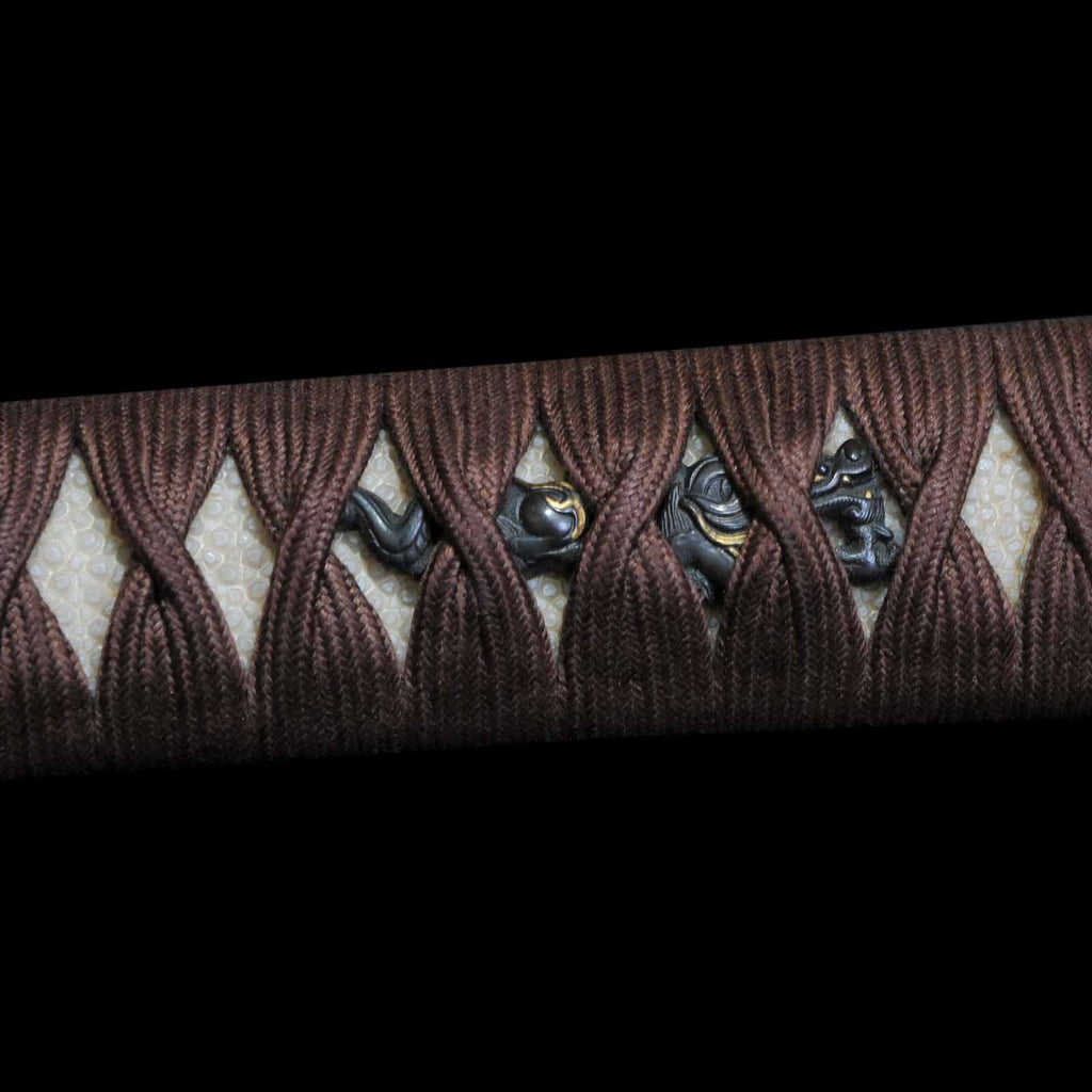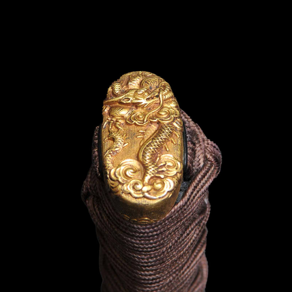 The tsukamaki is wrapped with a brown cord of pure silk in the style of a tsumamaki. The fuchikashira set and menuki are decorated with a dragon pattern. The plain round tsuba is trimmed in gold and is simple yet elegant. The scabbard is a powerful taki-nuri.