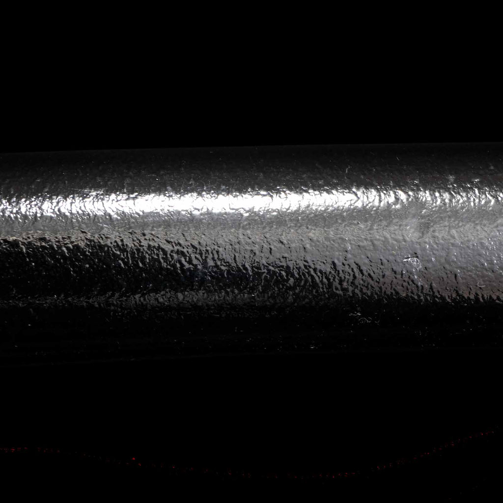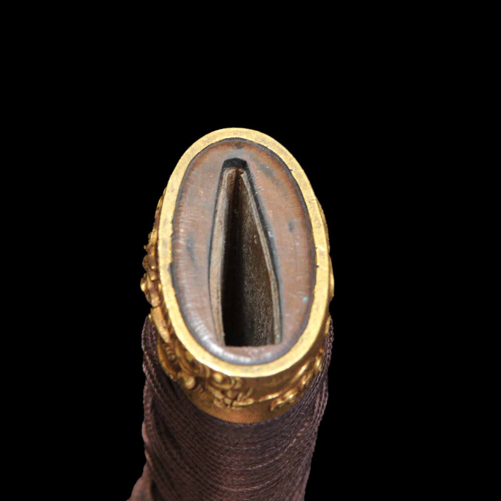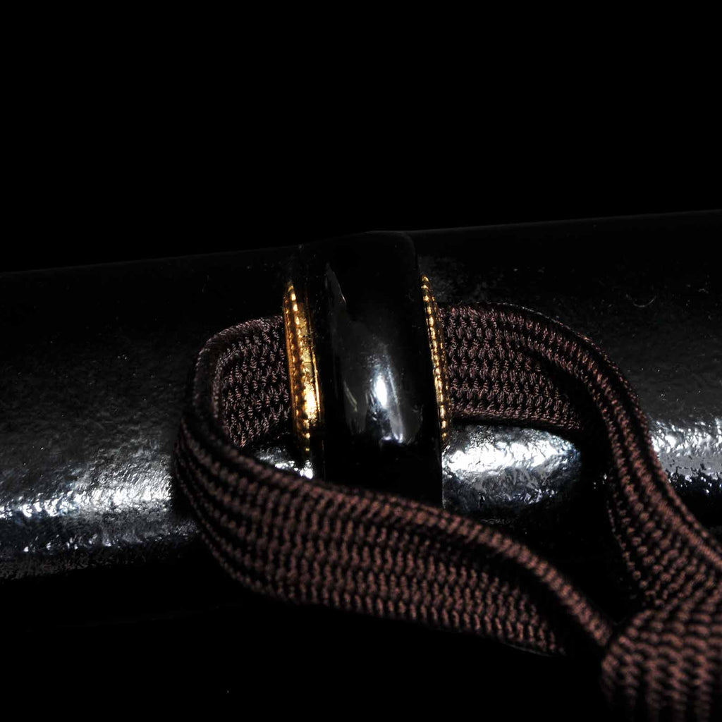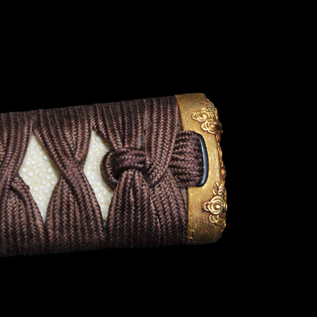 The tsukamaki is wrapped with a brown cord of pure silk in the style of a tsumamaki. The fuchikashira set and menuki are decorated with a dragon pattern. The plain round tsuba is trimmed in gold and is simple yet elegant. The scabbard is a powerful taki-nuri.