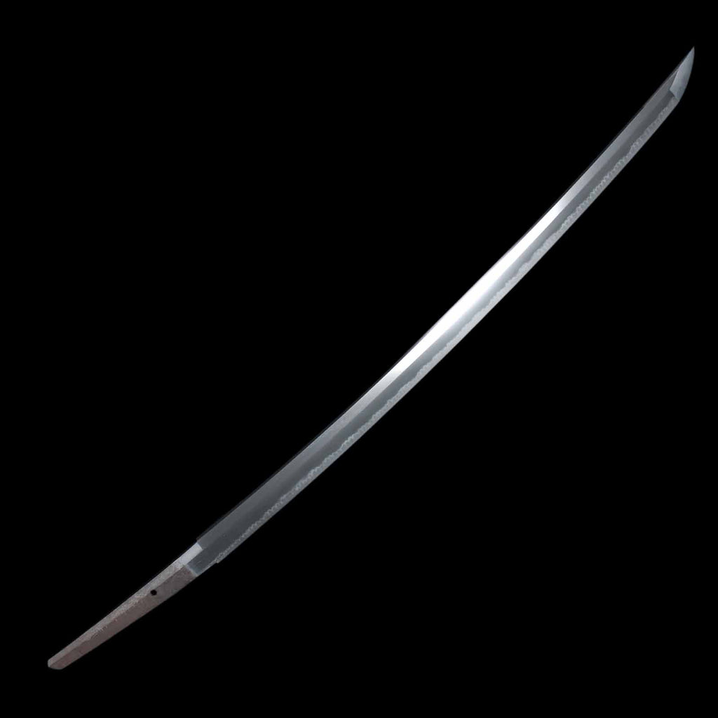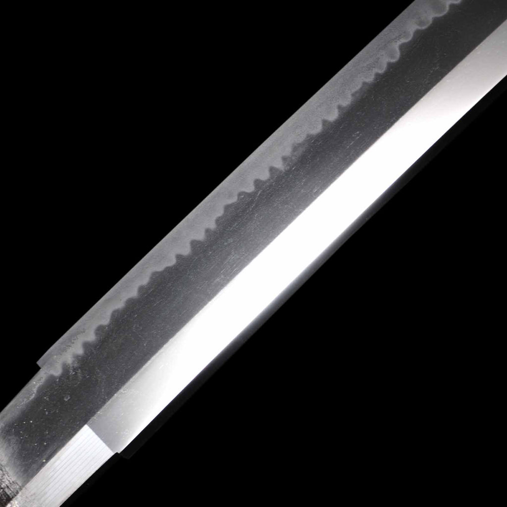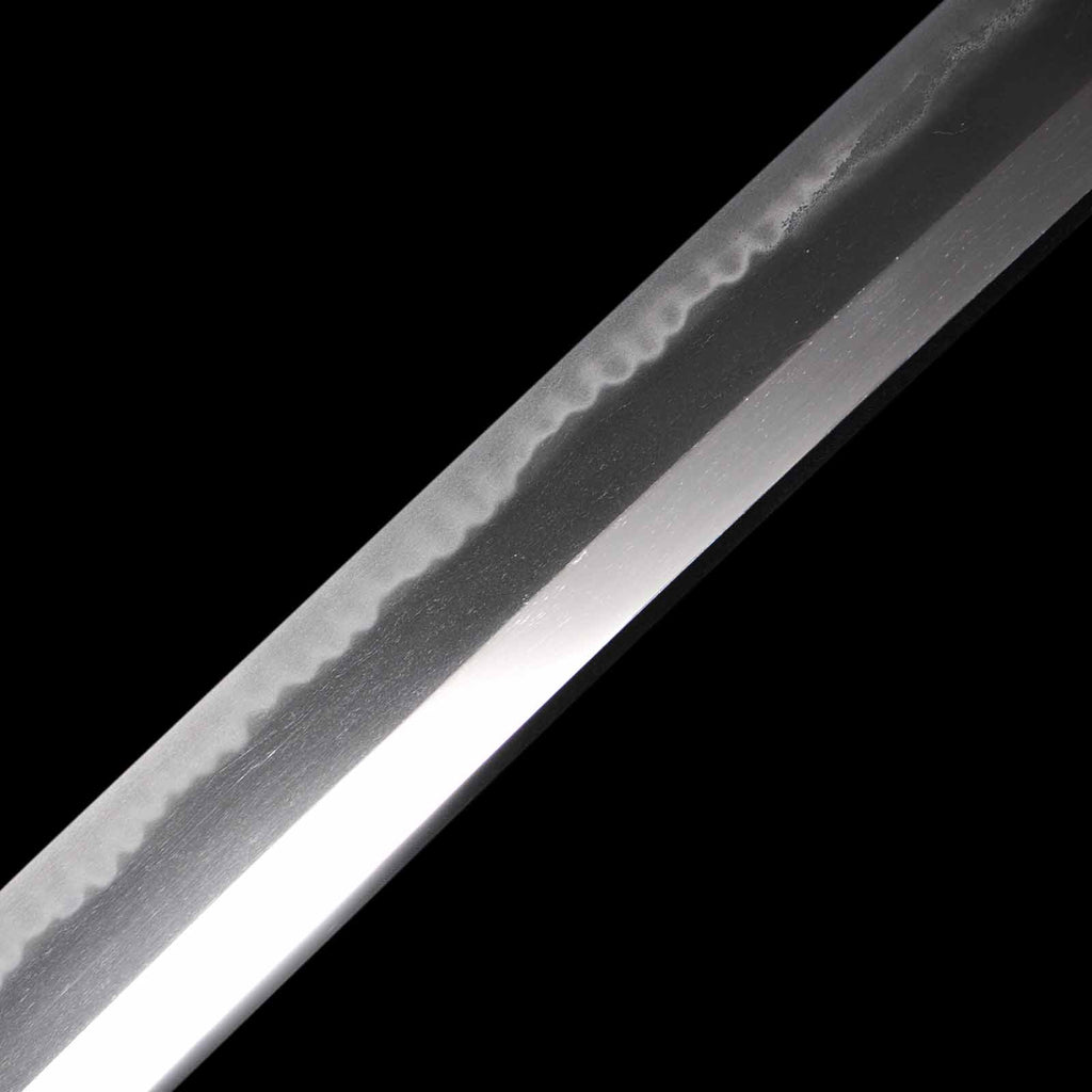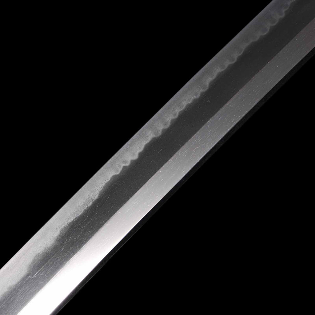 The sword is extremely well preserved, with no flaws, dents, or chips. The polishing is excellent and the hada and hamon are very visible and enjoyable to appreciate. Itame's hada is well packed and active hataraki such as yubashiri and chikei can be seen. Hamon has long ashi gunome that are burned all over and have beautiful nioi.