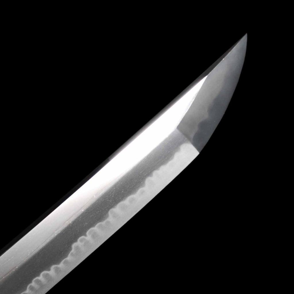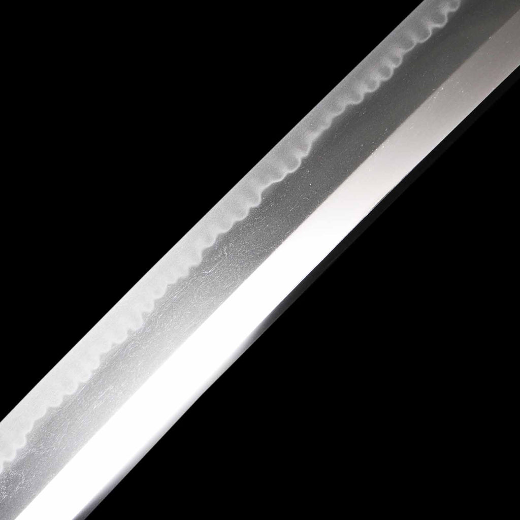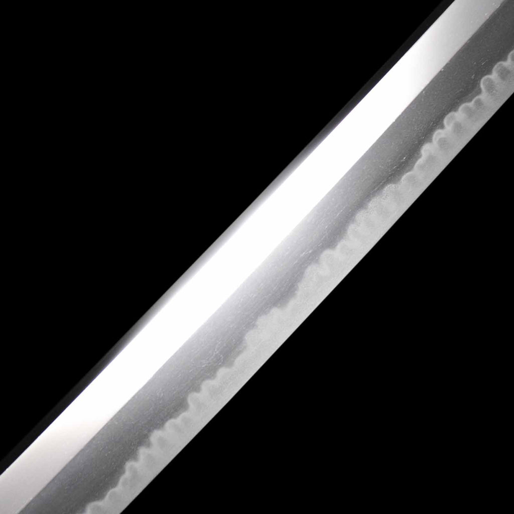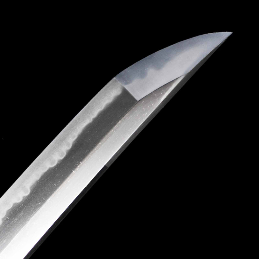 The sword is extremely well preserved, with no flaws, dents, or chips. The polishing is excellent and the hada and hamon are very visible and enjoyable to appreciate. Itame's hada is well packed and active hataraki such as yubashiri and chikei can be seen. Hamon has long ashi gunome that are burned all over and have beautiful nioi.