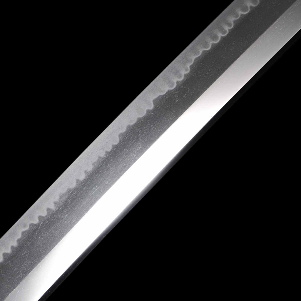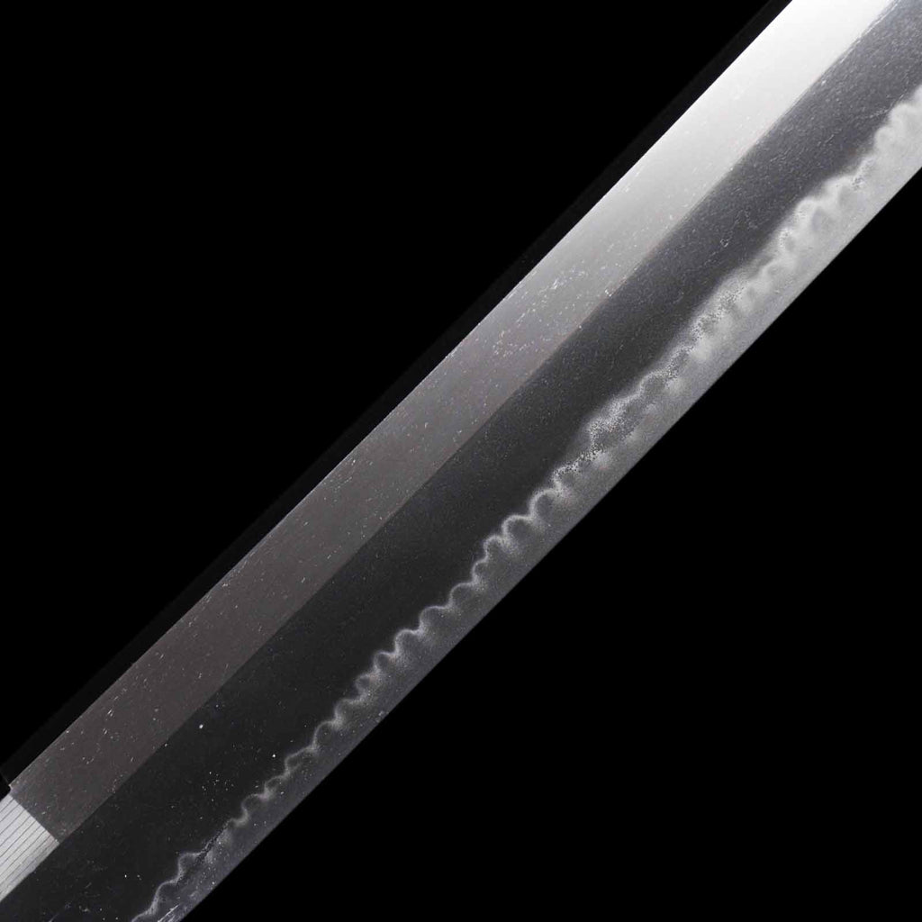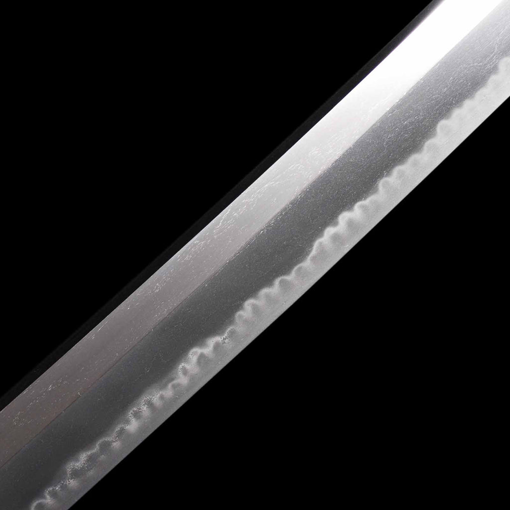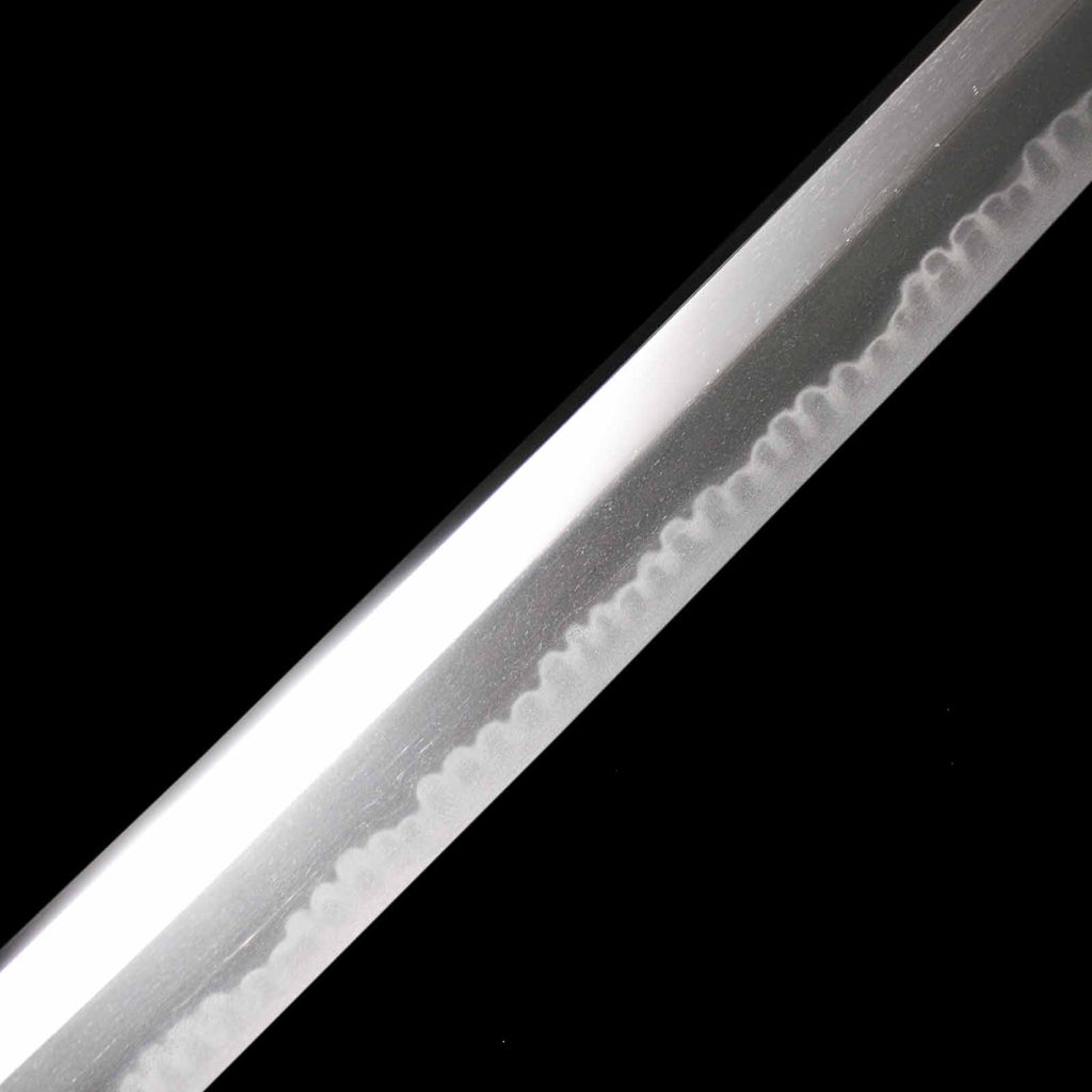 The sword is extremely well preserved, with no flaws, dents, or chips. The polishing is excellent and the hada and hamon are very visible and enjoyable to appreciate. Itame's hada is well packed and active hataraki such as yubashiri and chikei can be seen. Hamon has long ashi gunome that are burned all over and have beautiful nioi.