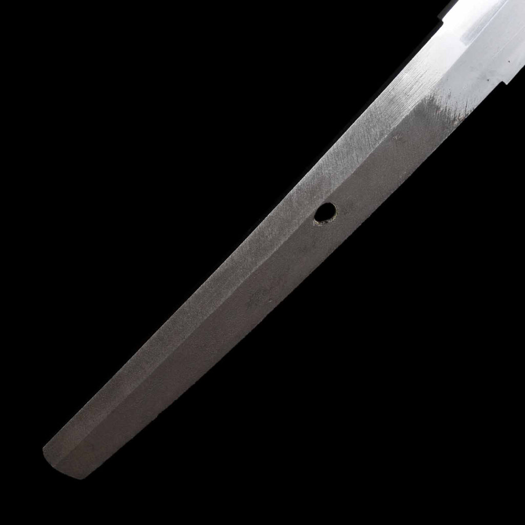 A well-preserved and signed Japanese sword has arrived at TOZANDO. The hada is well packed with itame and the chikei is well visible. Hamon is very elegant with thin Suguha. The kasane is very thick, 7.9 mm at the motohaba position, so we can assume that this katana was made for practical use. Unfortunately, there is a 1mm black dot flaw on the shinogi about 5cm from the habaki on the sashiomote side. There is also a thin rusting on the mune about 6 cm from the munemachi. On the nakago is engraved the inscription, "Noriyuki, a resident of Ako".