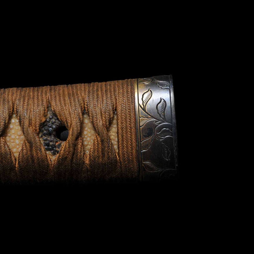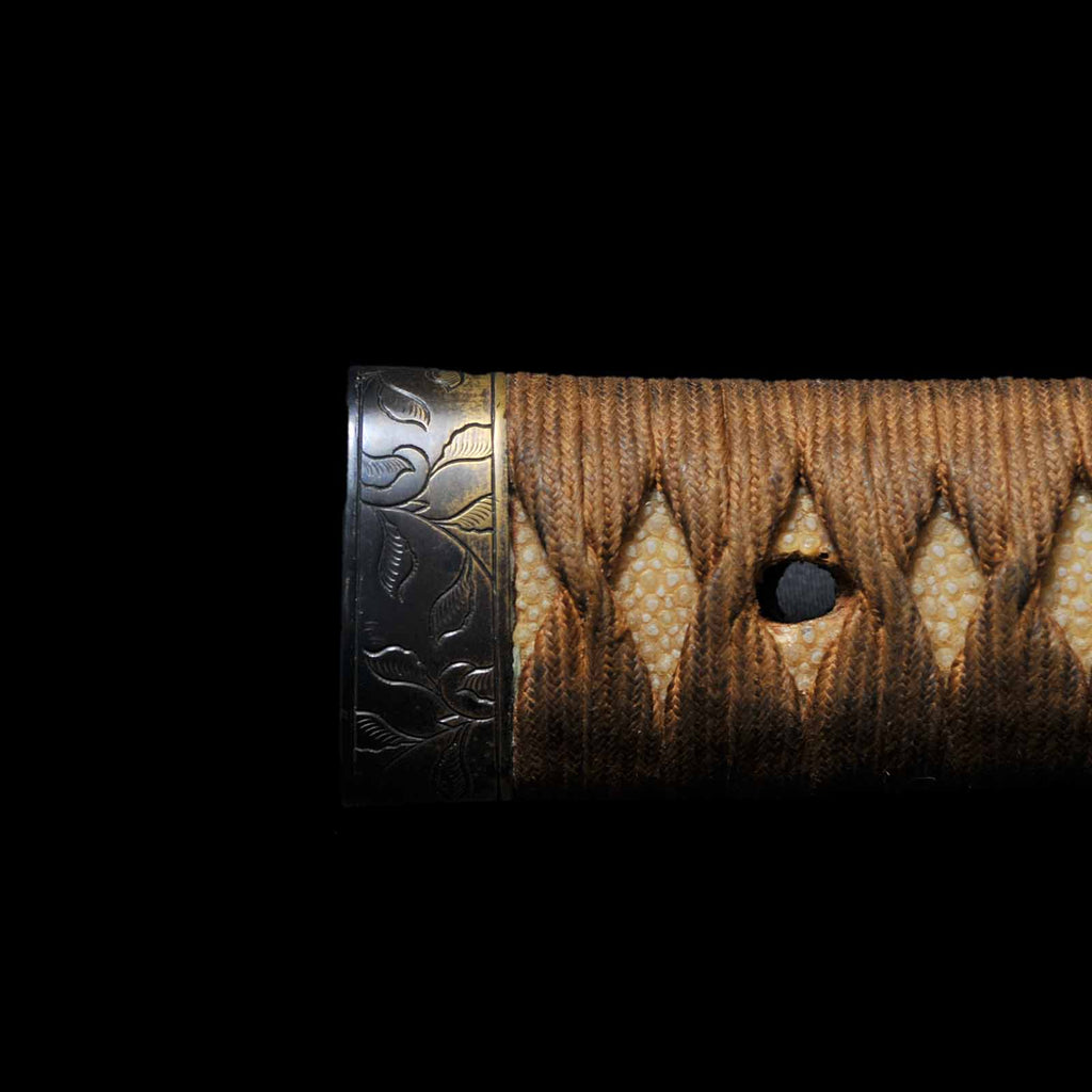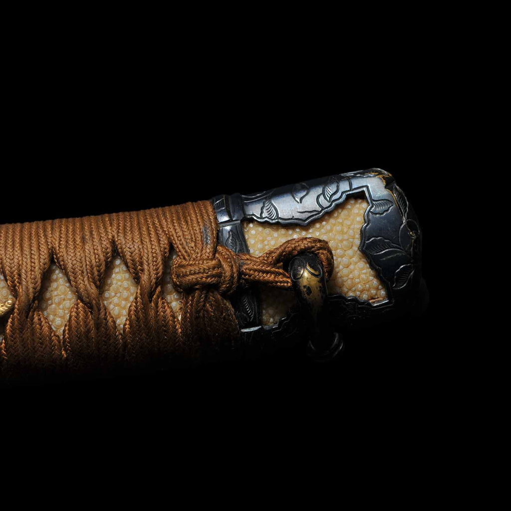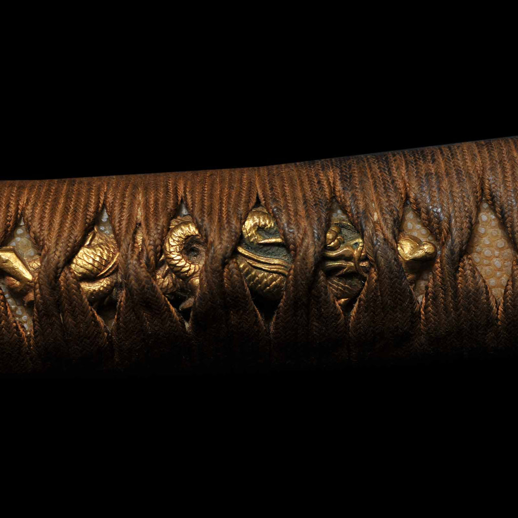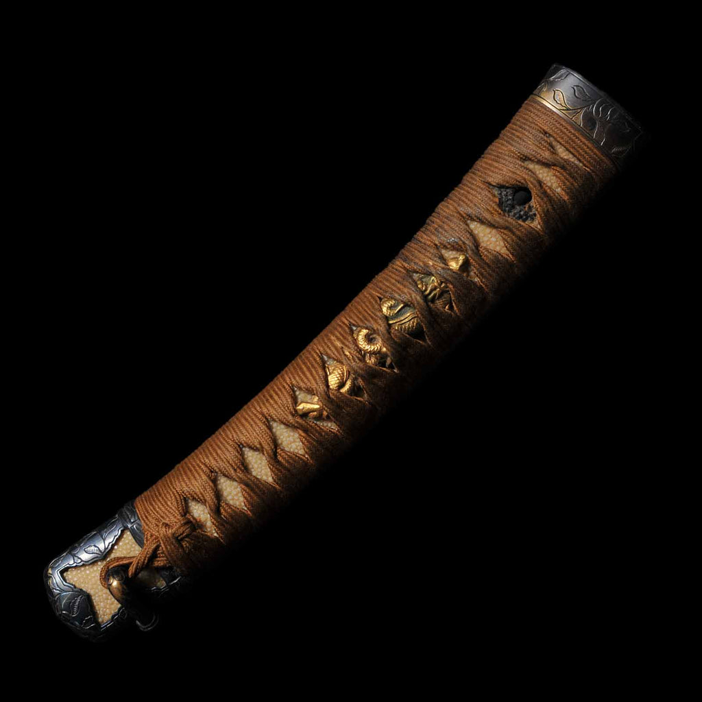 - Koshirae: Tachi Koshirae, brown silk wrapped Tsuka with Nashiji lacquered Saya