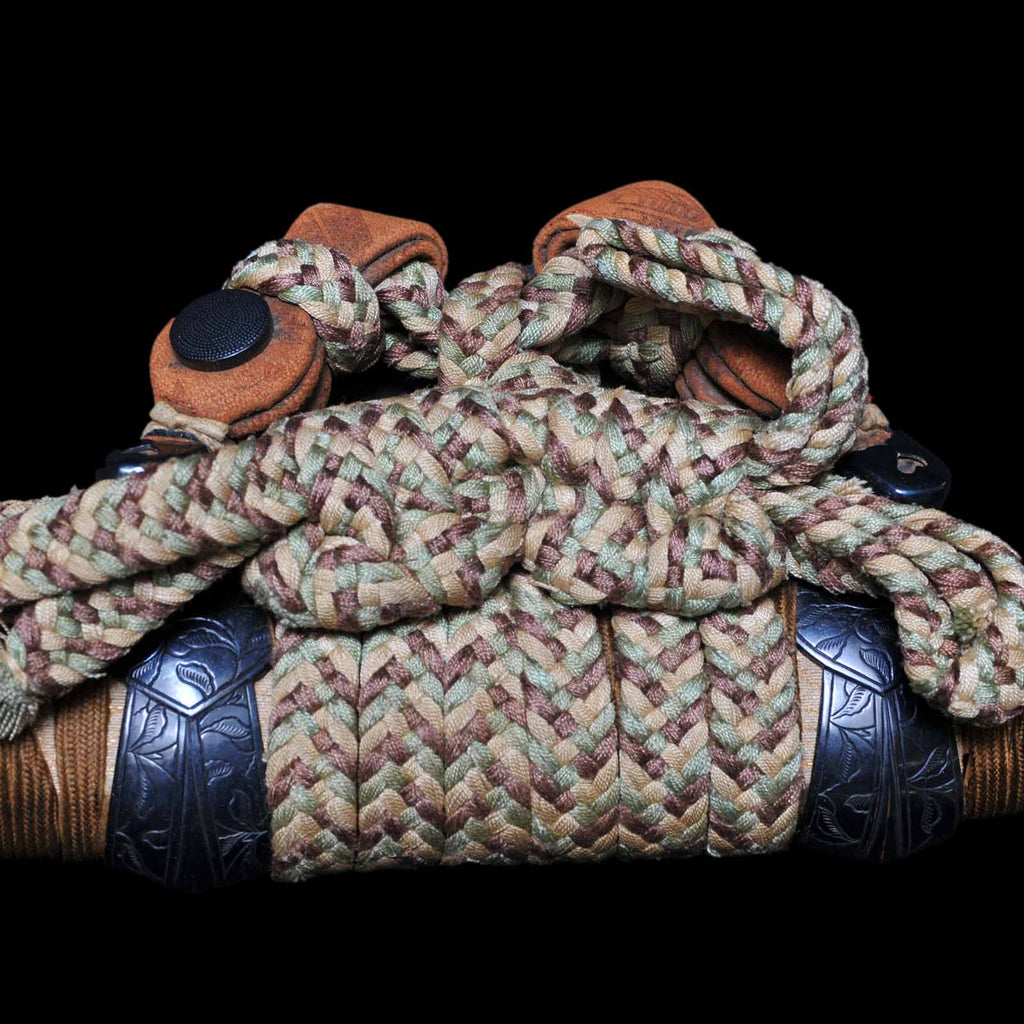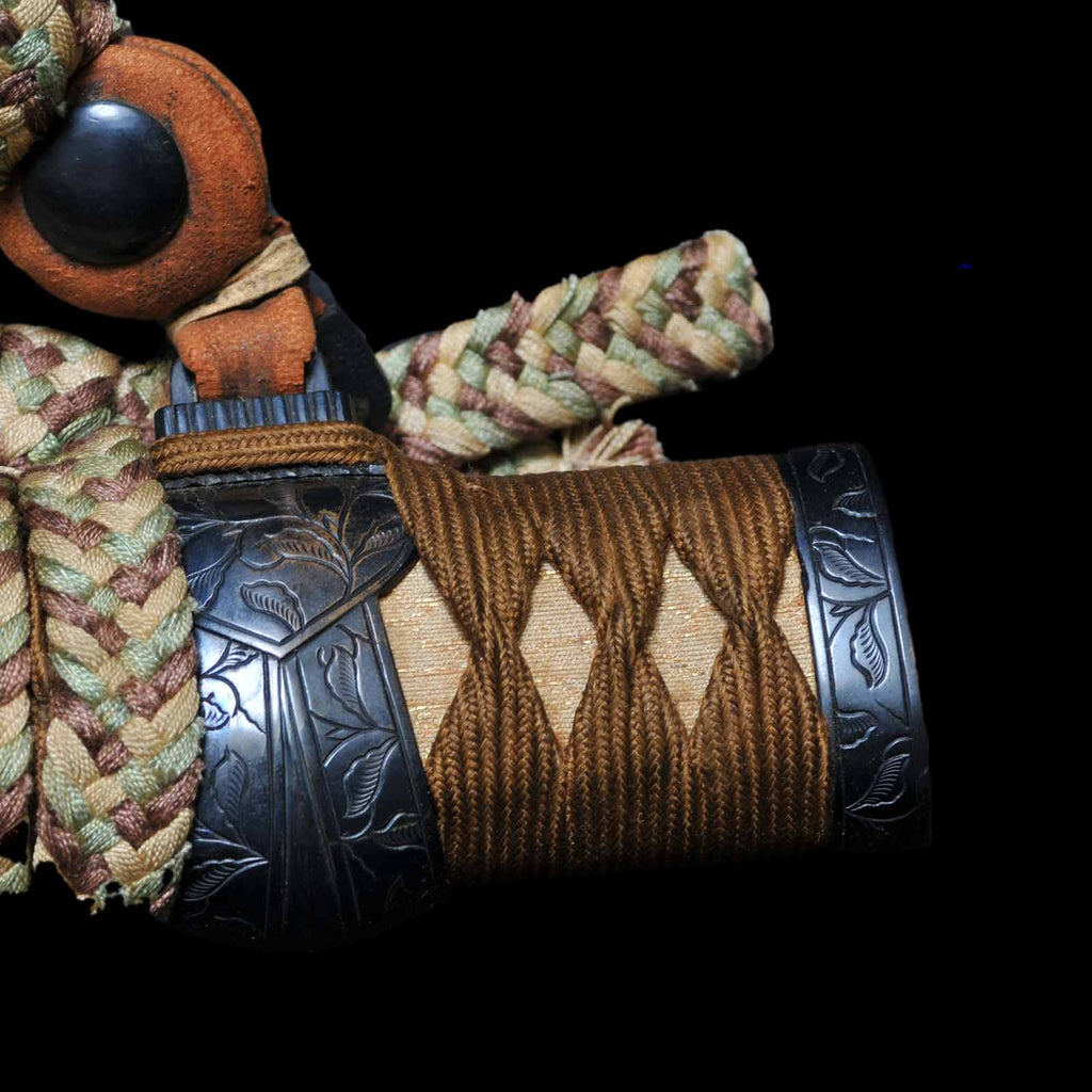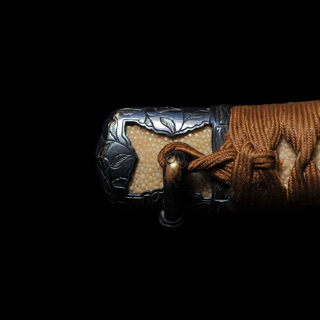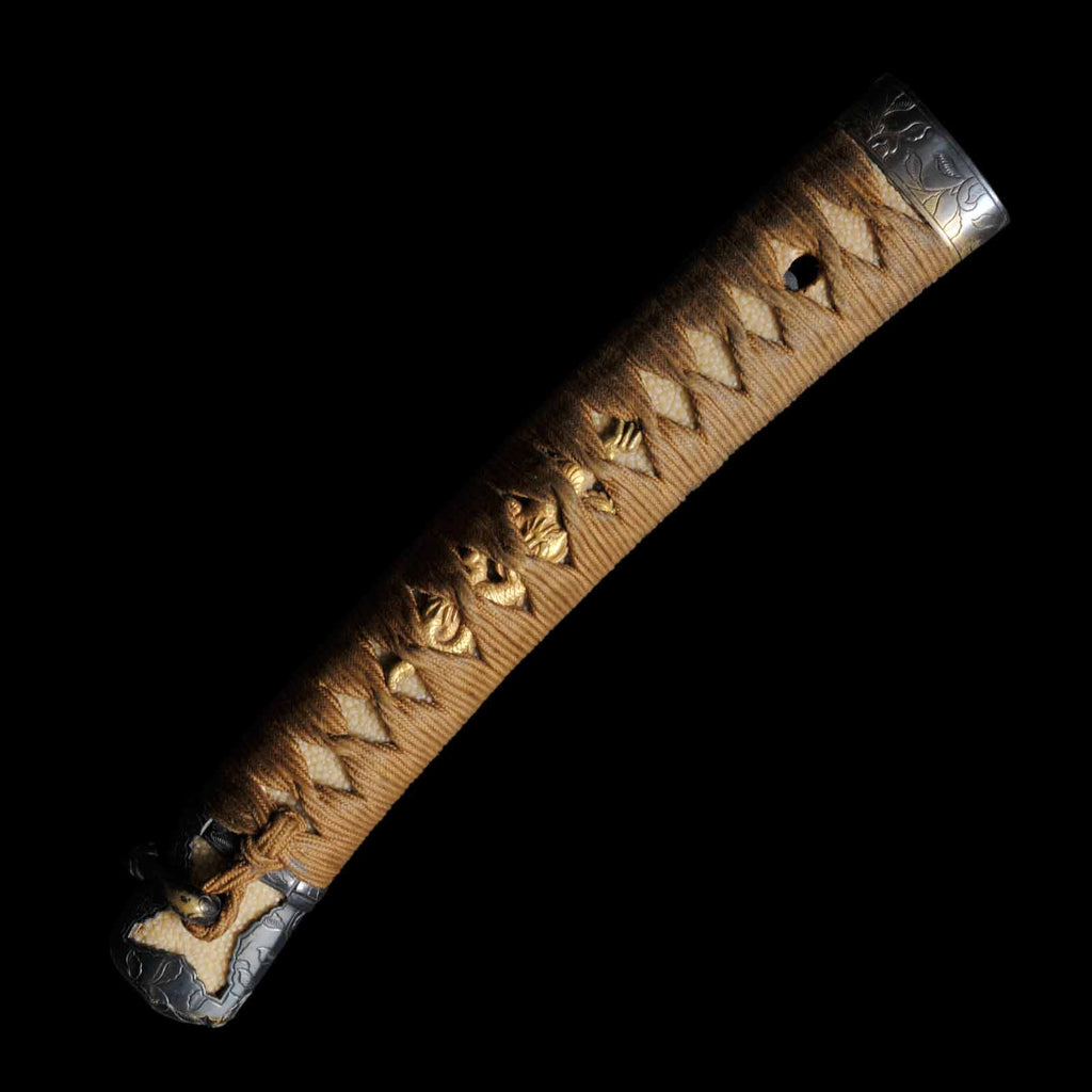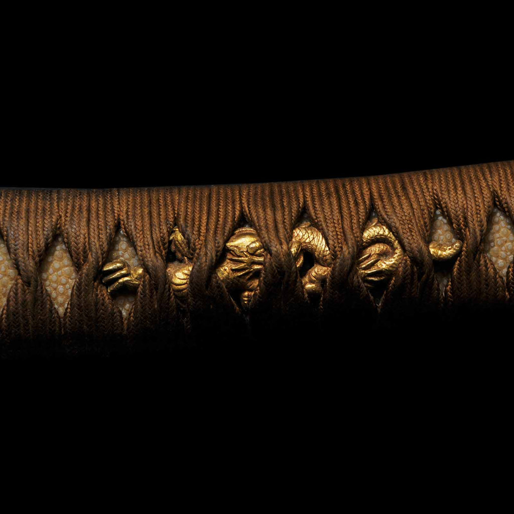 - Koshirae: Tachi Koshirae, brown silk wrapped Tsuka with Nashiji lacquered Saya