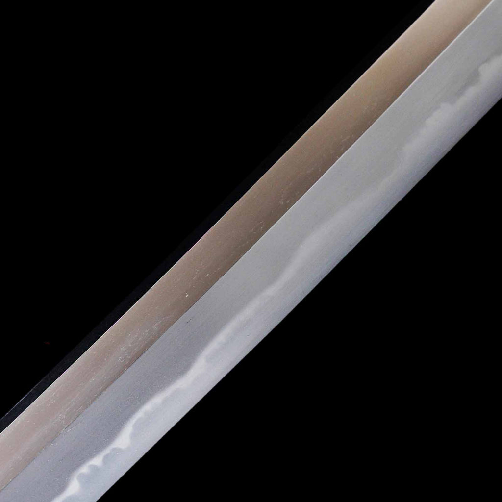 This set of katana and wakizashi was made at the same time as a daisho, in August of 1818. Both the katana and wakizashi are in extremely well-preserved condition, with no flaws, chips, or rust of any kind. The hada is a well-packed ko-itame with well visible chikei. The katana's hamon is choji-midare with active visible ashinaga choji and nie in the ha. The hamon of Wakizashi is also choji-midare, but the ashi are longer, reminiscent of a saw. The boshi of the katana is nakamaru in shape, and the boshi of the wakizashi is slightly omaru-like.