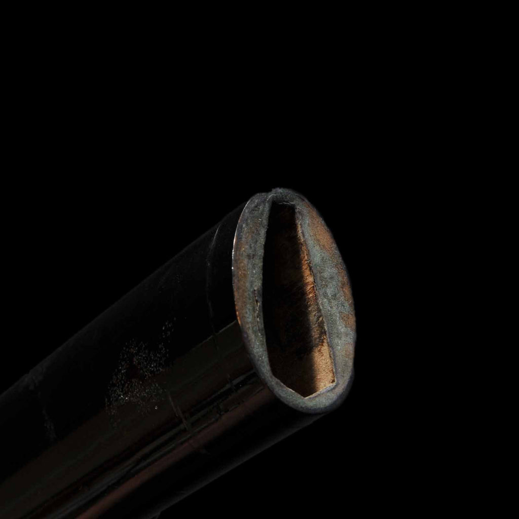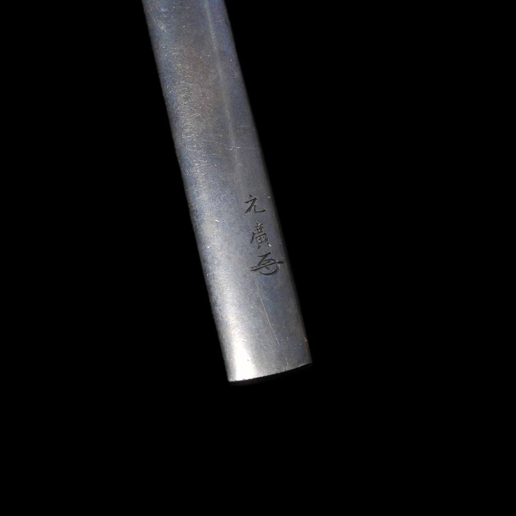 The koshirae are the same themed set for both katana and wakizashi, using the same fittings of the period. The wakizashi is also equipped with a kozuka. The tsuba is engraved with an inscription, and is the work of Masamitsu, an outstanding craftsman of the Suruga school in the Inaba region (present-day Tottori Prefecture) in the late Edo period. The tsuka-gashira is made of buffalo horn in the tensho style. Due to the passage of time, the tsukaito of the katana is frayed at the top of the tsuka-gashira. It is possible to rewrap the tsuka for an additional fee, so please contact us after purchase if you would like that option.