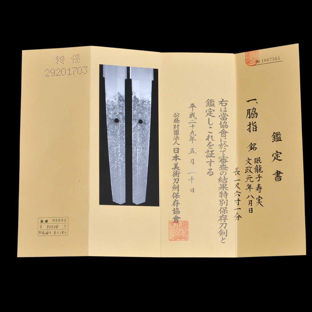 Due to the excellent state of preservation of both the katana and the wakizashi, the Society for Preservation of Japanese Art Swords has certified both the katana and the wakizashi as Tokubetsu Kicho and issued a certificate of authenticity for them as works of exceptional value to be preserved for future generations.