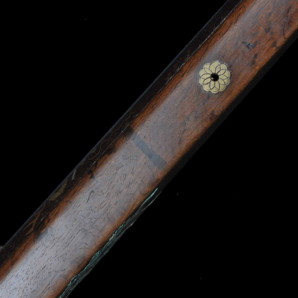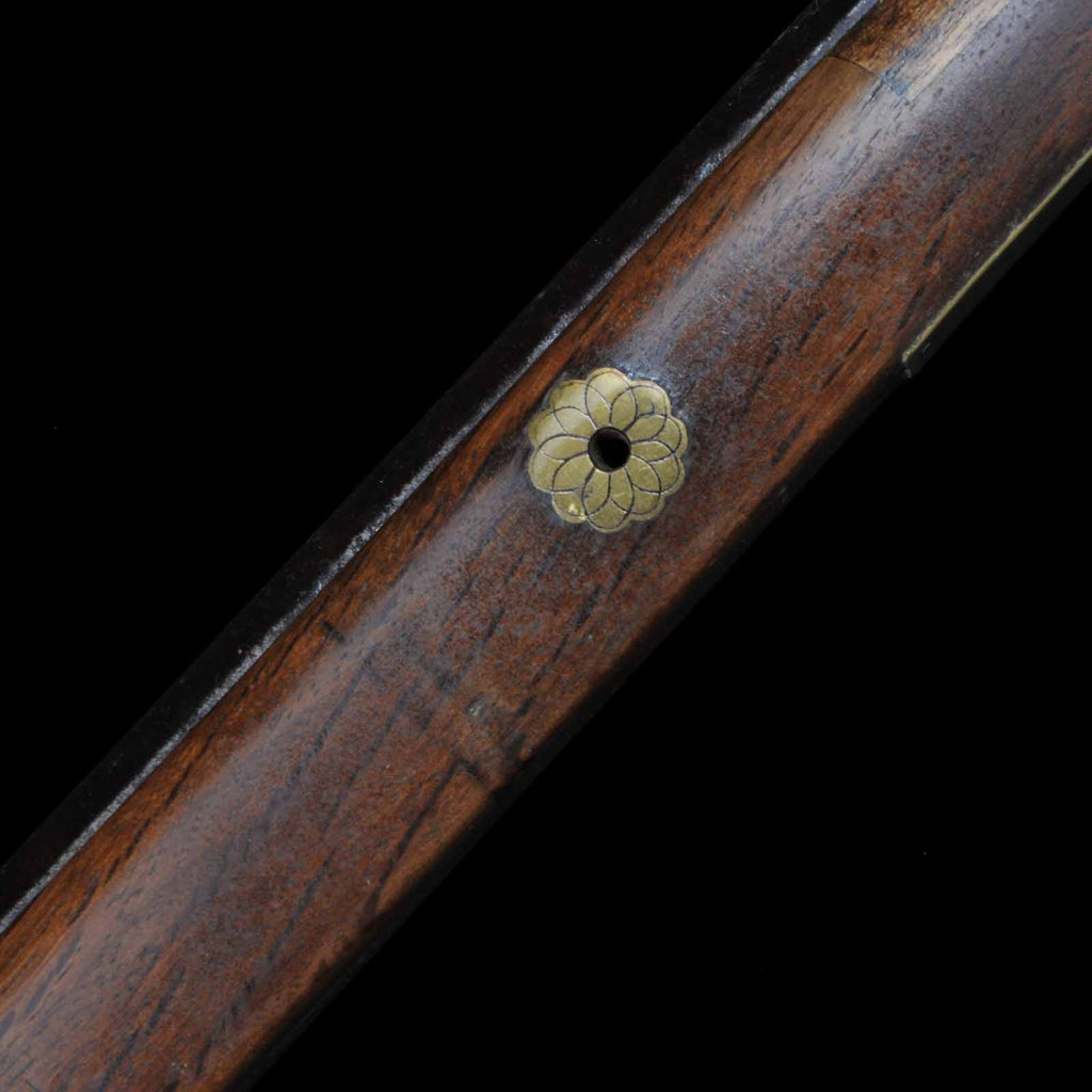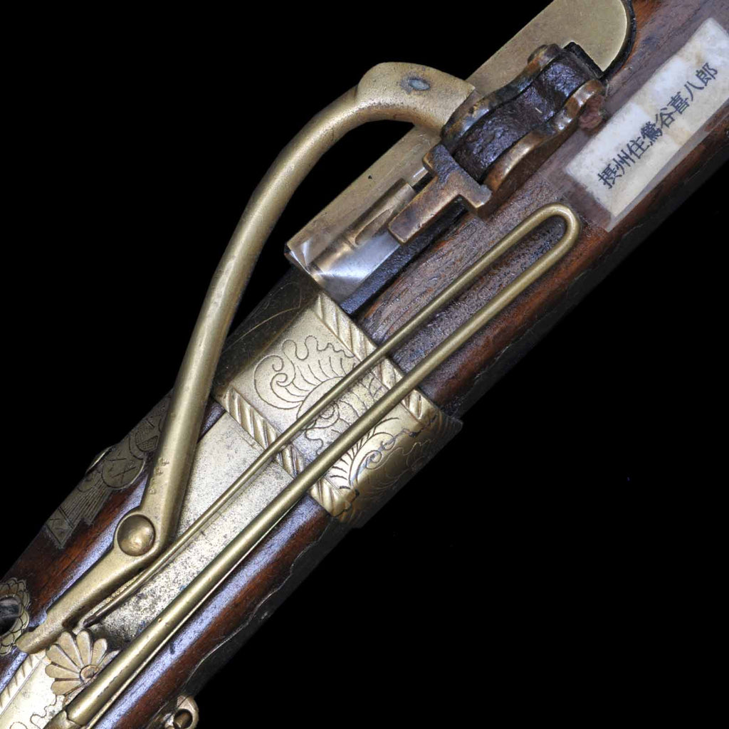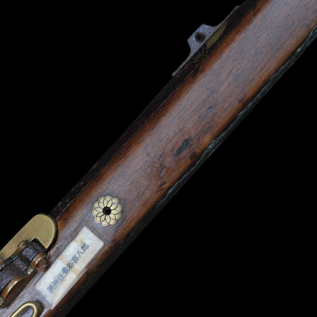 This gun was used for hunting and target shooting, with its slender barrel and base wood decorated with gorgeous ornaments throughout. The wooden part supporting the barrel is also decorated with a brass plate in the shape of a pine tree. His name can also be seen on the underside of the barrel. This is a gem that shows the characteristics of Sakai-zutsu in its various parts.