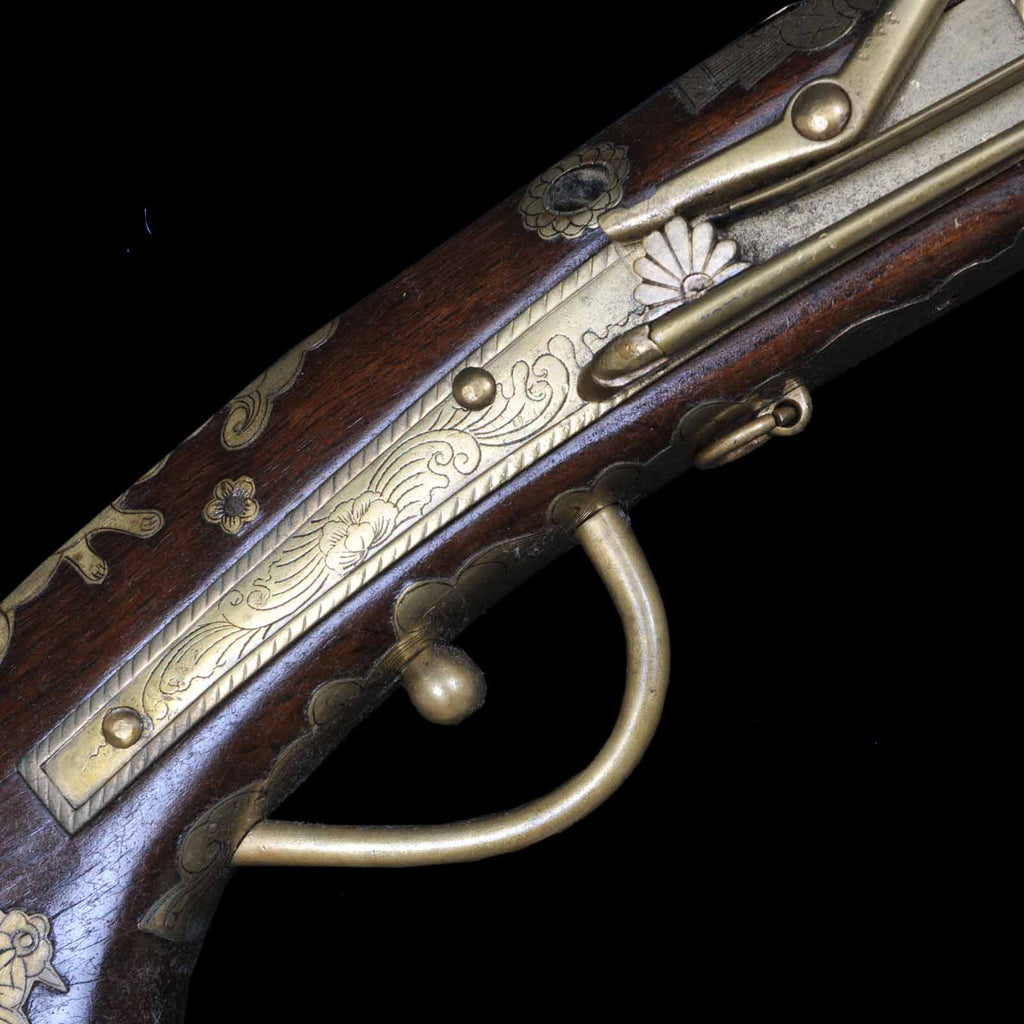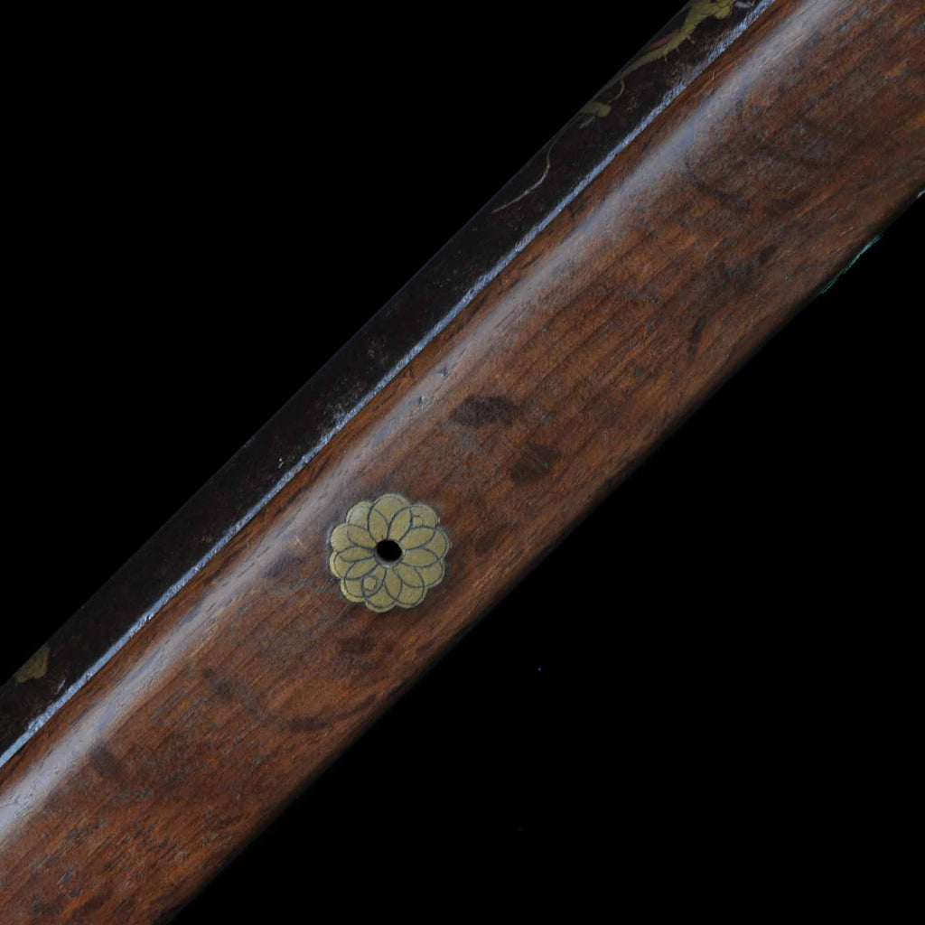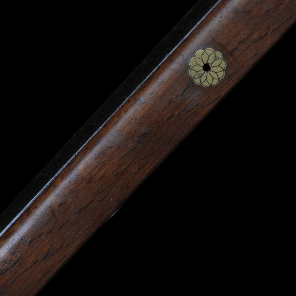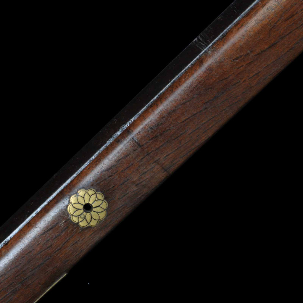 This gun was used for hunting and target shooting, with its slender barrel and base wood decorated with gorgeous ornaments throughout. The wooden part supporting the barrel is also decorated with a brass plate in the shape of a pine tree. His name can also be seen on the underside of the barrel. This is a gem that shows the characteristics of Sakai-zutsu in its various parts.