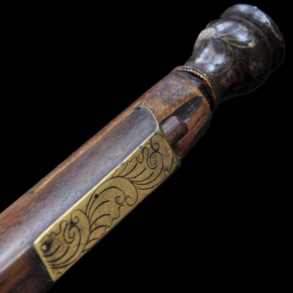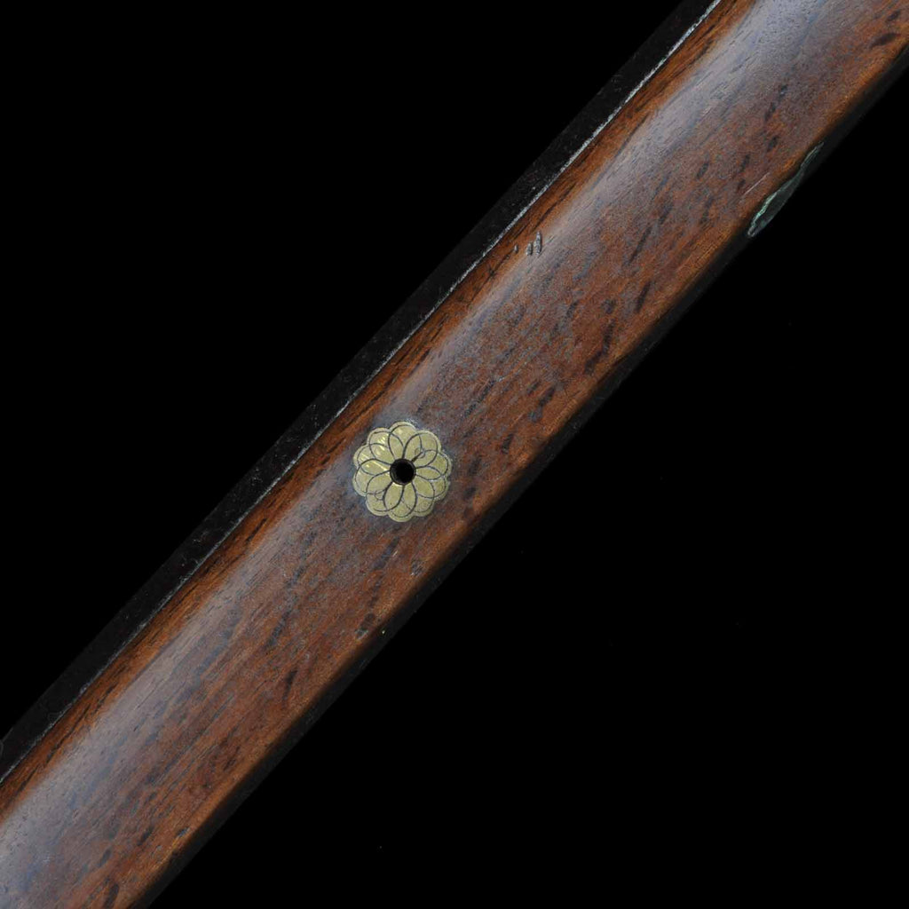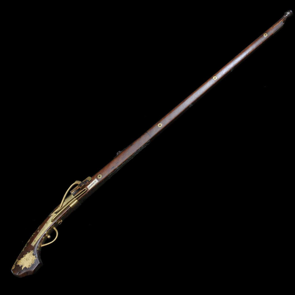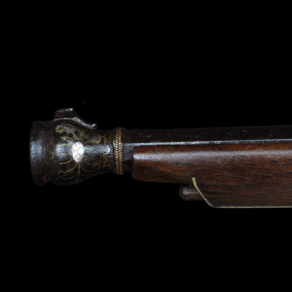 This gun was used for hunting and target shooting, with its slender barrel and base wood decorated with gorgeous ornaments throughout. The wooden part supporting the barrel is also decorated with a brass plate in the shape of a pine tree. His name can also be seen on the underside of the barrel. This is a gem that shows the characteristics of Sakai-zutsu in its various parts.