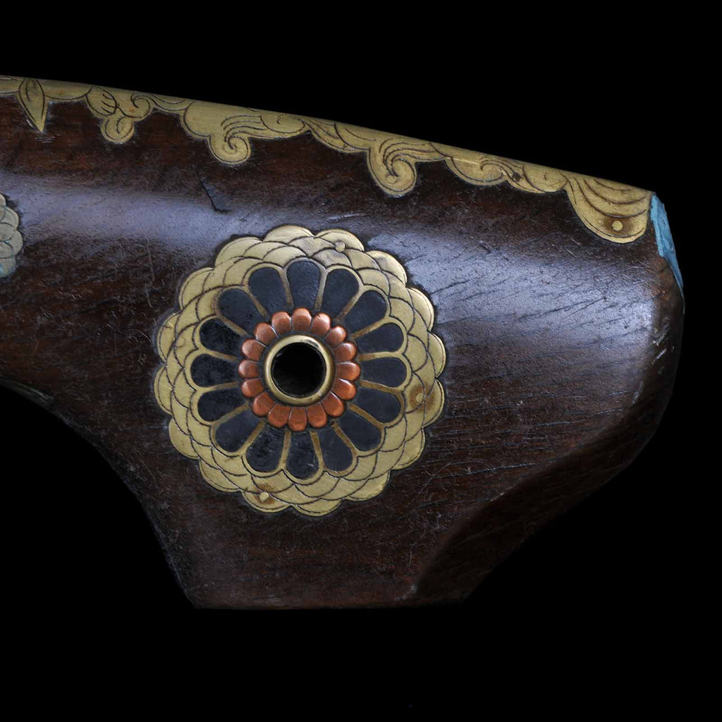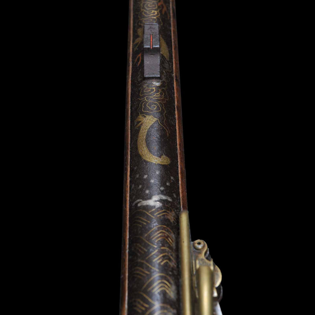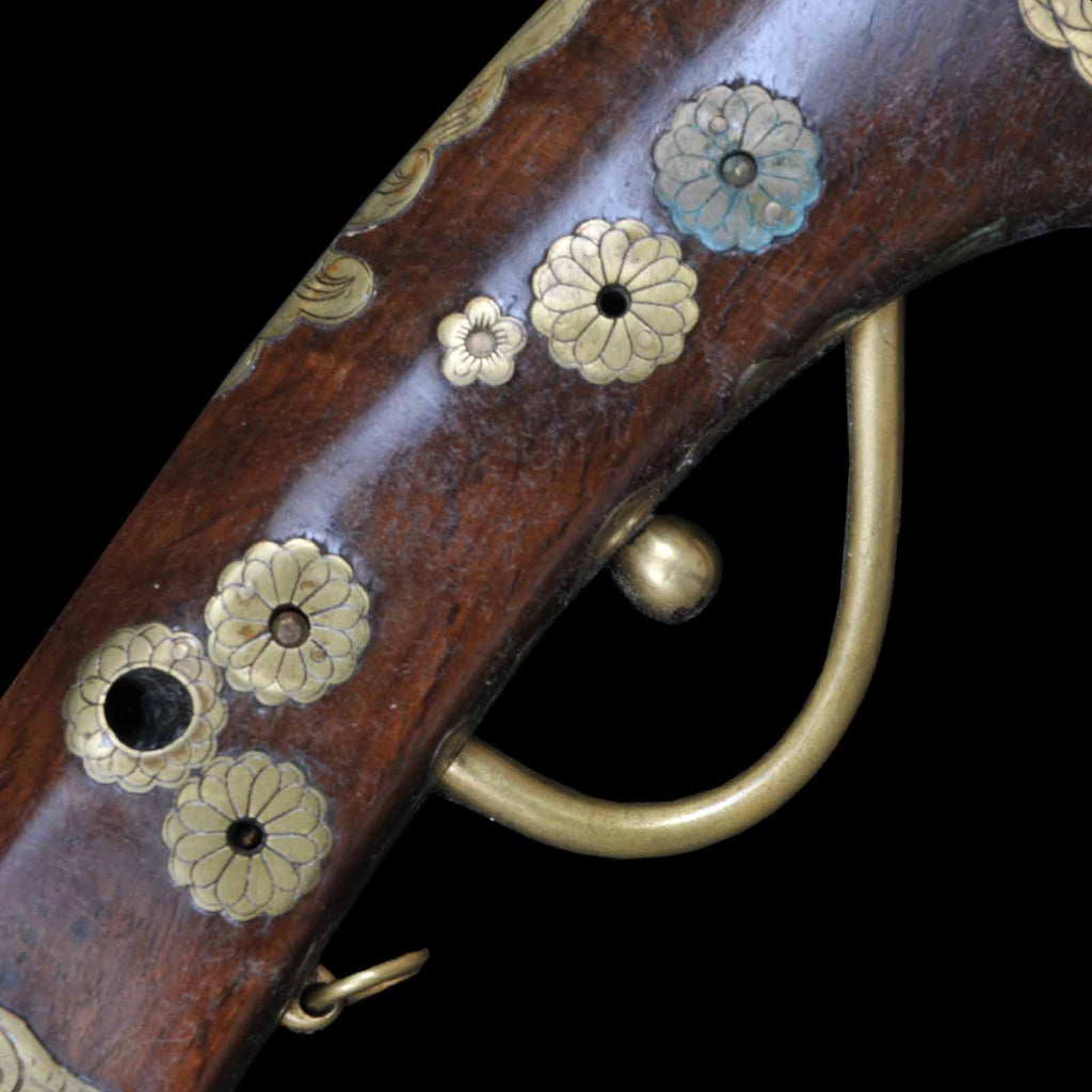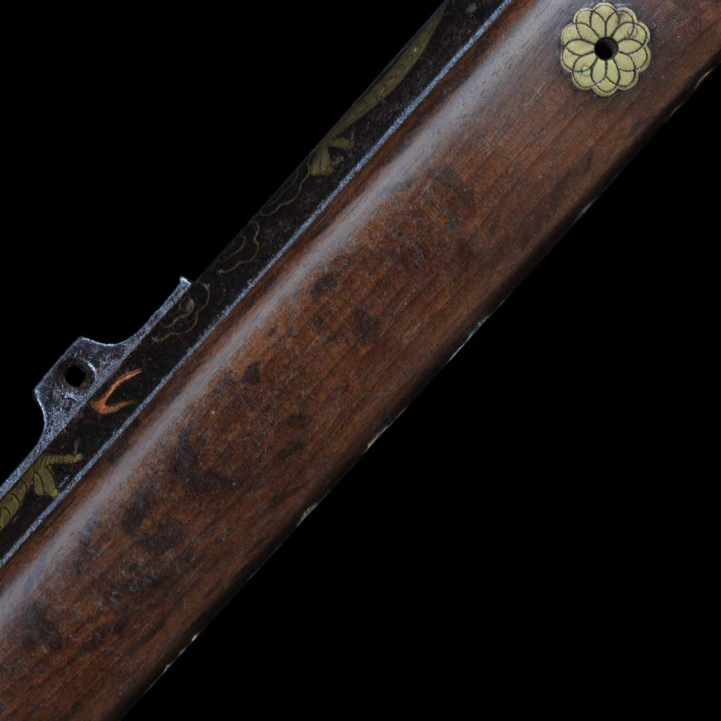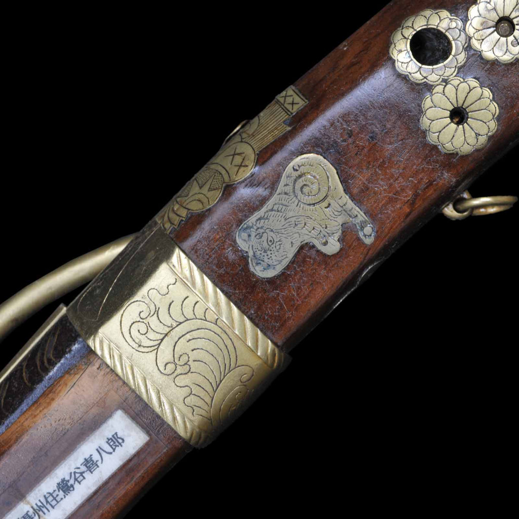 Tsutaya Kihachiro, who crafted this matchlock gun, was a gunsmith active in Sakai, Settsu (present-day Sakai City, Osaka Prefecture). Sakai was the main production center of firearms in Japan after guns were introduced from Portugal to Tanegashima Island in Kagoshima in 1543. The guns made in this region are called sakai-zutsu, and are characterized by their slender barrels and ornate decorations.