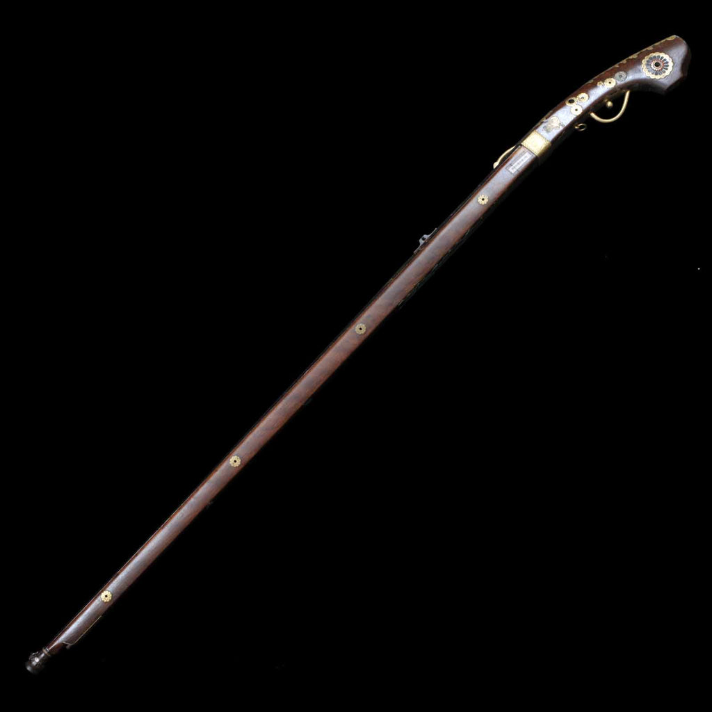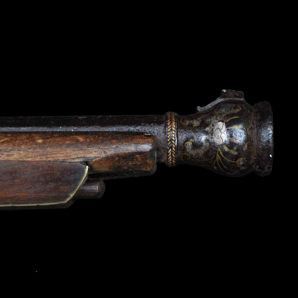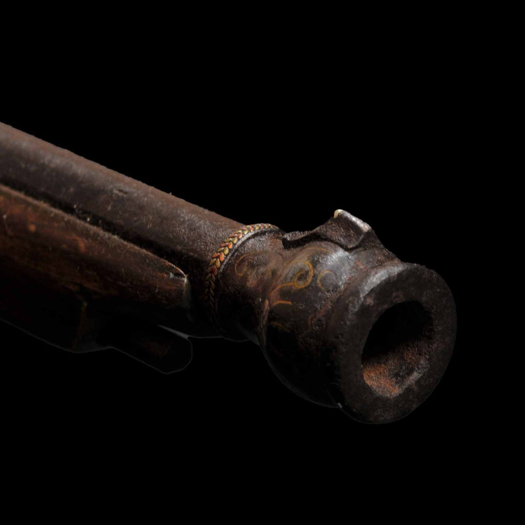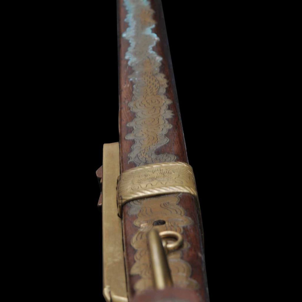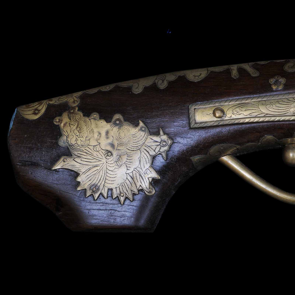 Tsutaya Kihachiro, who crafted this matchlock gun, was a gunsmith active in Sakai, Settsu (present-day Sakai City, Osaka Prefecture). Sakai was the main production center of firearms in Japan after guns were introduced from Portugal to Tanegashima Island in Kagoshima in 1543. The guns made in this region are called sakai-zutsu, and are characterized by their slender barrels and ornate decorations.
