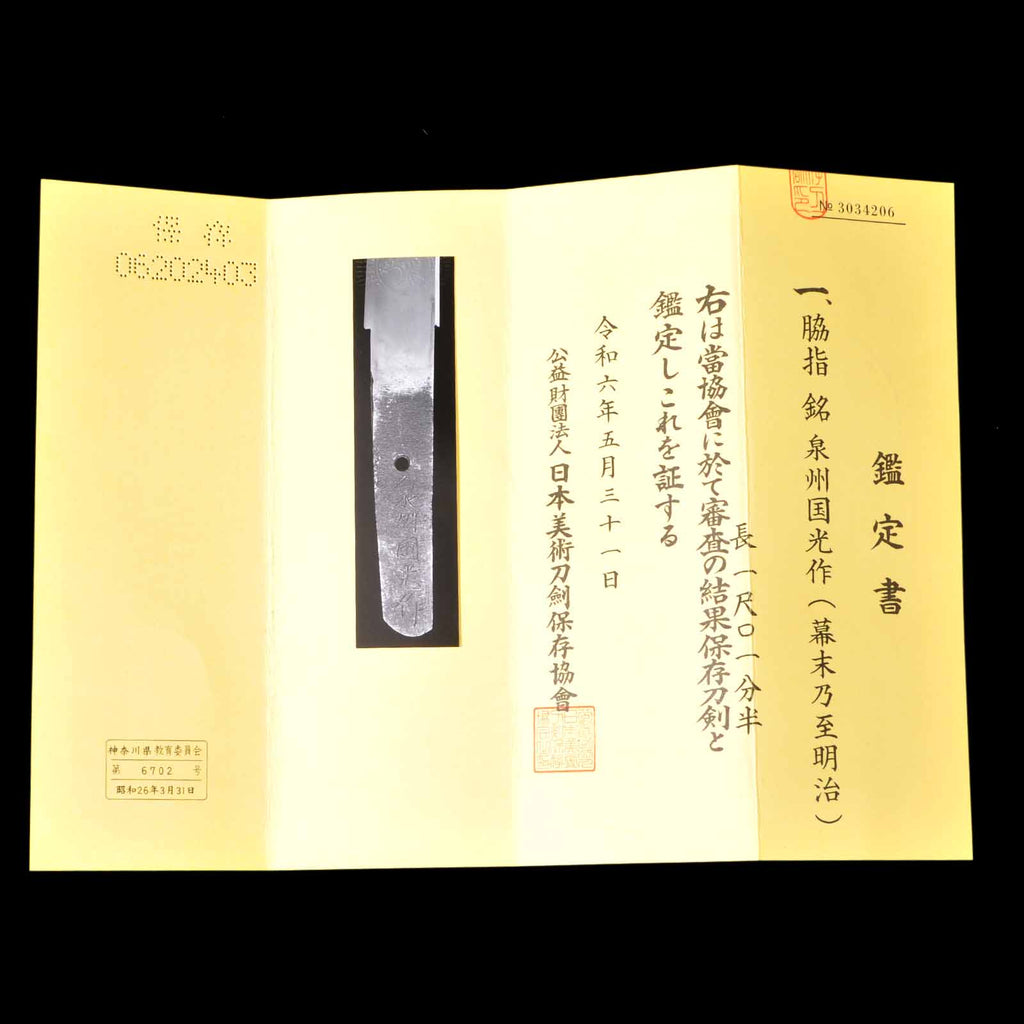 Senshu refers to the area corresponding to the southwestern part of Osaka today, and Kunimitsu was a swordsmith active from the late Edo period to the Meiji era, as noted in the certificate of authenticity.