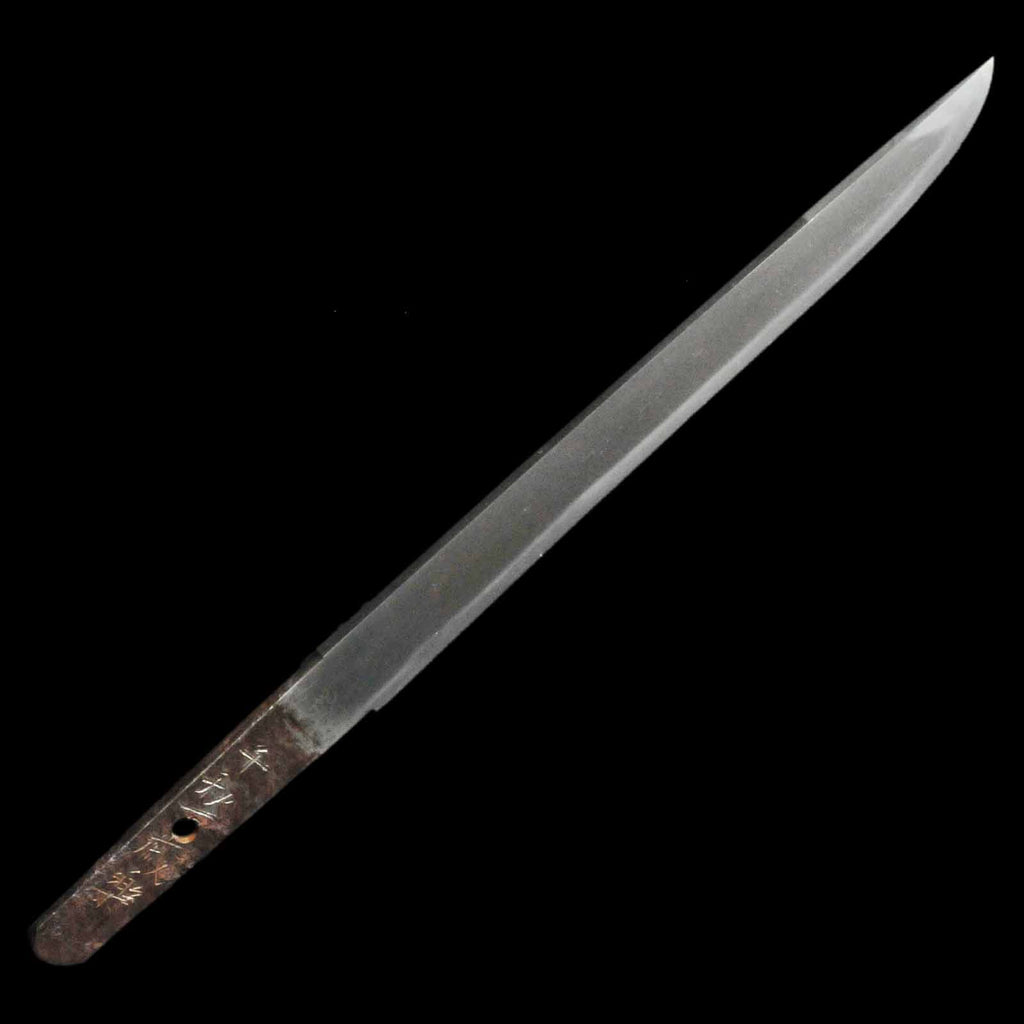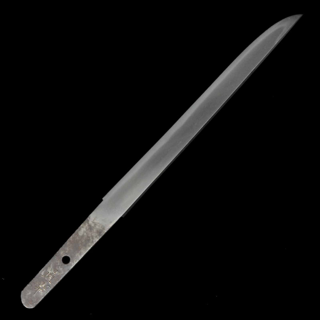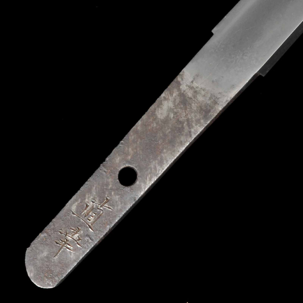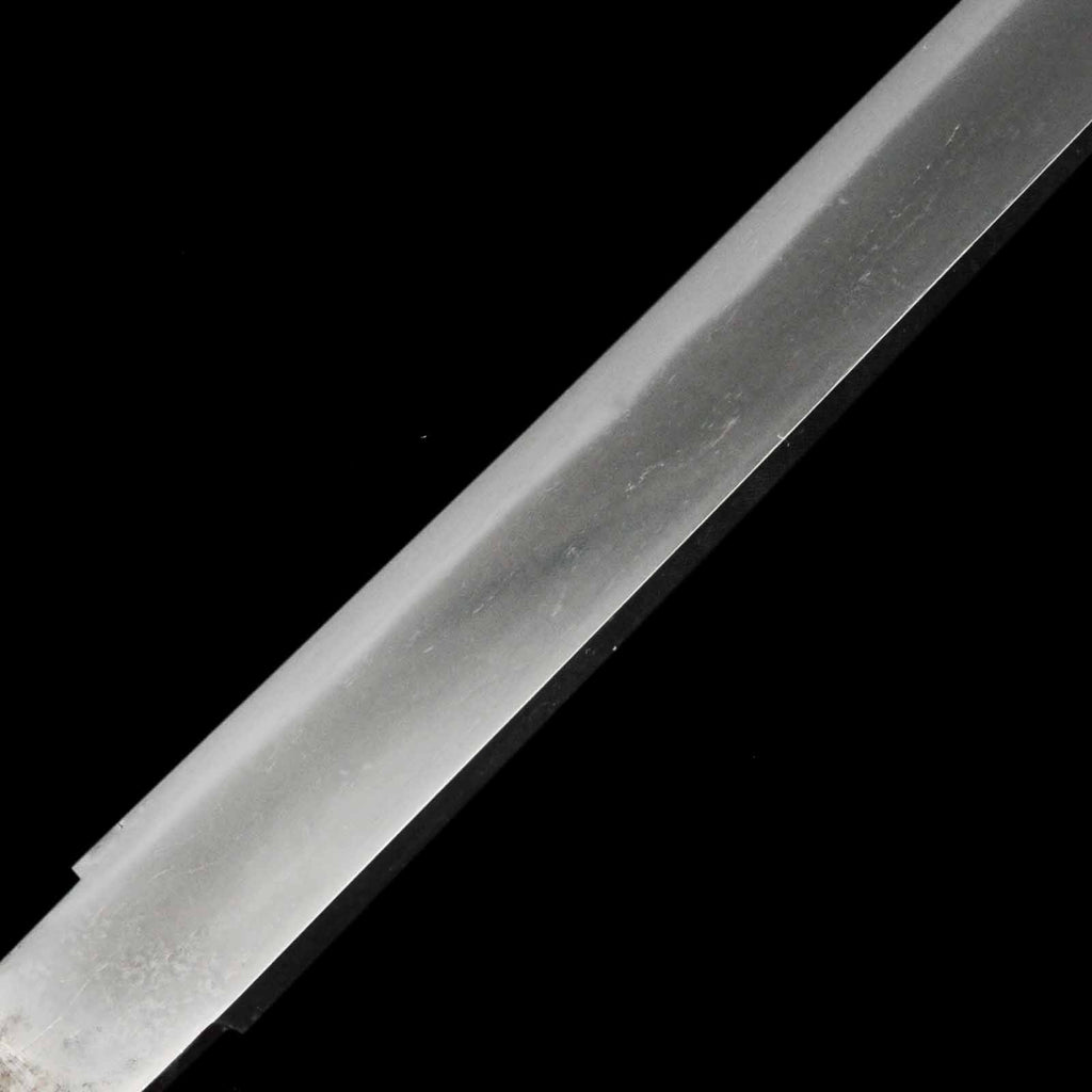 The sword is in very good condition with no faults such as flaws, rust, or chips. The jigane is itame hada and overall niedeki. The hamon is a practical, thin suguha that is both tense and elegant. The nakago is engraved with the inscription “Naoyuki” on the front and “Senshu Banzairaku” on the back. Naoyuki was a swordsmith of the Dotanuki school that flourished in the Higo region of Kyushu and was active at the end of the Edo period.