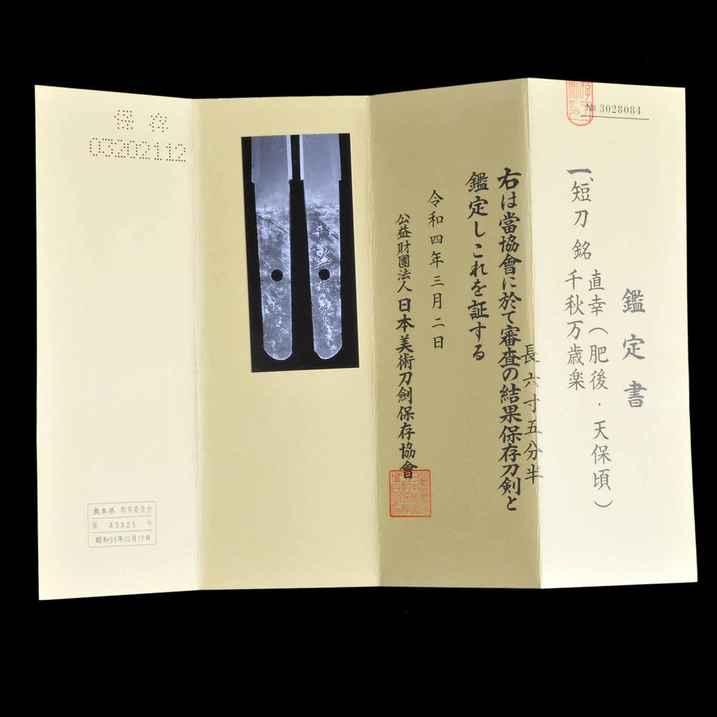 "Senshu Banzairaku” means a celebration of longevity and prosperity, and this dagger set was made as a celebratory gift for good fortune; in 2022, the Society for Preservation of Japanese Art Swords recognized the hozon and issued a certificate for it as a work worthy of preservation for future generations.