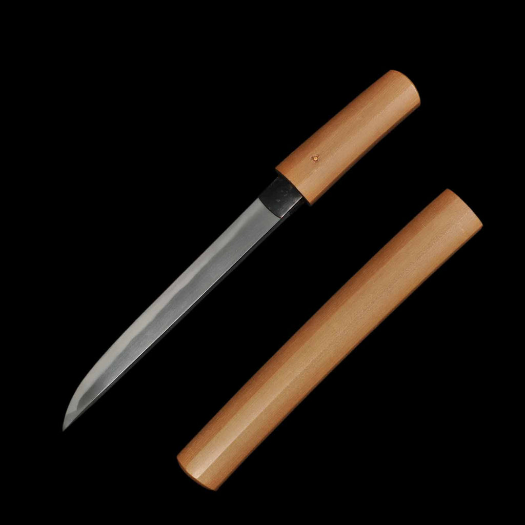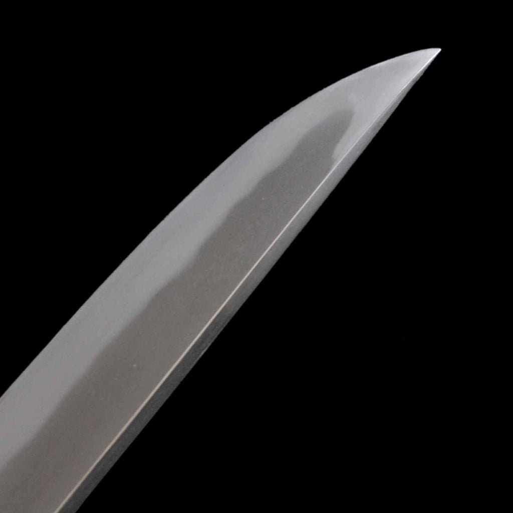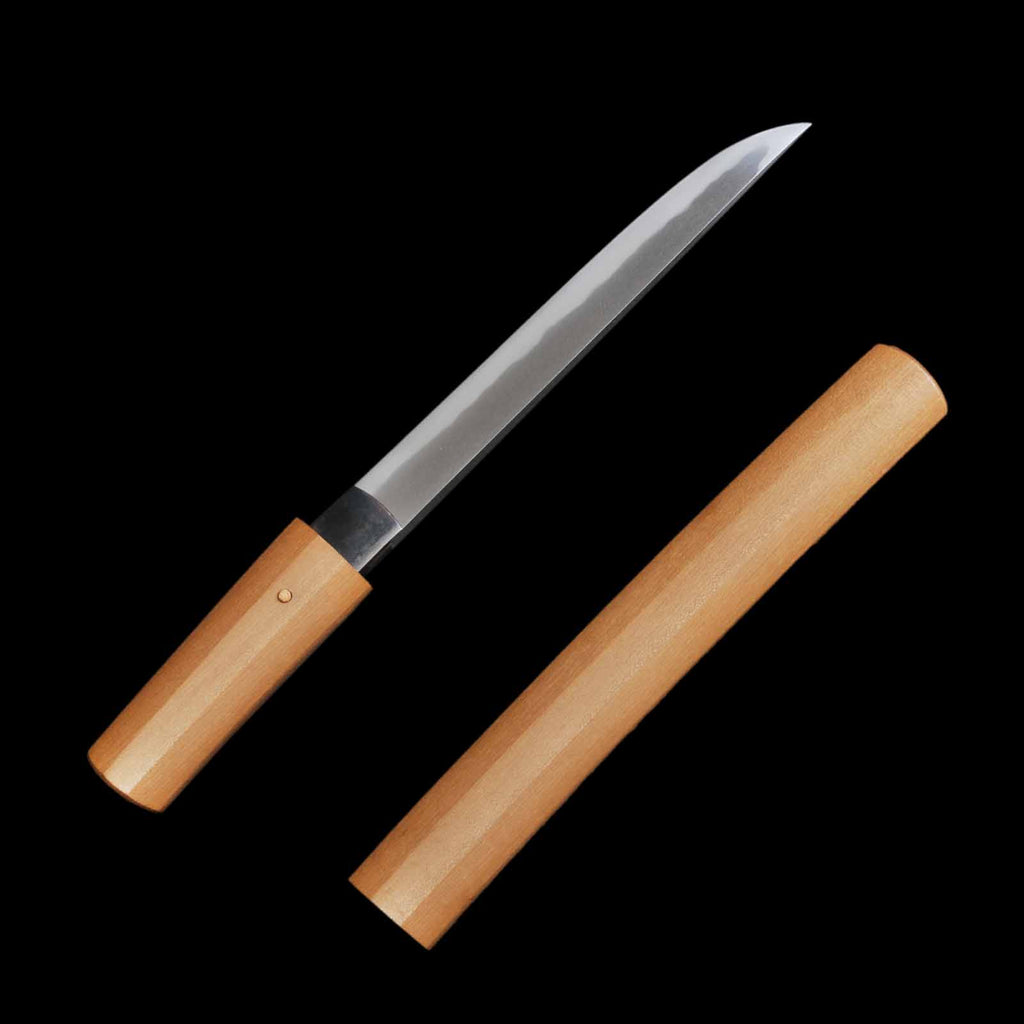 This small dagger has a very unique kogaramaru-zukuri, or kissaki-morohazukuri dagger.