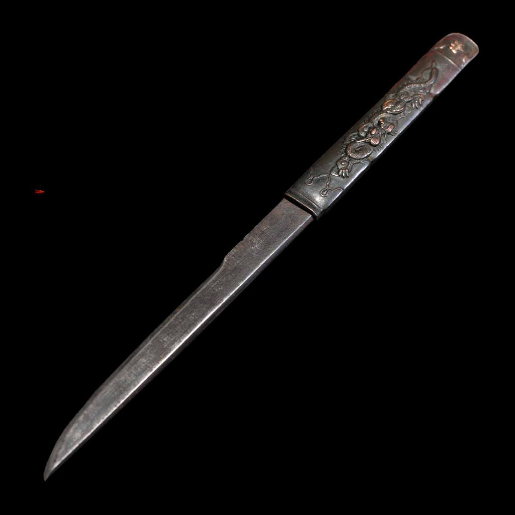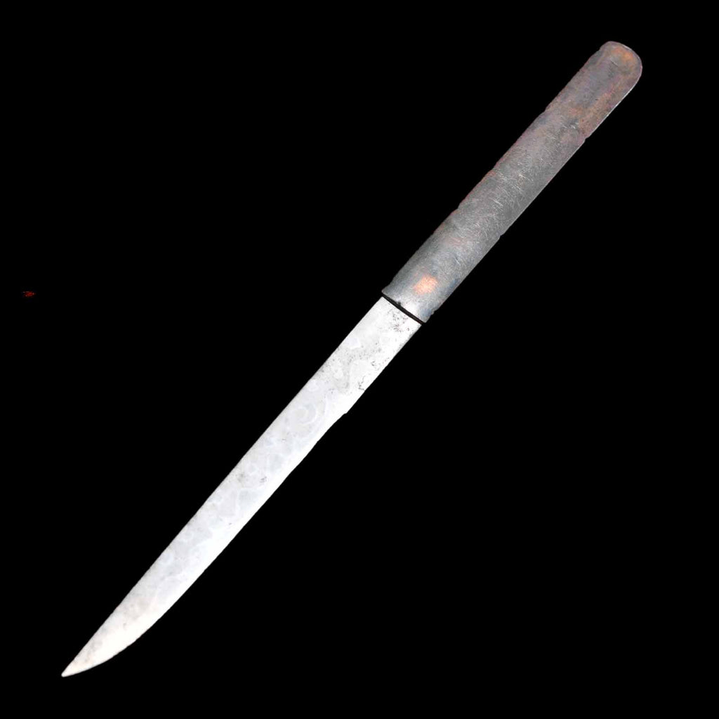 A very beautiful tanto koshirae equipped with a kozuka has just arrived. The signature is engraved as having been made by Suketomo in February 1854. Suketomo, whose real name was Naoe Shingoro, and his father was a swordsmith named Sukemasa. Suketomo is also said to have been a disciple of Suishinshi Masahide, one of the leading swordsmiths of the late Edo period. Suketomo, together with his father, Sukemasa, demonstrated swordsmithing before Tokugawa Nariakira, the real father of Yoshinobu Tokugawa, the 15th shogun. He also presented sharp katanas to the 12th shogun, Ieyoshi Tokugawa, 14 times over a two-year period. Nariakira also possessed the skill of making katanas and had a swordsmith name of Rekko. And in 1839, Suketomo was taught the secret Nariakira technique called Yagumo Kitae directly from Rekko himself.