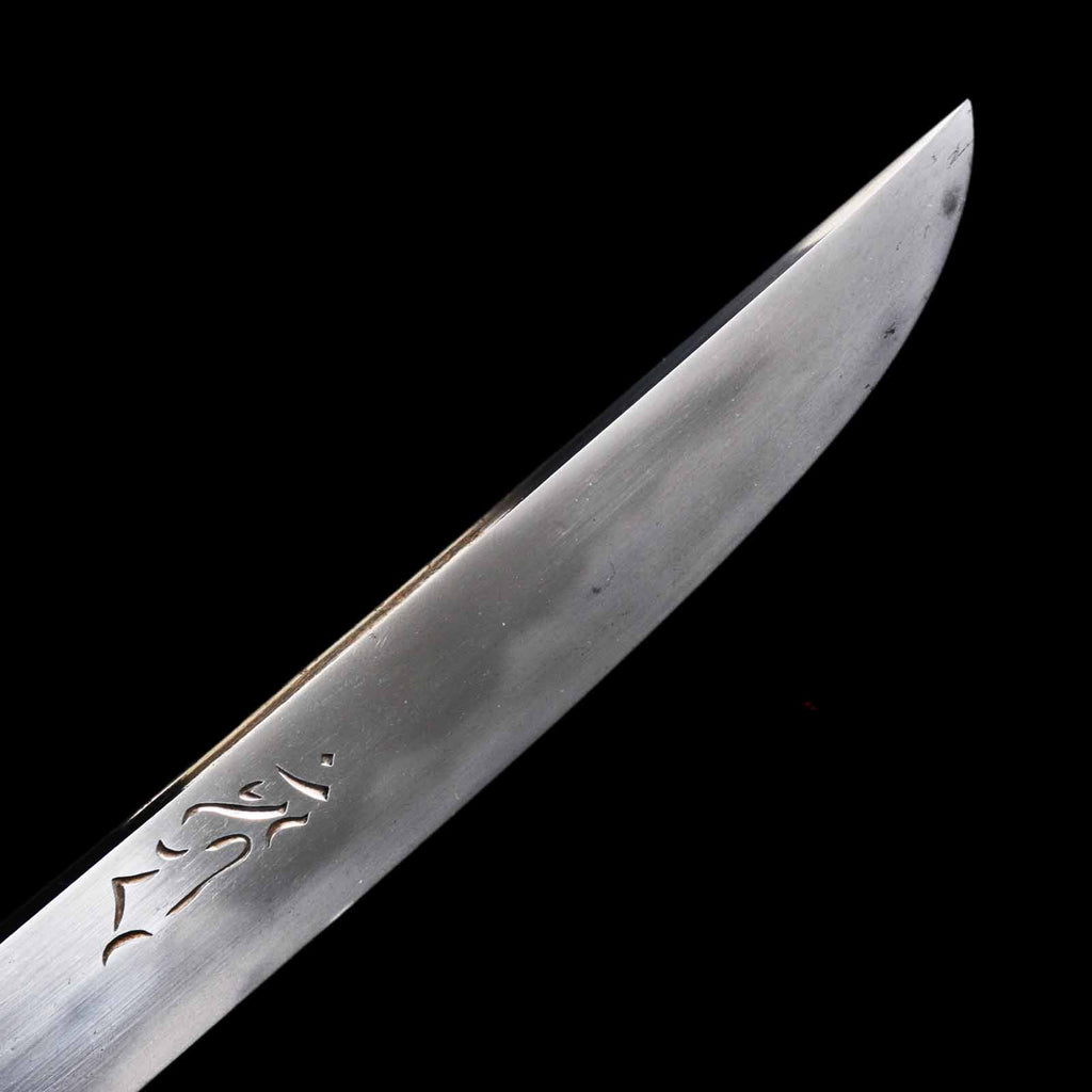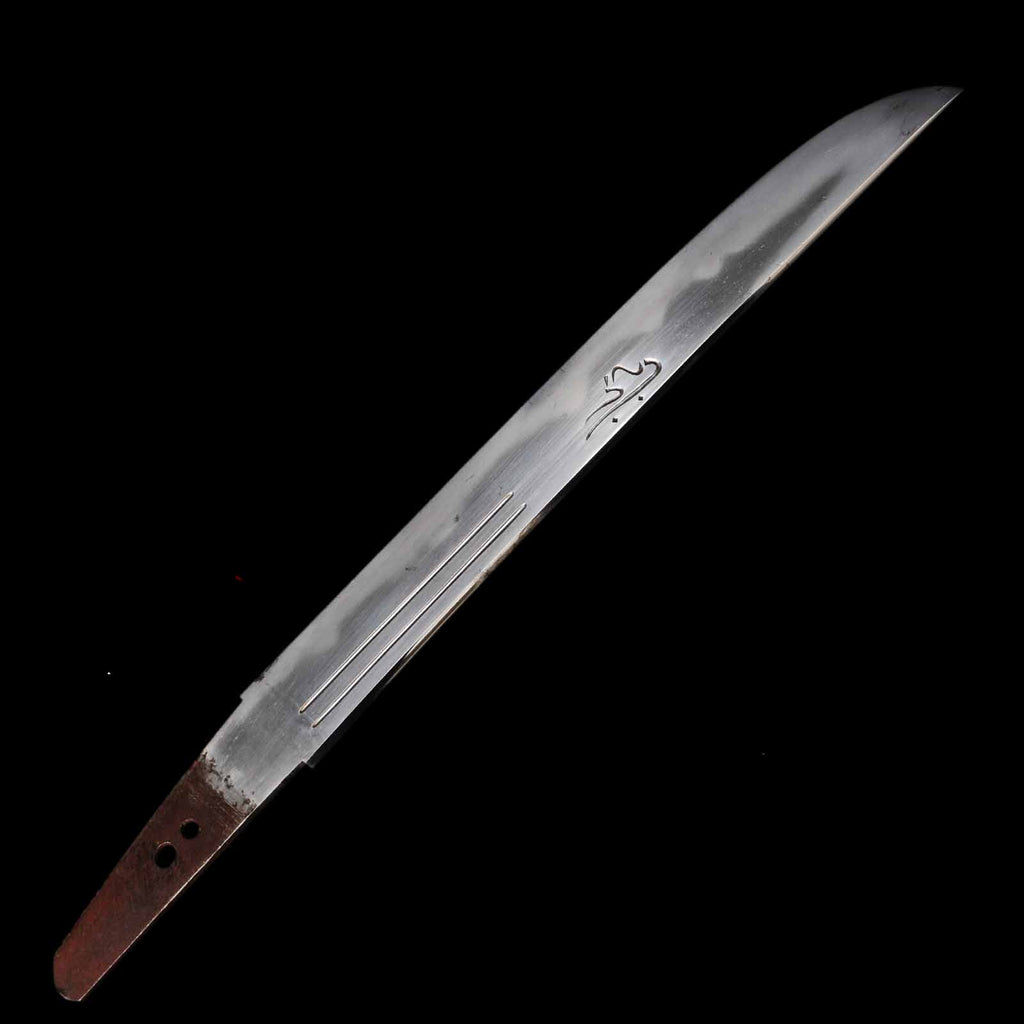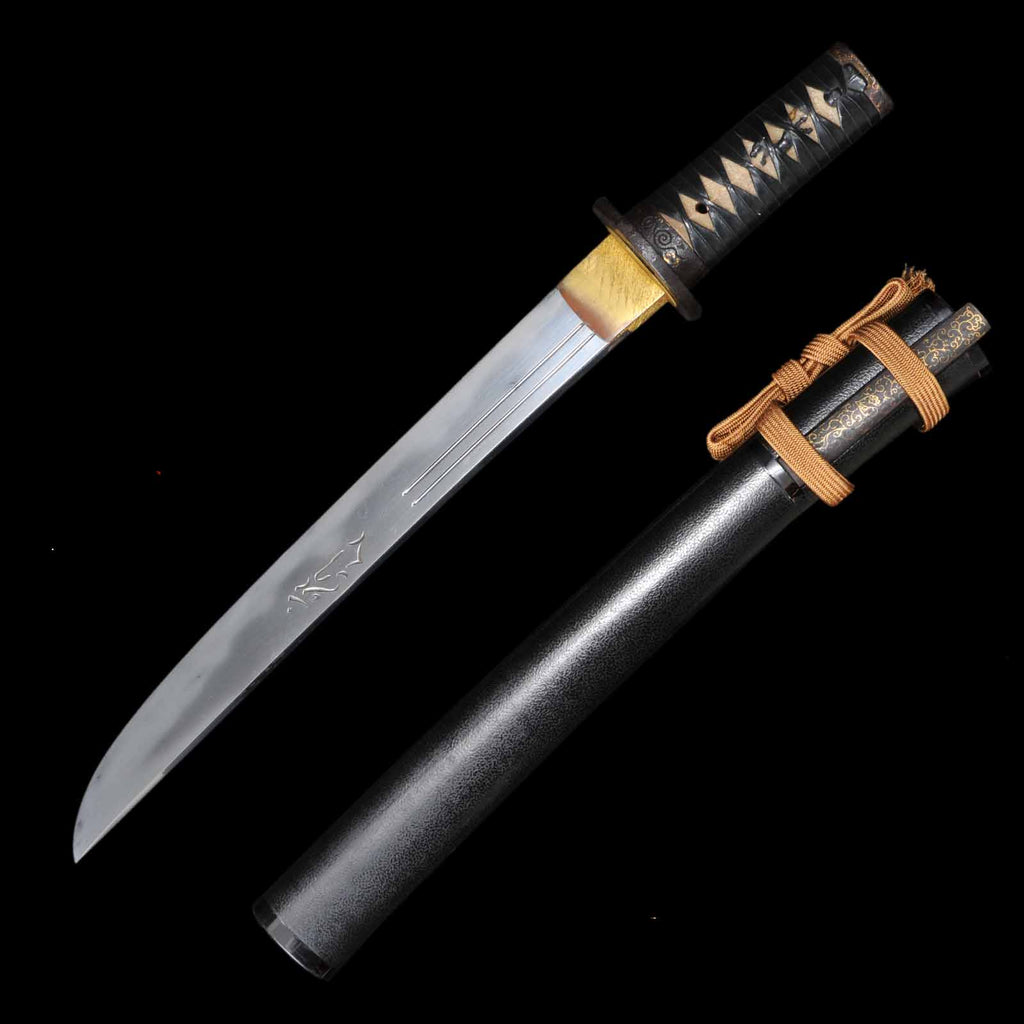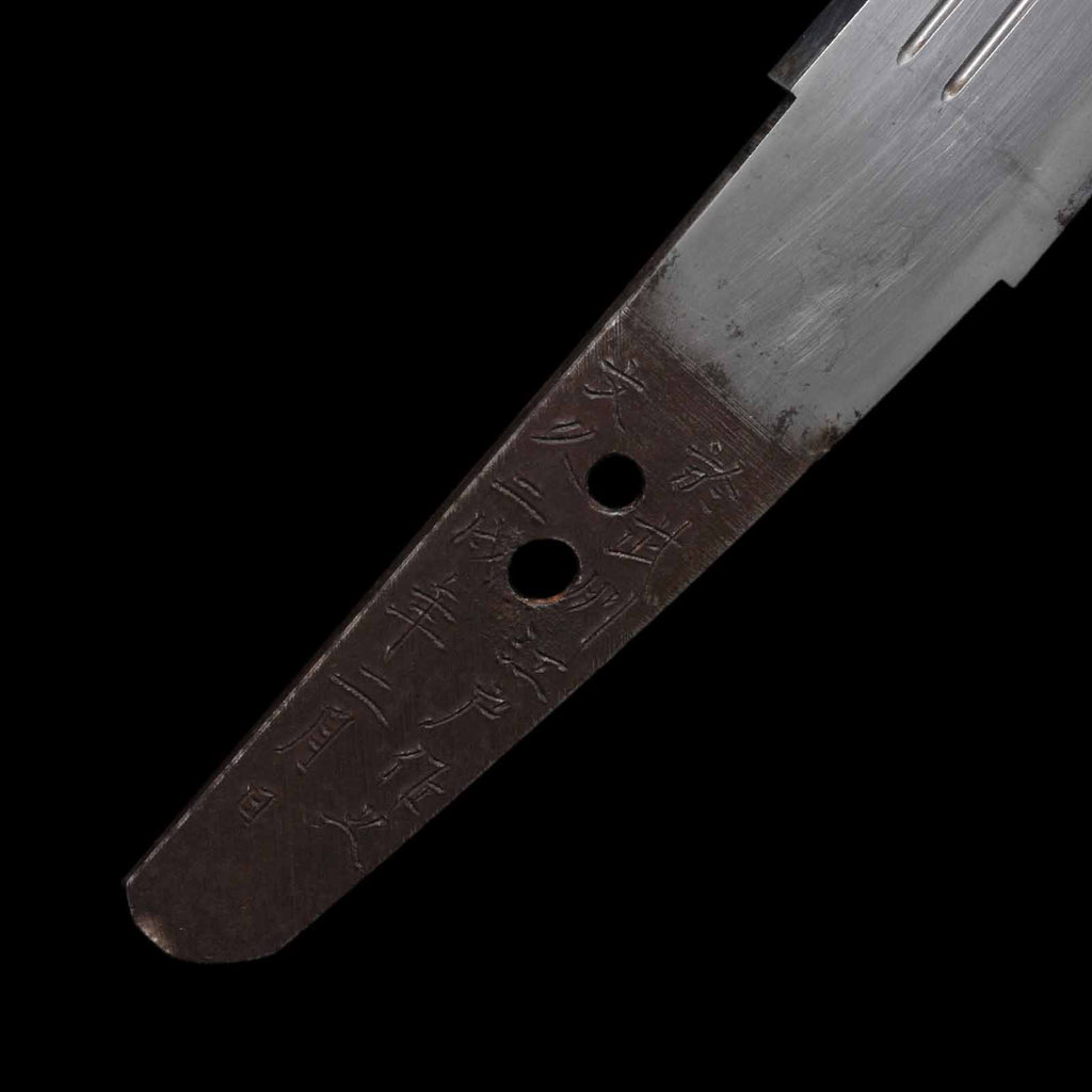The koshirae is tanto style, with a tsuba and a black leather tsukaito in the style of a tsumami-maki. All fittings is of the period, including the kozuka. The Ishime-style scabbard lacquer is decorated with Ichimoji characters.