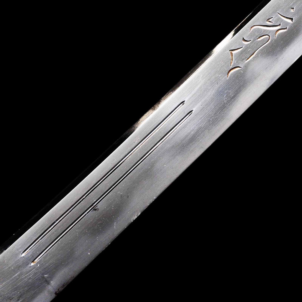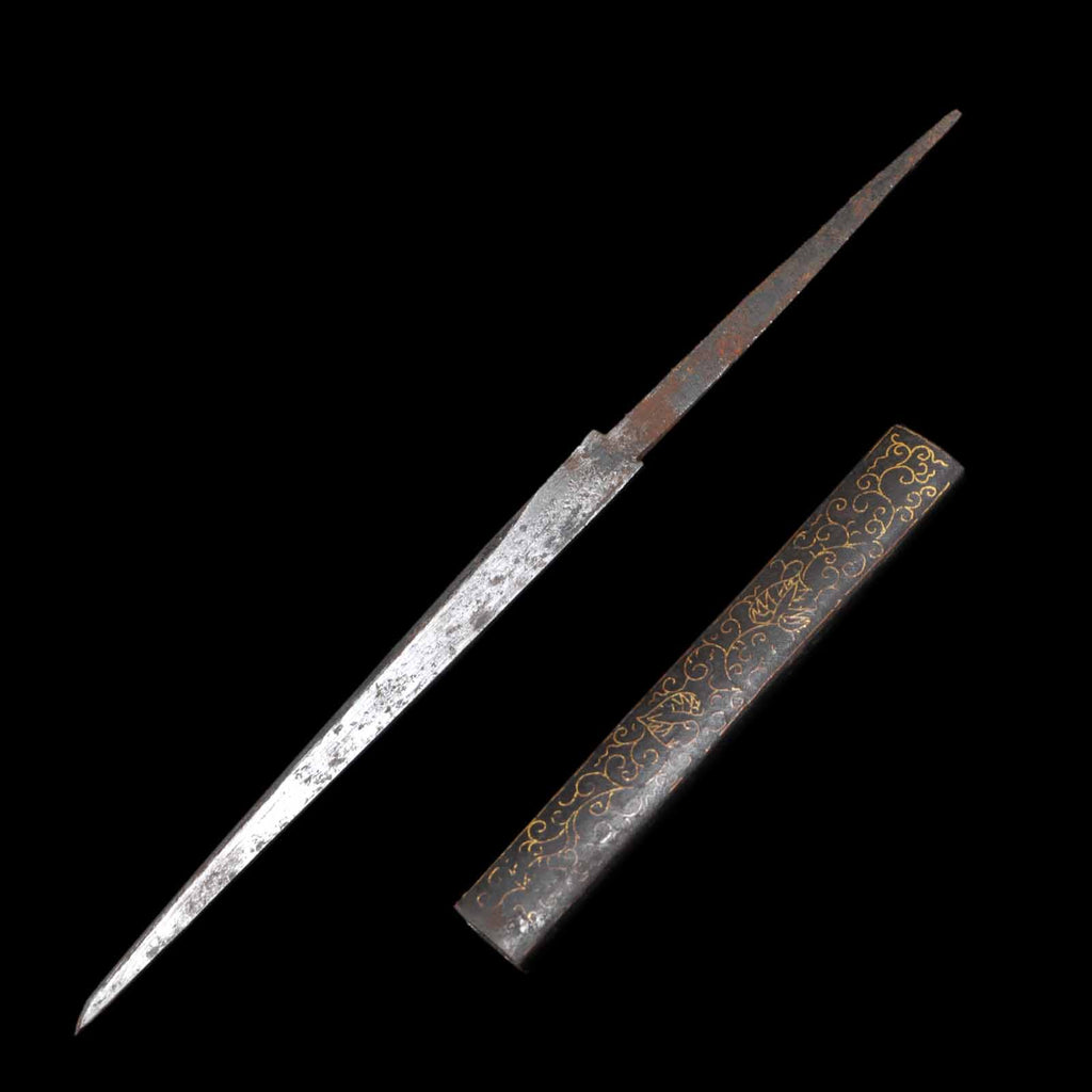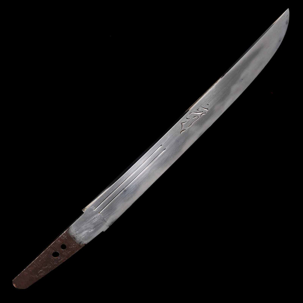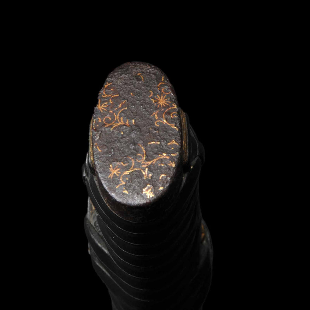 The koshirae is tanto style, with a tsuba and a black leather tsukaito in the style of a tsumami-maki. All fittings is of the period, including the kozuka. The Ishime-style scabbard lacquer is decorated with Ichimoji characters.
