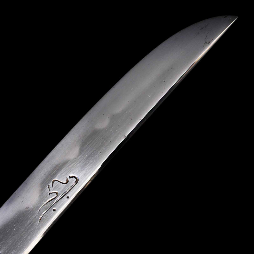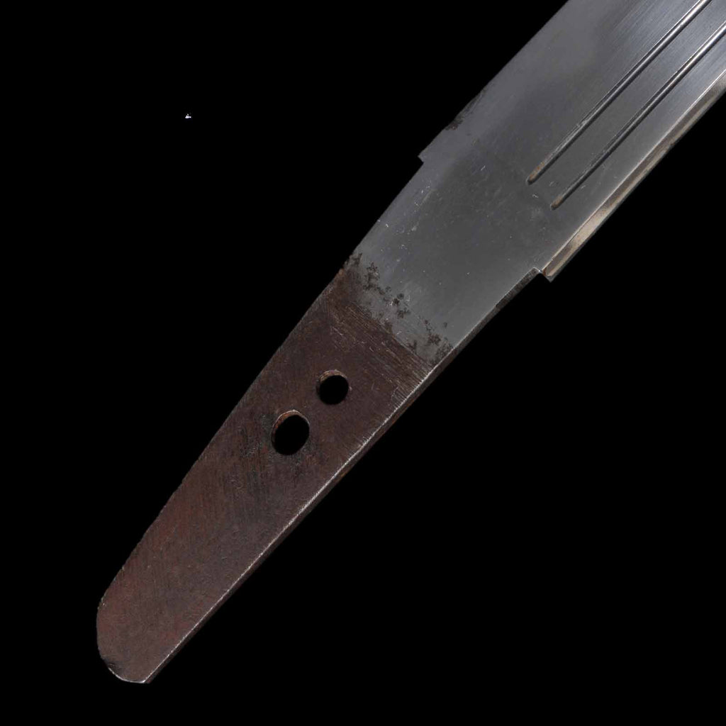 The sword is in very good condition with no chips, flaws or dents, but there are some light rust spots. There is also some light rust on the mine. Gomabashi and Sanskrit characters are engraved on both sides of the sashiomote and sashiura, the Sanskrit characters represent Senju Kannon (thousand-armed Goddess of Mercy) and Fudo Myo-o(Acala). The jigane of itame hada is decorated with the hamon of niedeki gunome midare. On the sashiura side of the nakago, the inscription "I made this in Edo, Bushu district, in the second month of the second year of the Bunkyu period" suggests that this piece was made in February 1862.