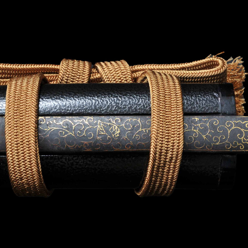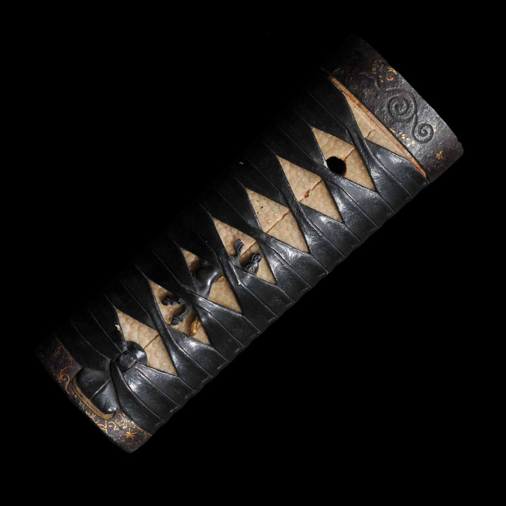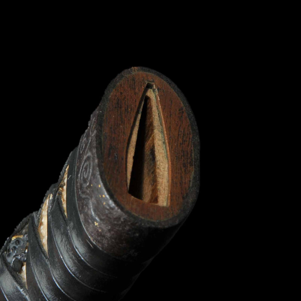 - Koshirae: Black leather wrapped Tsuka with Kuro-ishime lacquered Saya
