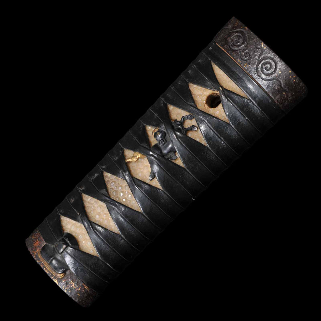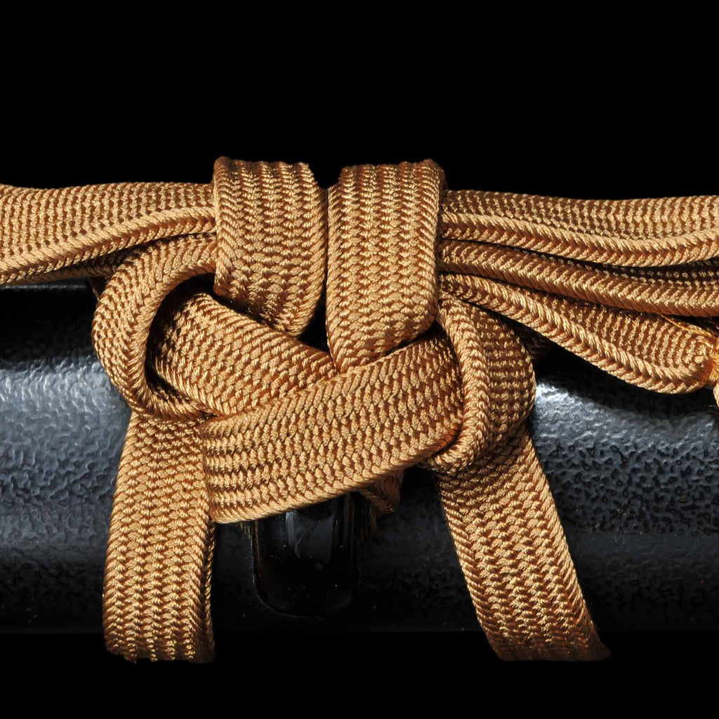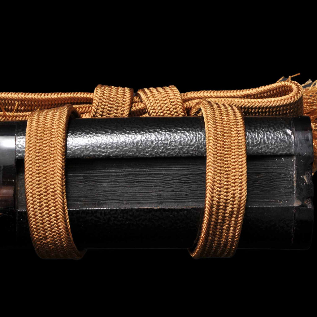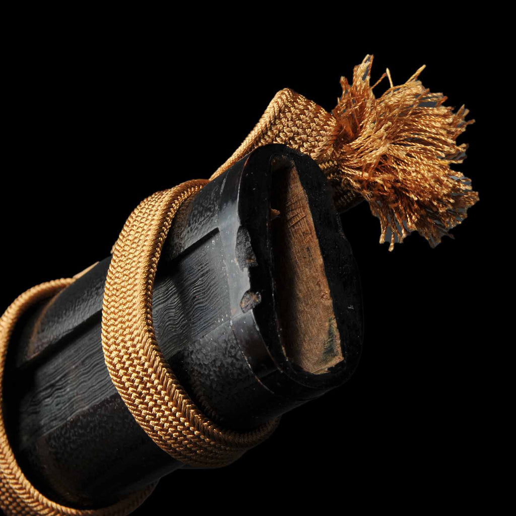 - Koshirae: Black leather wrapped Tsuka with Kuro-ishime lacquered Saya