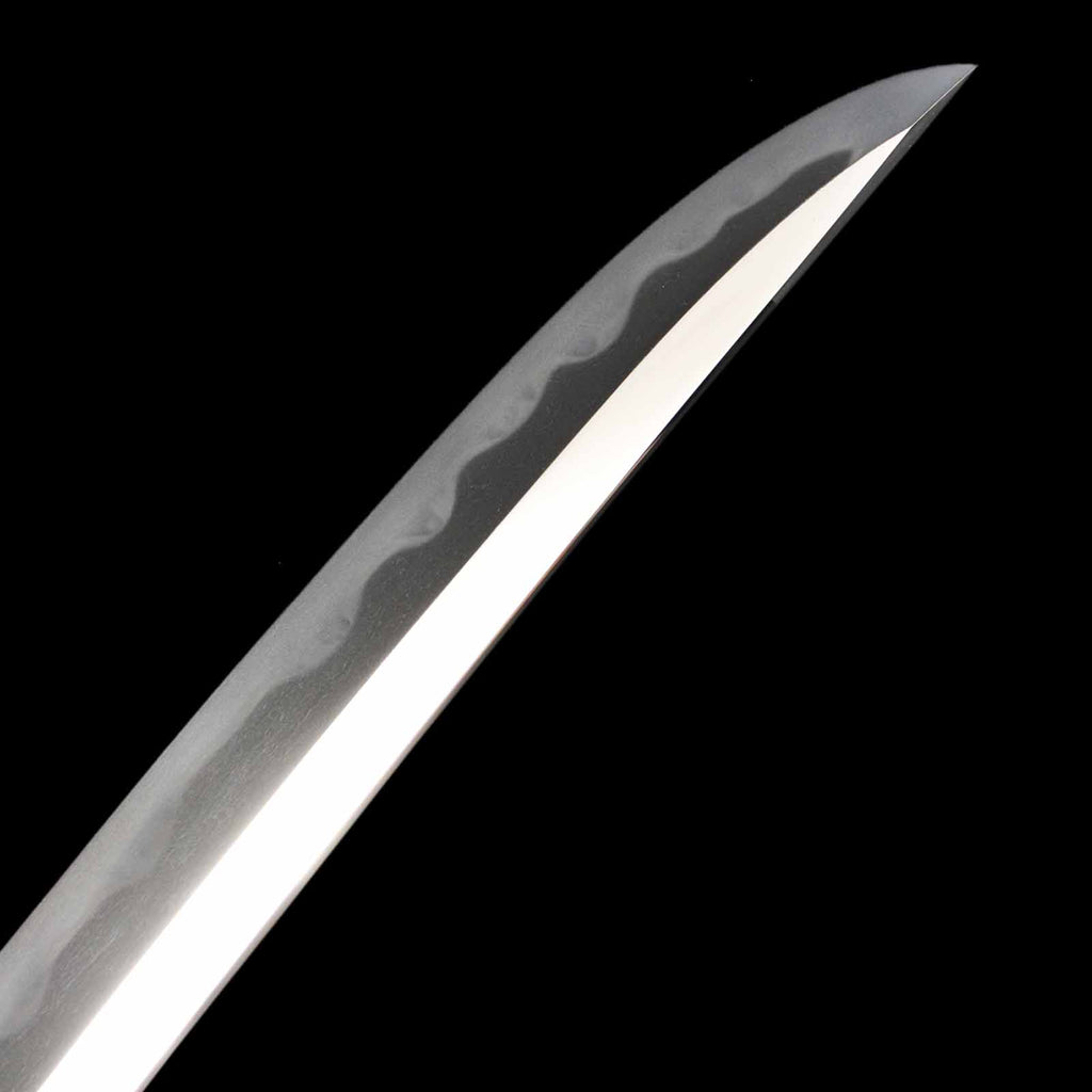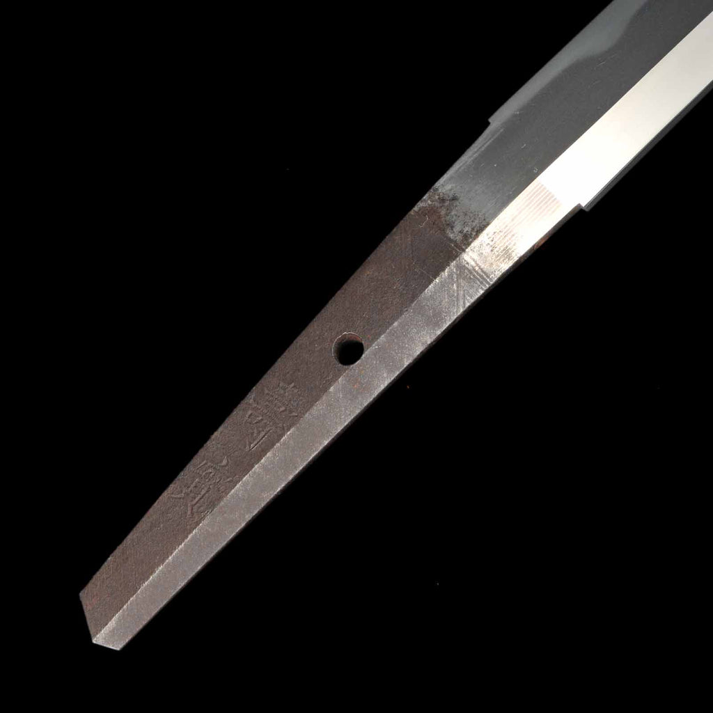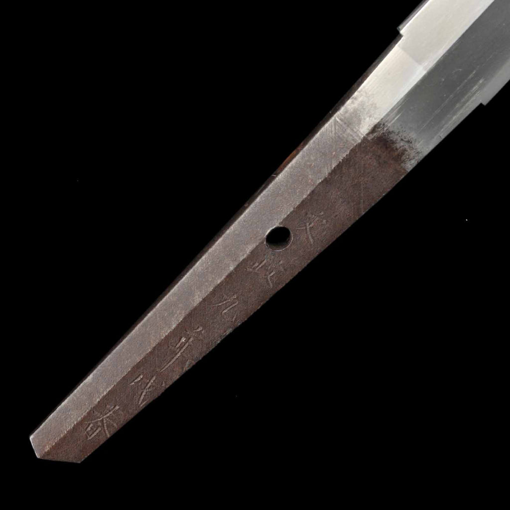 This dagger is in extremely good condition, with no flaws, rust, or chips. The shape of the blade is a shobu-zukuri and has a beautiful appearance reminiscent of an iris leaf. The hada is well packed with itame hada and abundant yubashiri. Hamon has a well-packed nie with choji overlapping the gunome. The nakago is engraved with EToshizane Eon the front and “Ninth year of Bunsei period, from fall to winter Eon the back. The ninth year of the Bunsei period corresponds to the year 1826 in the Western calendar.