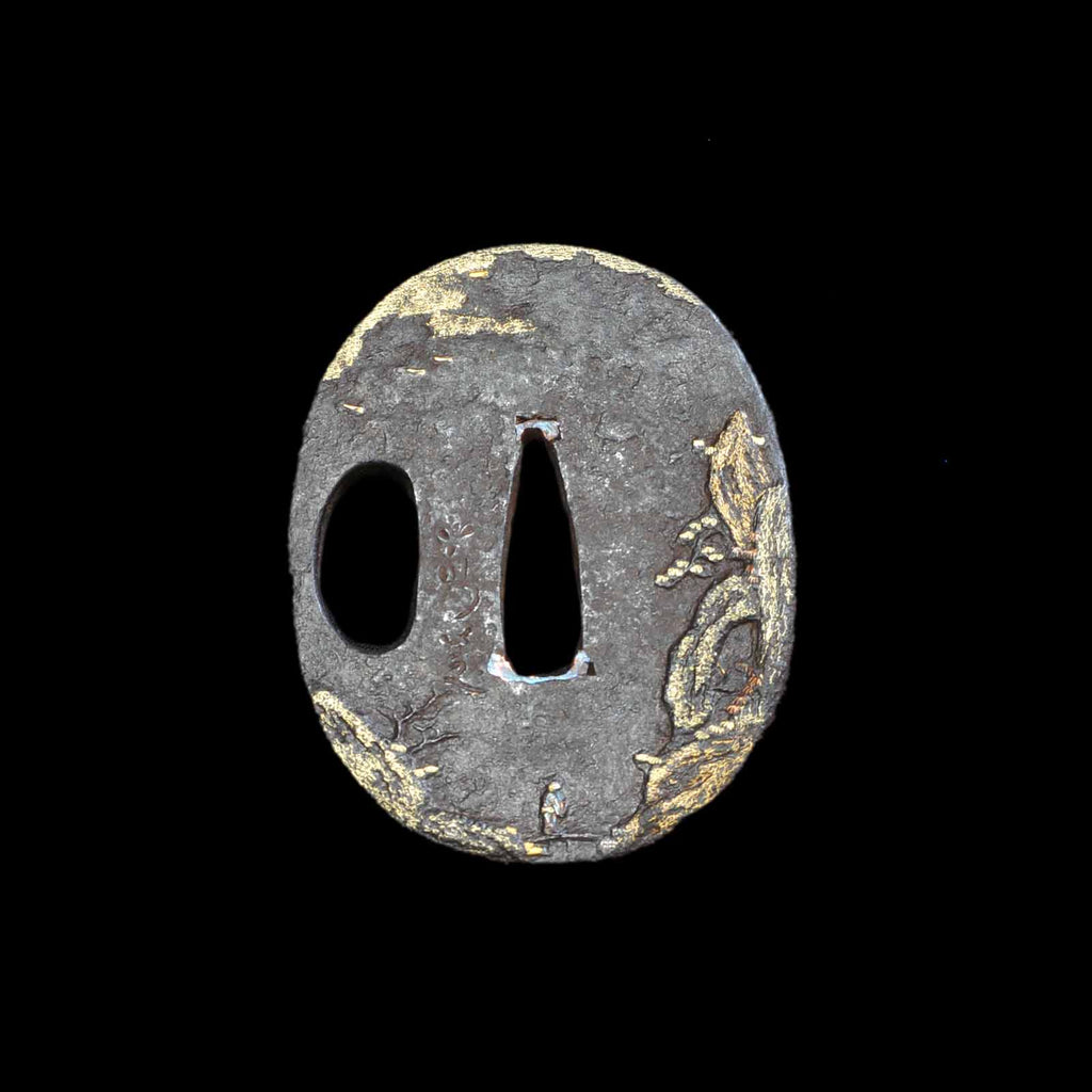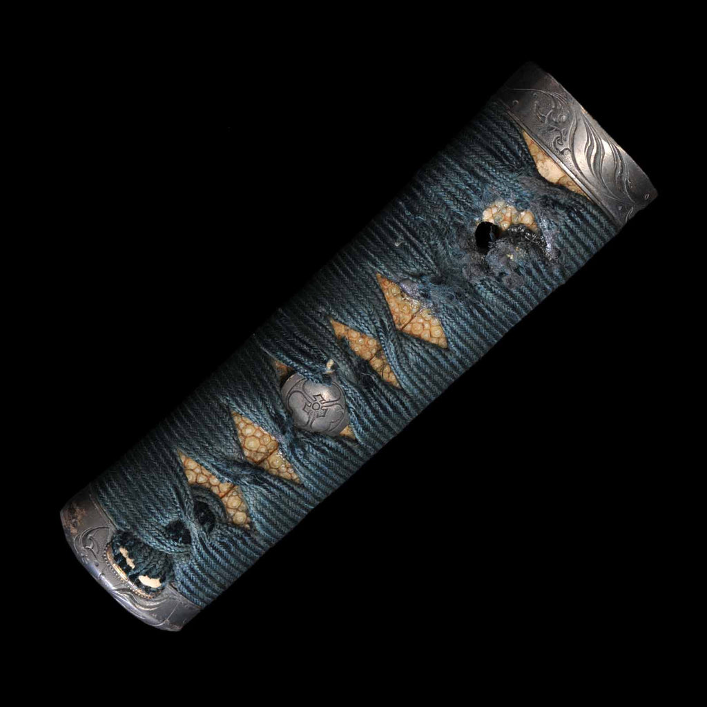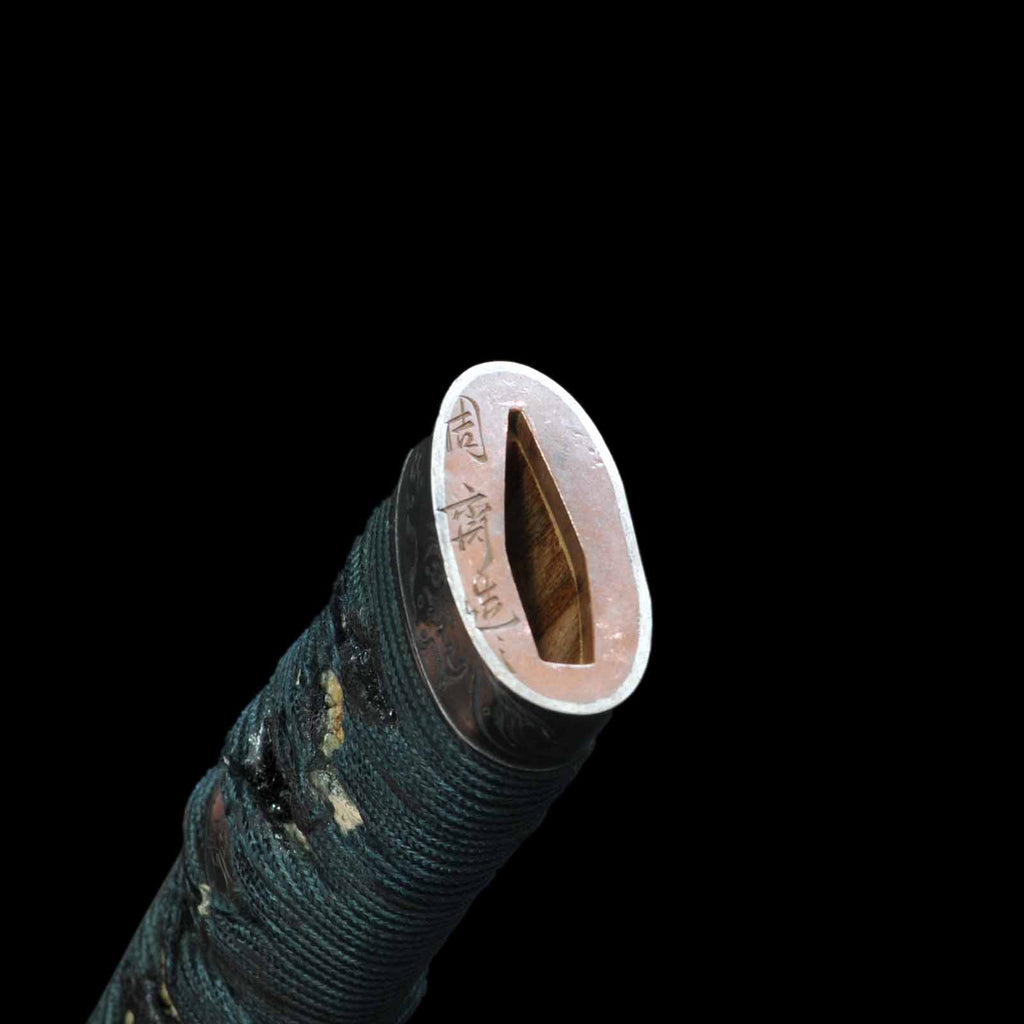 This dagger is in extremely good condition, with no flaws, rust, or chips. The shape of the blade is a shobu-zukuri and has a beautiful appearance reminiscent of an iris leaf. The hada is well packed with itame hada and abundant yubashiri. Hamon has a well-packed nie with choji overlapping the gunome. The nakago is engraved with EToshizane Eon the front and “Ninth year of Bunsei period, from fall to winter Eon the back. The ninth year of the Bunsei period corresponds to the year 1826 in the Western calendar.