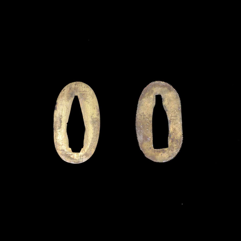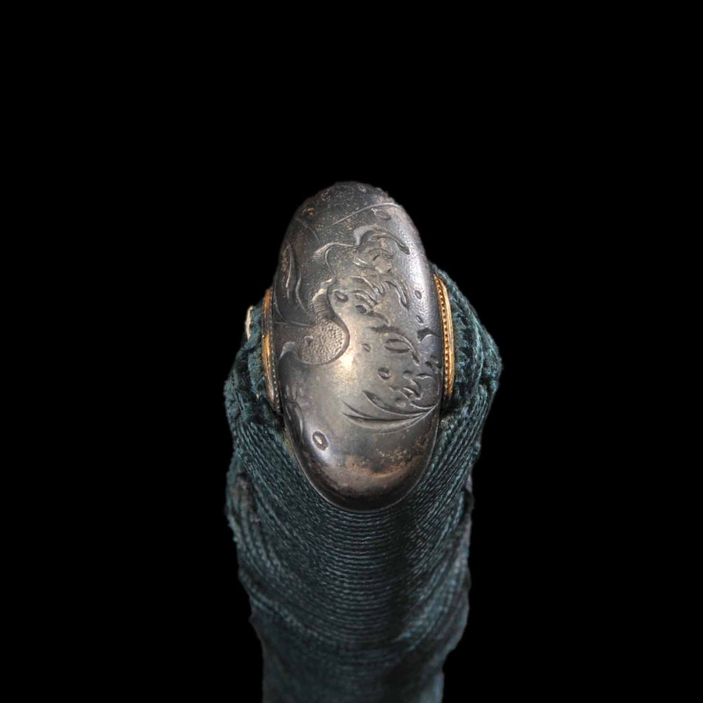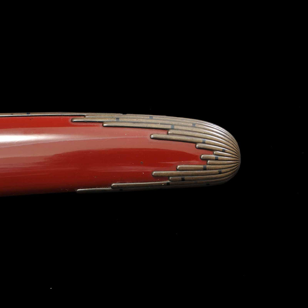 This dagger is also equipped with tanto koshirae. It features a tapered scabbard butt reminiscent of the Toppei Koshirae, and is very distinctive with multiple linear fittings reminiscent of bamboo neatly attached. The kaelizuno is attached to a vermilion lacquered scabbard. The metal fittings are of the period, and the silk tsukite is partially worn.