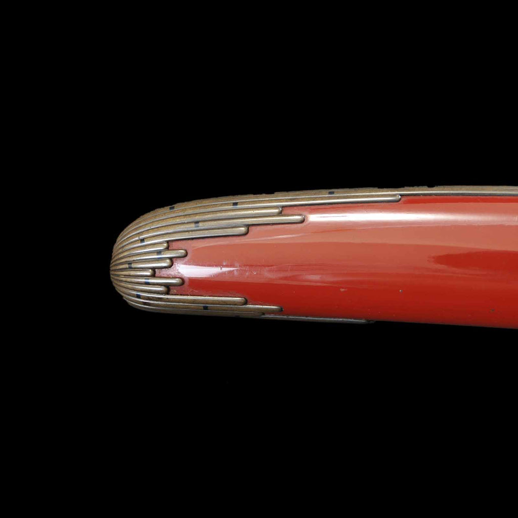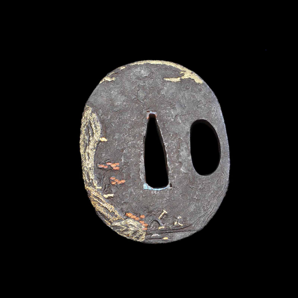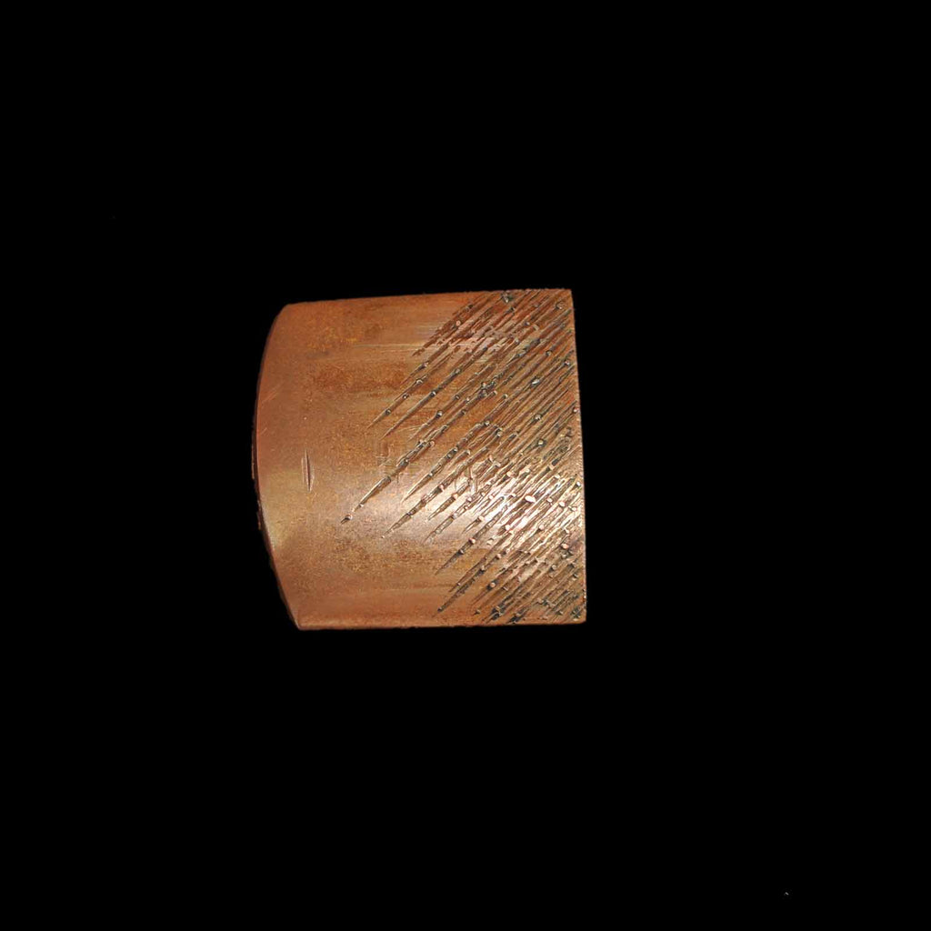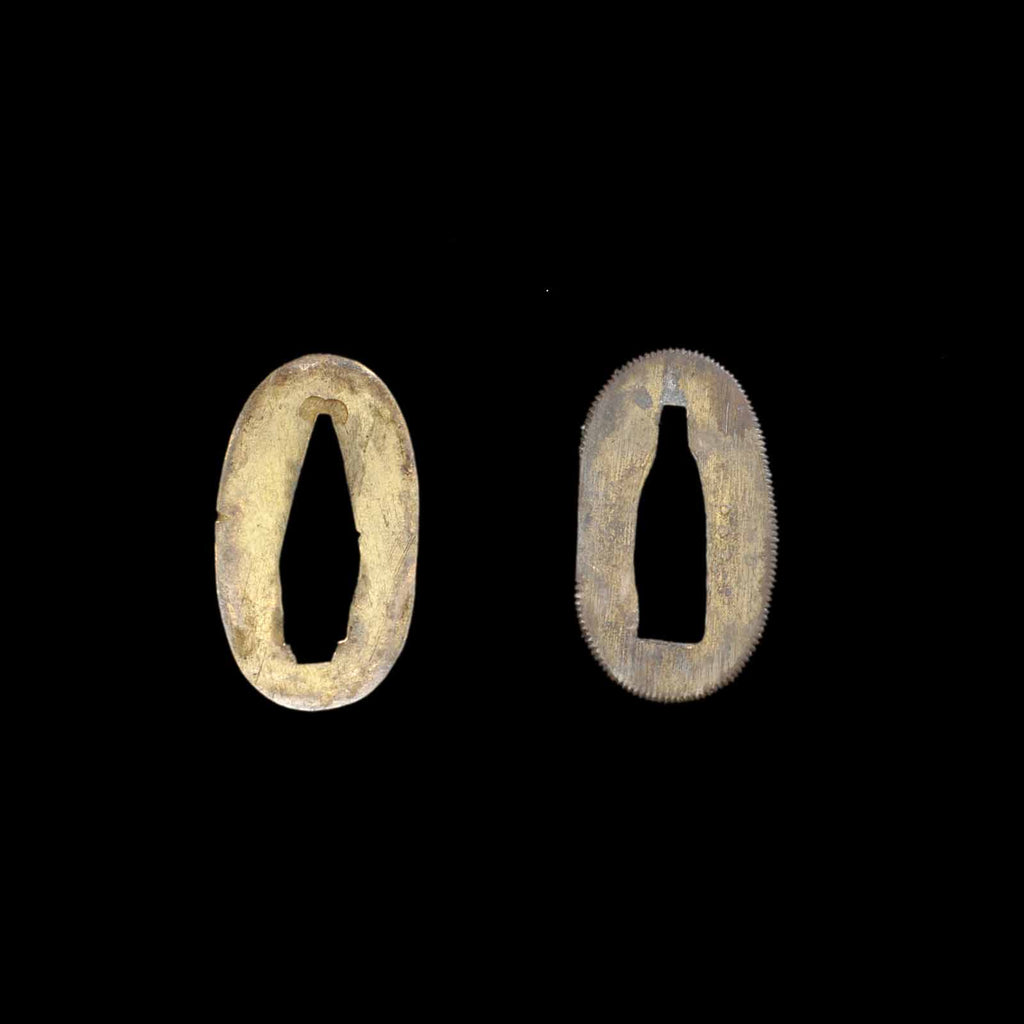 This dagger is also equipped with tanto koshirae. It features a tapered scabbard butt reminiscent of the Toppei Koshirae, and is very distinctive with multiple linear fittings reminiscent of bamboo neatly attached. The kaelizuno is attached to a vermilion lacquered scabbard. The metal fittings are of the period, and the silk tsukite is partially worn.