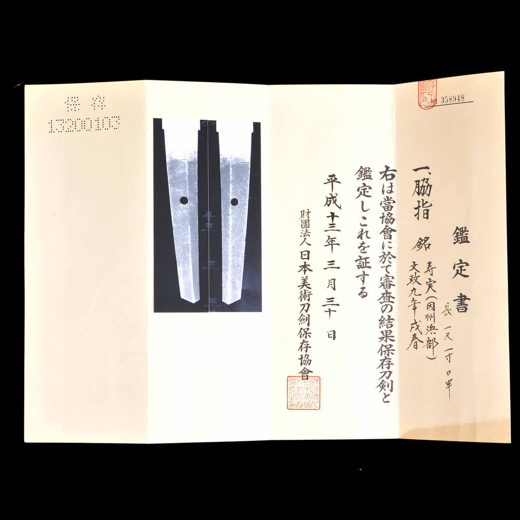 The Society for Preservation of Japanese Art Swords and Swords issued a certificate of authenticity for this sword in 2001, after a hozon appraisal, as it is highly worthy of preservation for posterity.