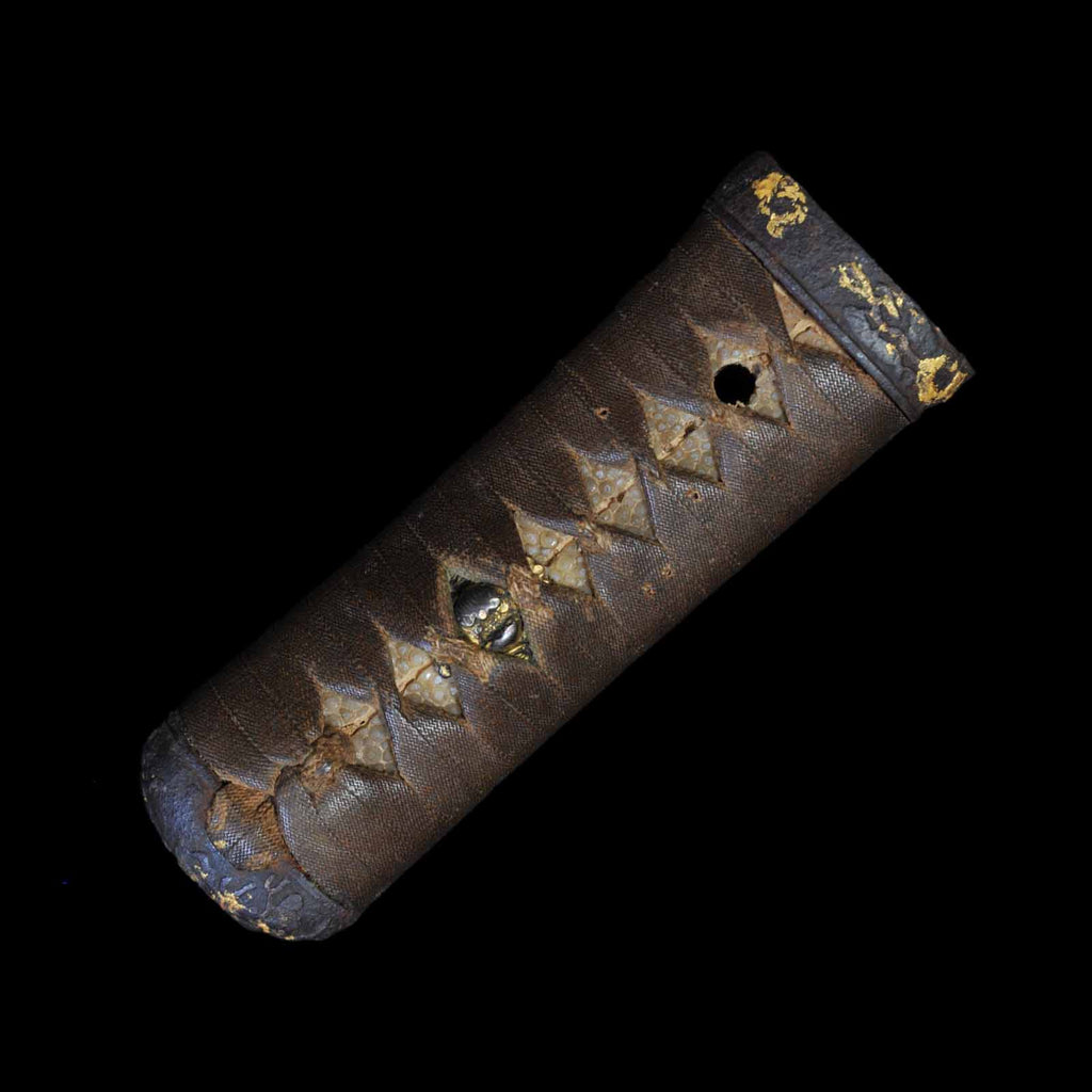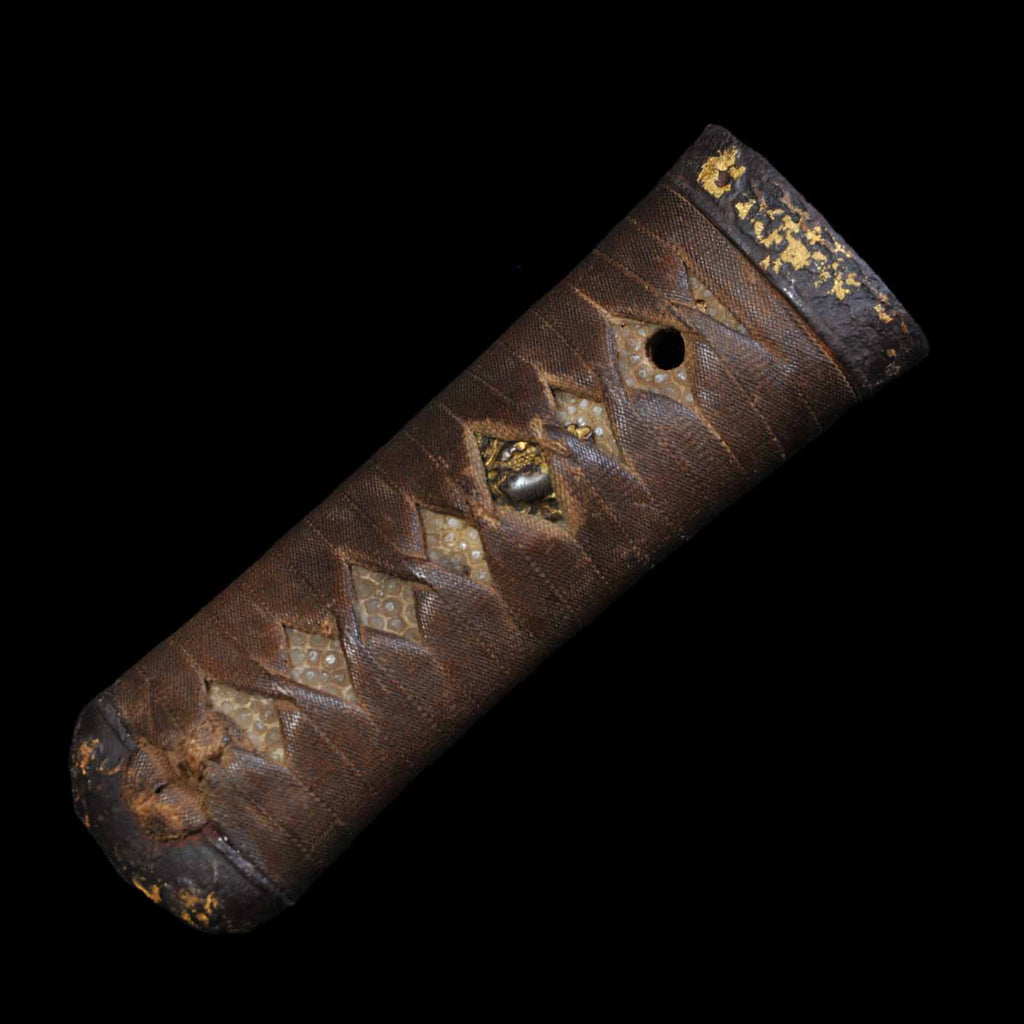 Itame's hada is well packed and mokume is mixed in places, and yubashiri is evident. Ko-gunome hamon has hataraki such as sunagashi and kinsen. Boshi is returned in the form of nakamaru. The koshirae uses parts from those days. The cord of tsukaito is a little worn around the menuki. The scabbard is very textured with a design based on thunderclouds. Unfortunately, the kozuka is missing.