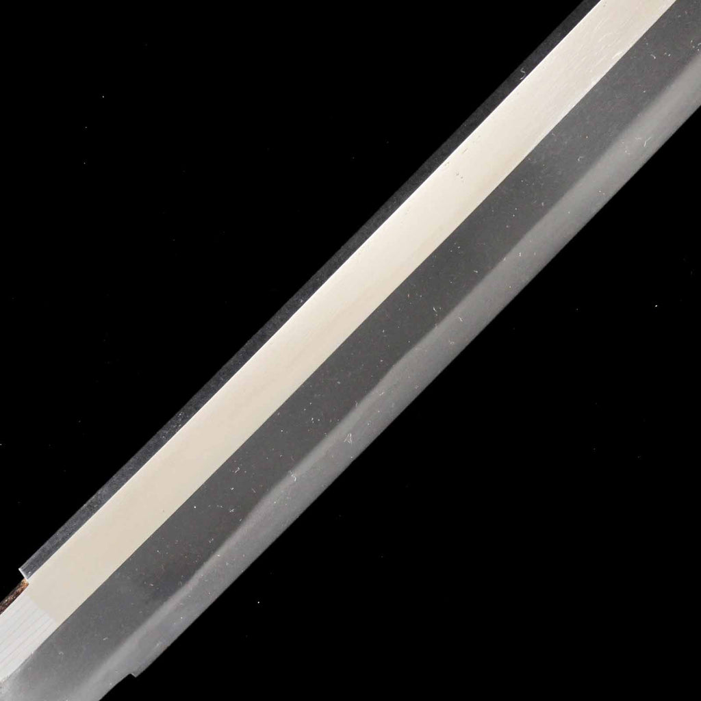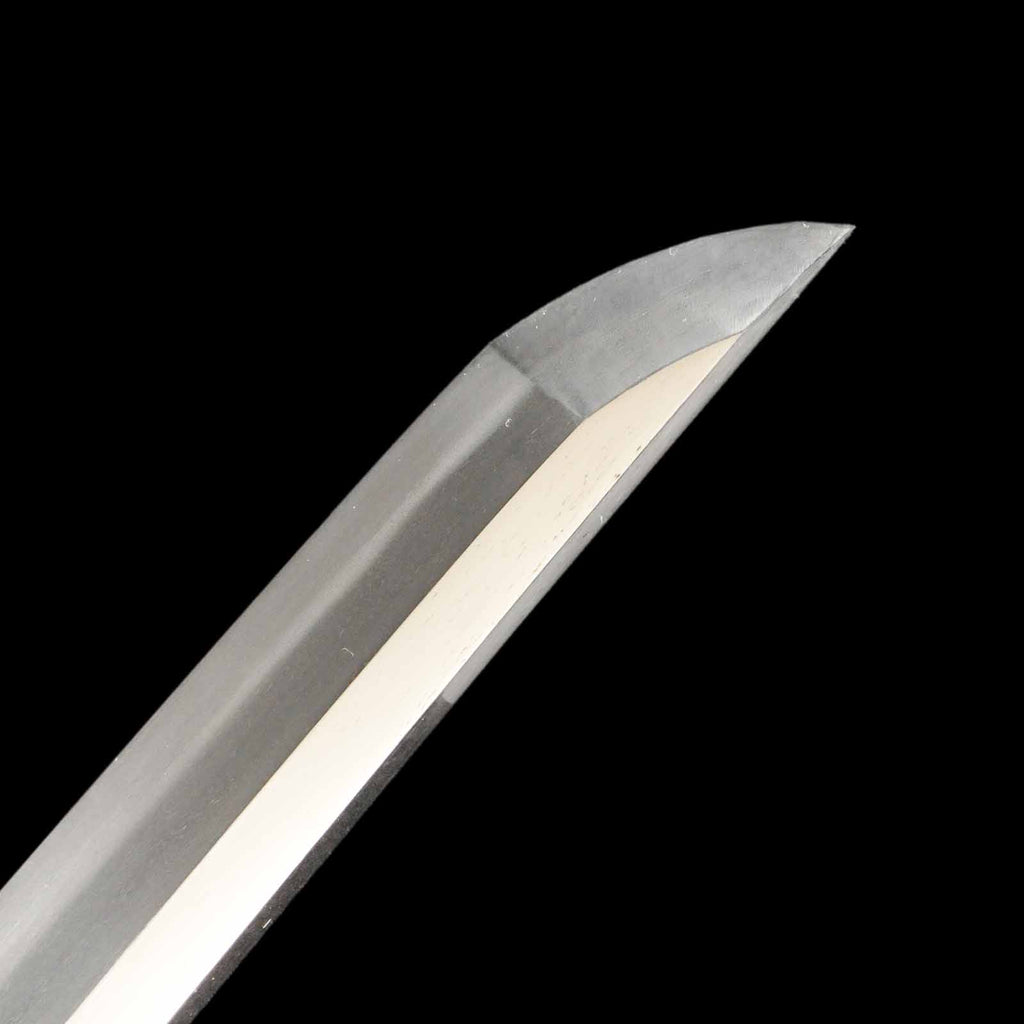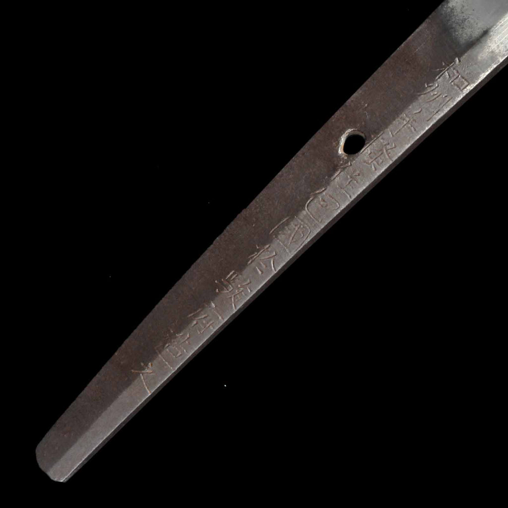 This is a wonderful Japanese sword made by the master Kanekuni during the Shinto period. It is in excellent condition, with no chips, flaws, dents, or other defects, and is in near perfect condition. As is typical of early Shinto swords, there is not much curvature and the hada is well packed and itame, and the chikei is clearly visible. The hamon is a relaxed notare-like suguha, with a konie attached to the edge of the ha, which sometimes doubles or frayed. The inside of the ha is bright and brilliant with a deep nioi. On the nakago is engraved the words, "Kanekuni of Tegai, Wakayama Prefecture, made this in Sumpu.