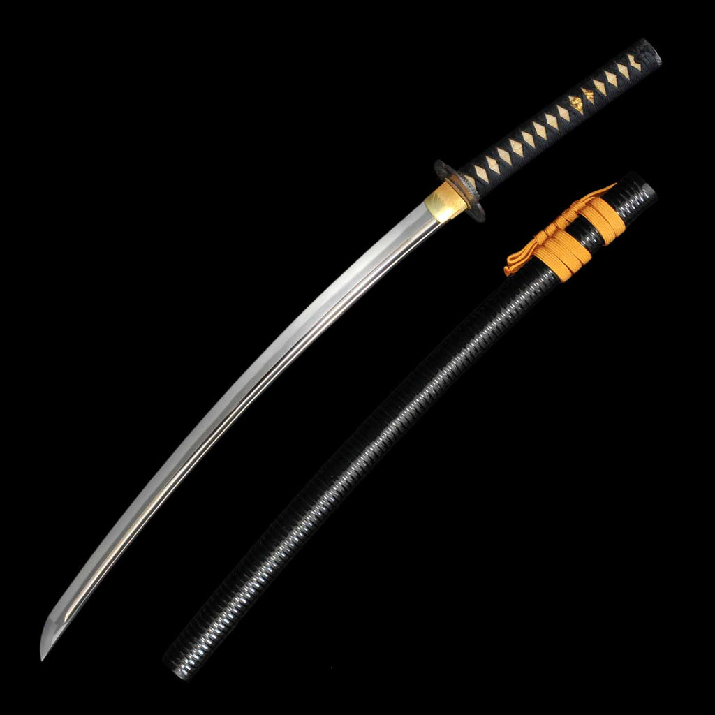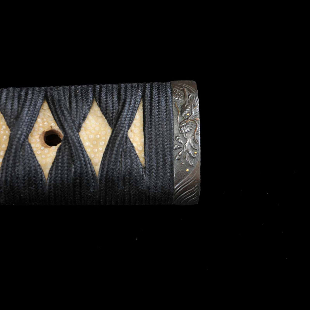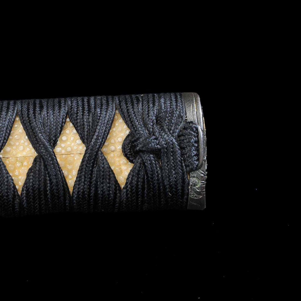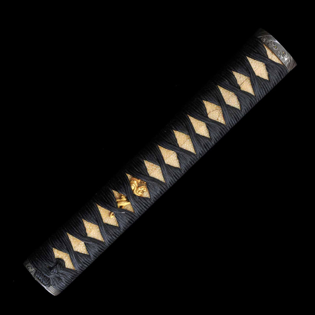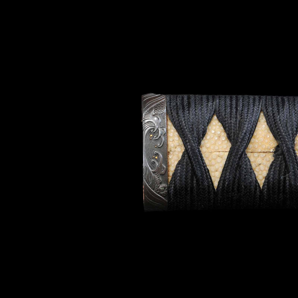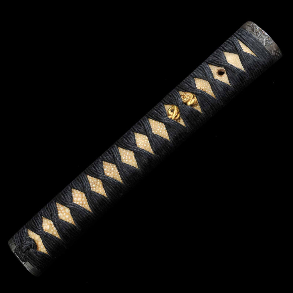 - Koshirae: Black silk Tsuka wrapping with Sendan Kizami Kuro-ro Saya, Shirasaya