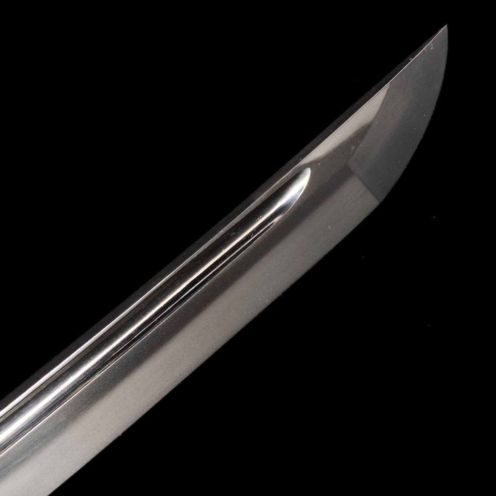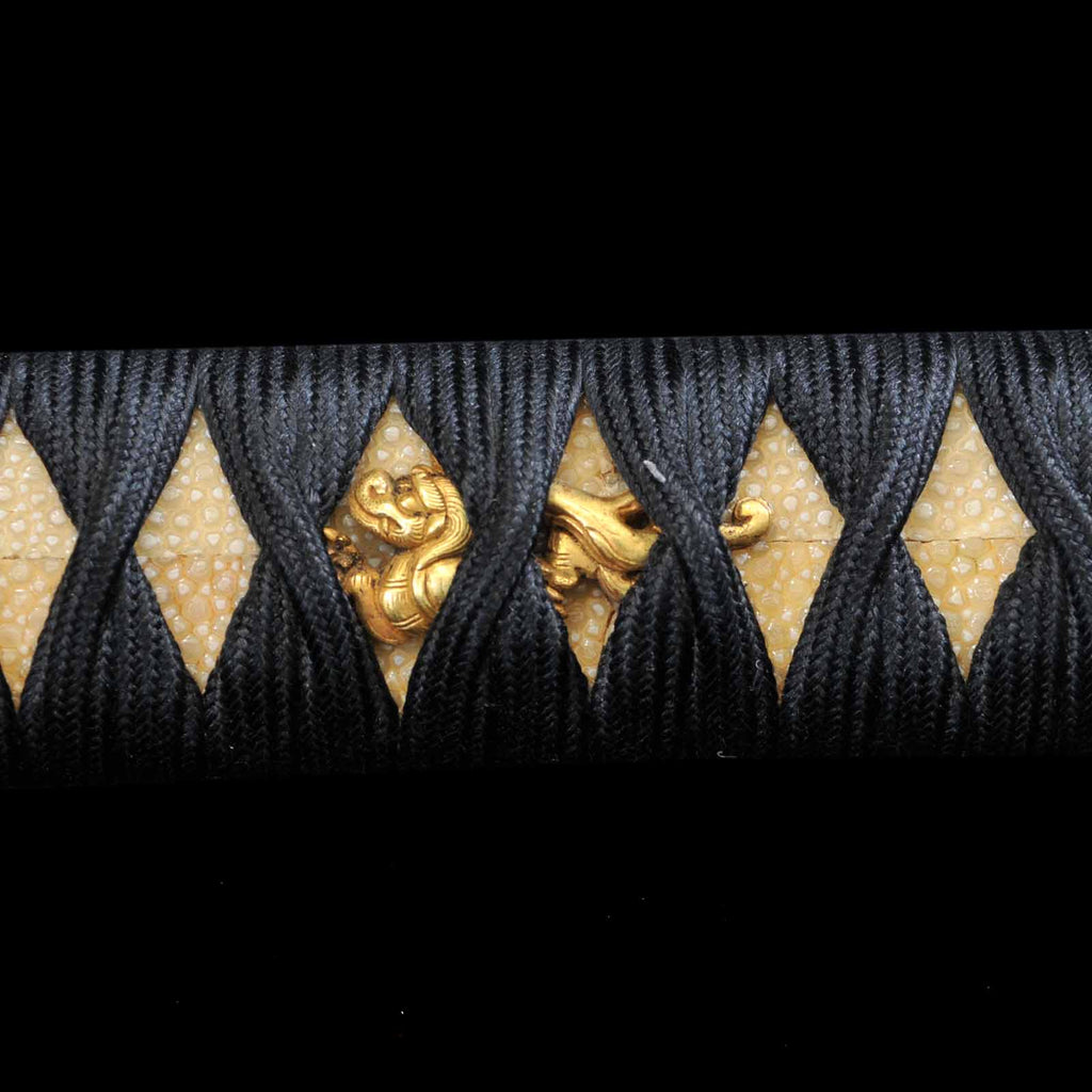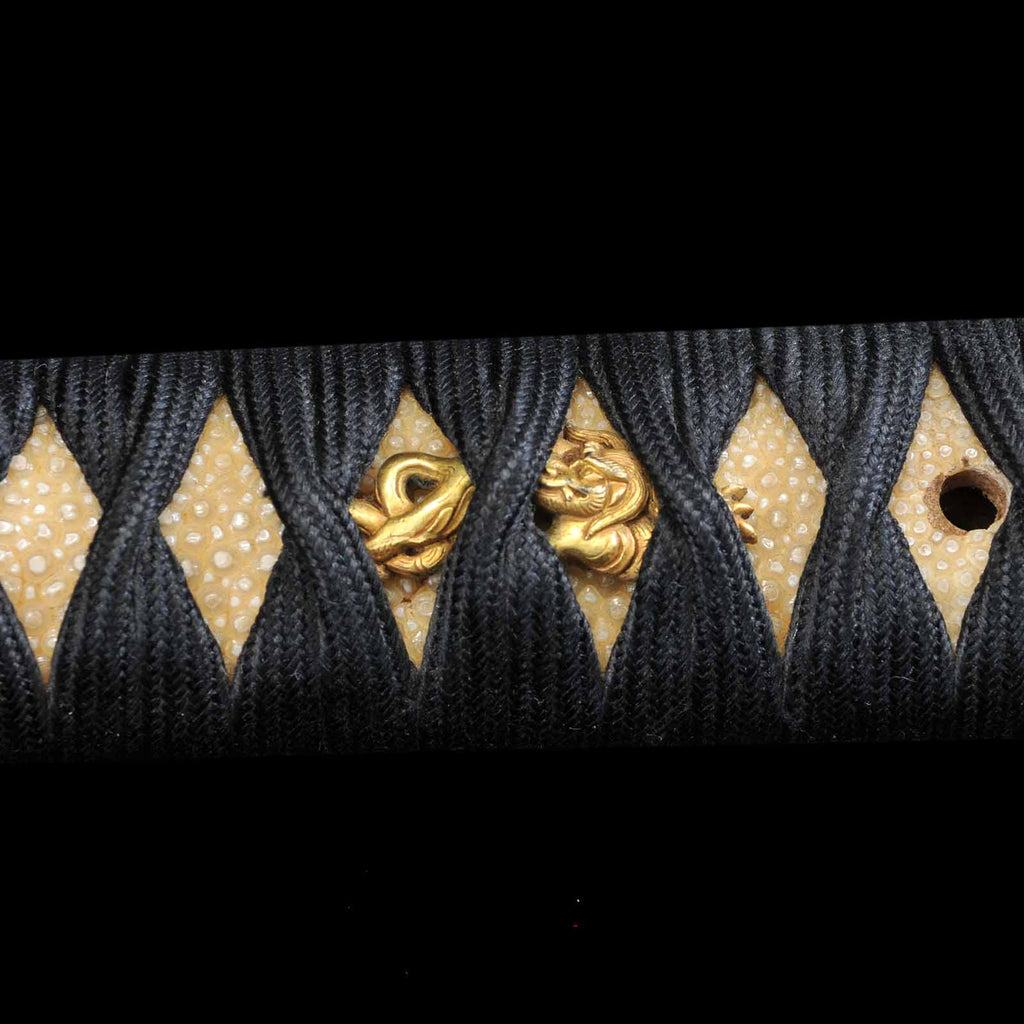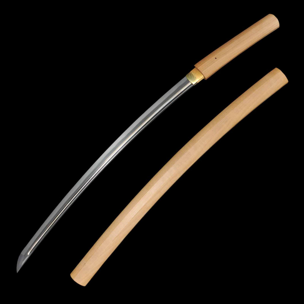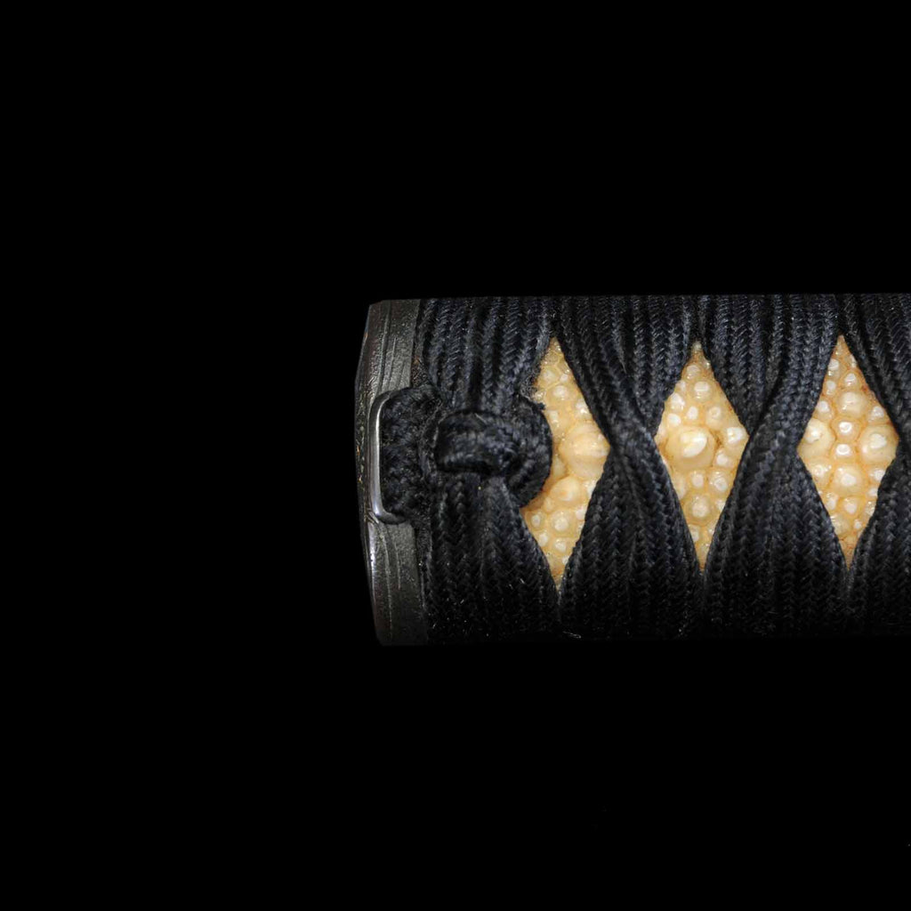- Koshirae: Black silk Tsuka wrapping with Sendan Kizami Kuro-ro Saya, Shirasaya
