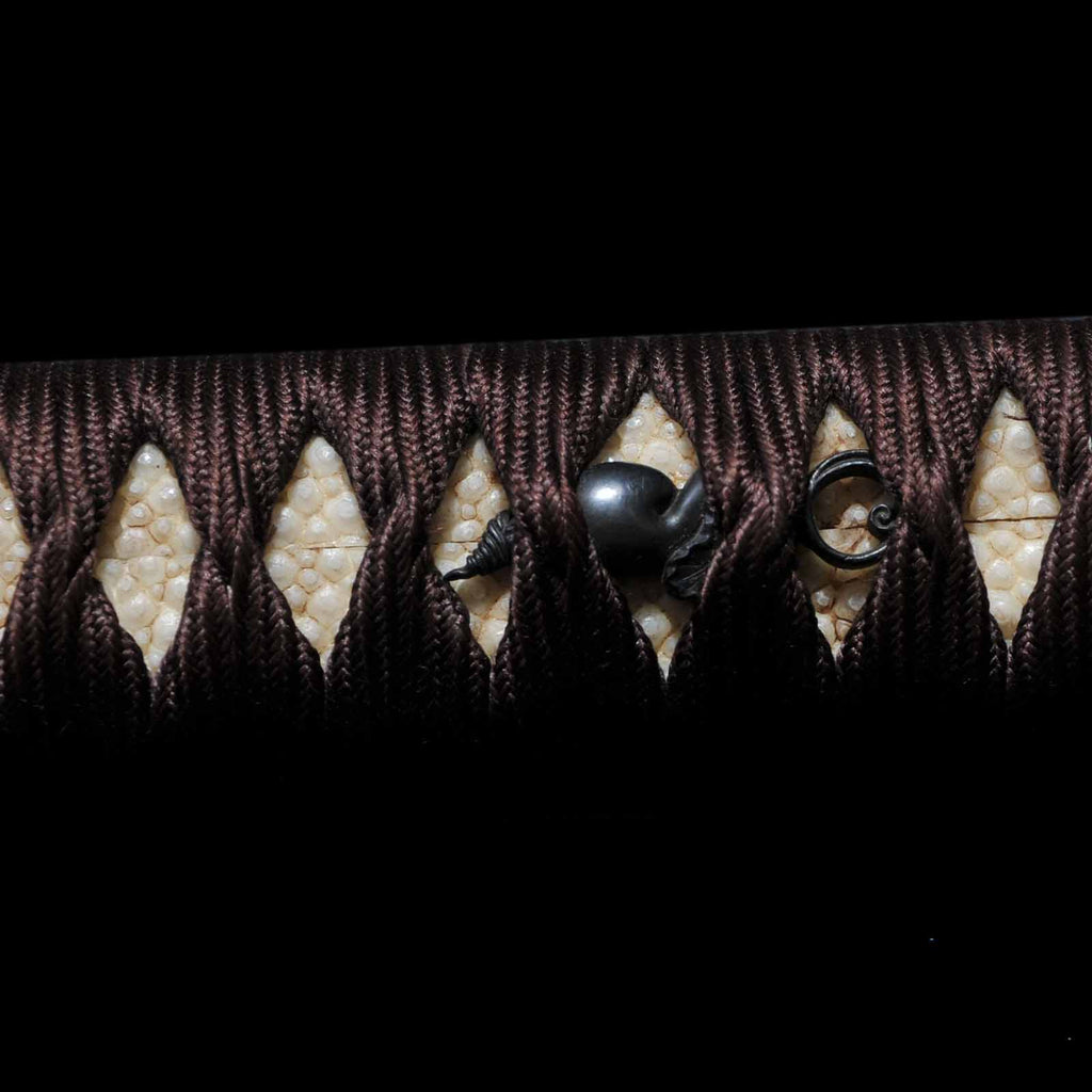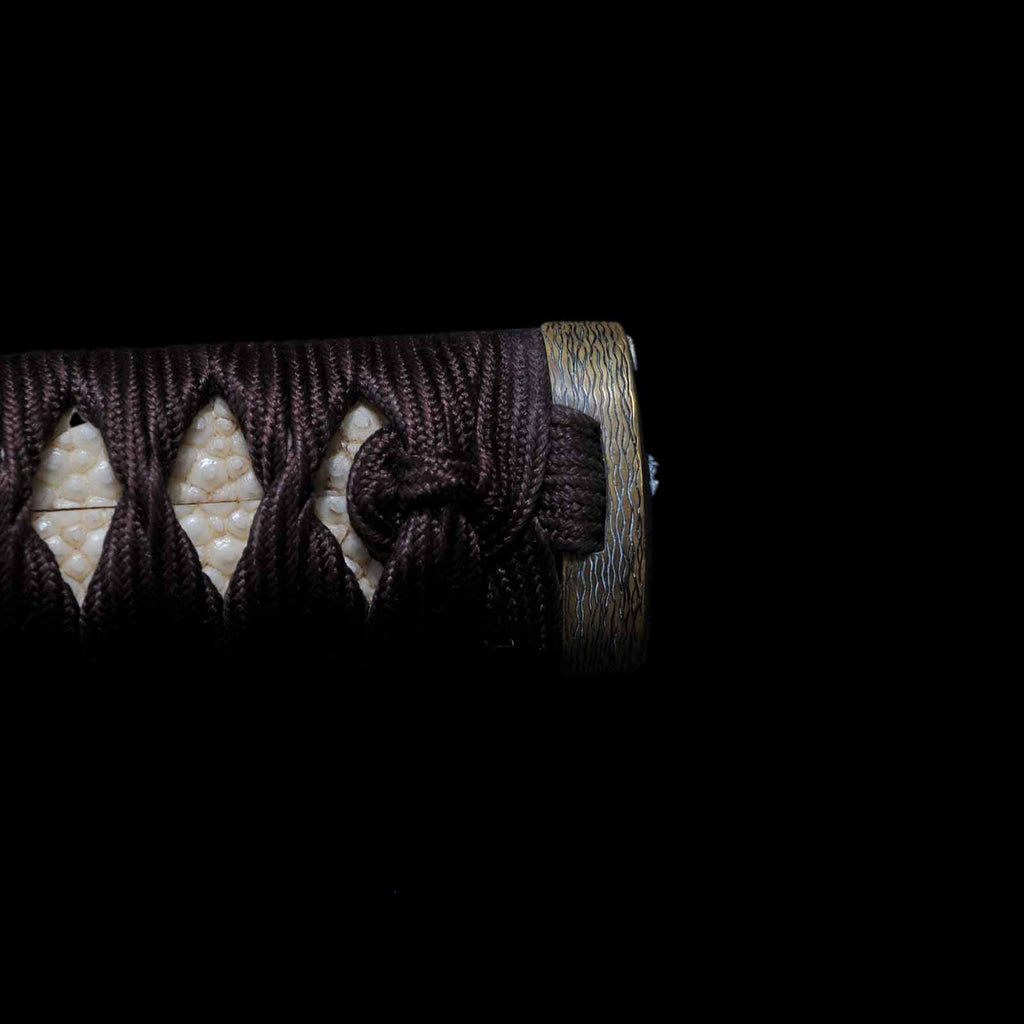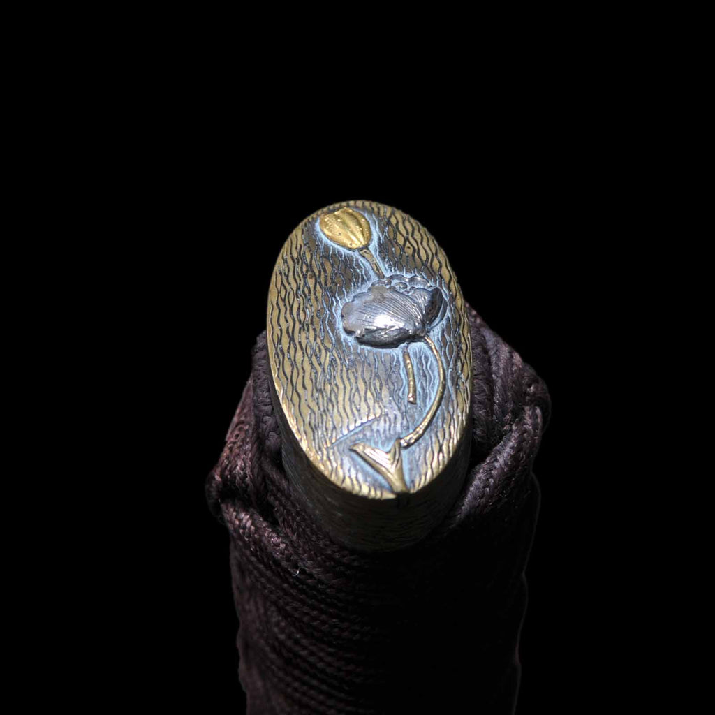 The tsuba, menuki, and fuchikashira metal fittings used on the koshirae are also from that period, giving it the flavor of the samurai period. The name "Yasumasa" is engraved on the fuchigane. On the habaki is engraved the mark Aoi.